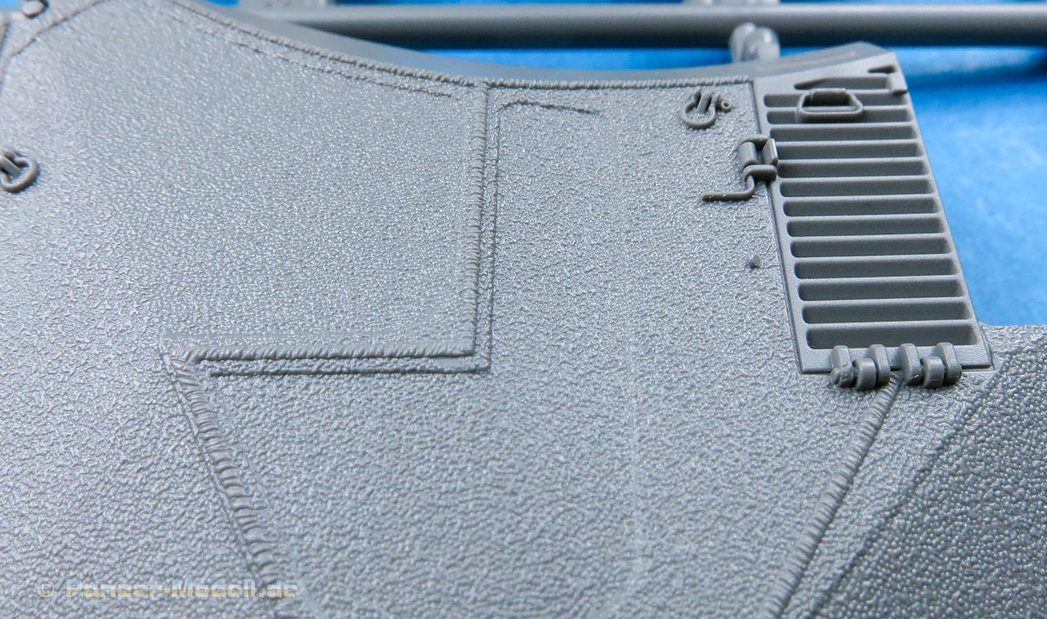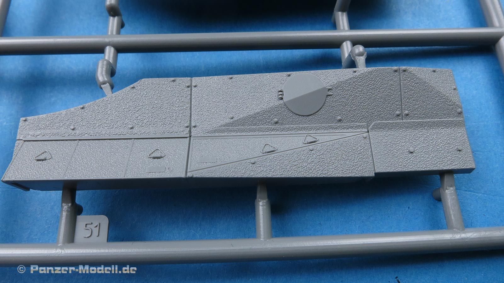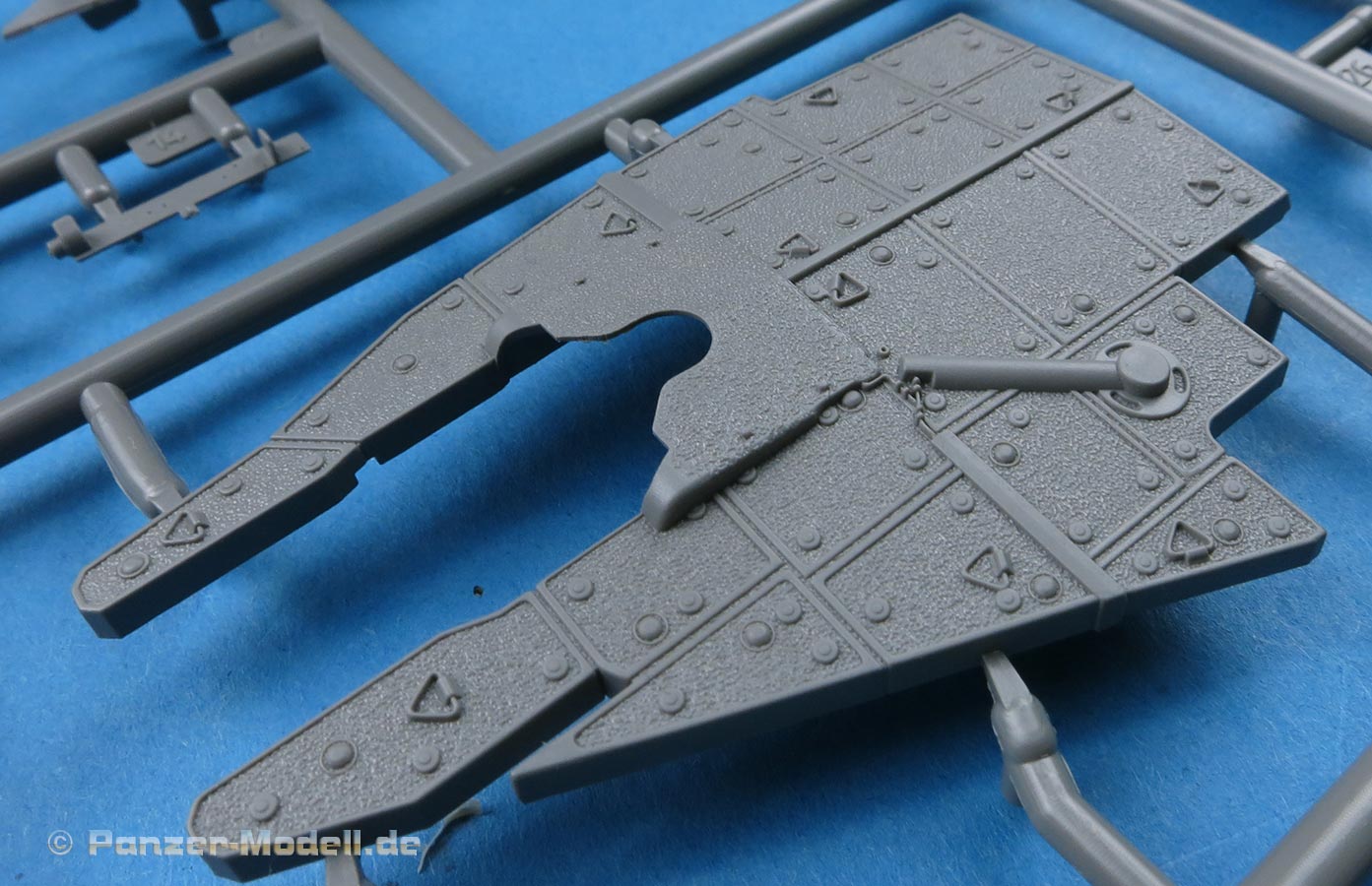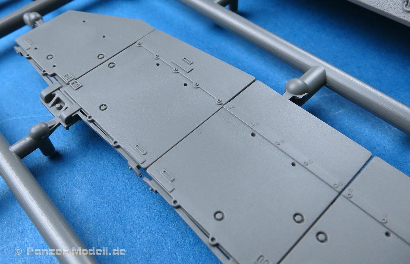 Bei Durchsicht der Teile und Spritzlinge muss sogar ich mal begeistert in die Hände klatschen, denn was ich hier sehe ist Spritzgusskunst auf allerhöchstem Niveau. Feinste, saubere und scharfe Details, keine Auswerfermarken oder Sinkstellen und ein Blick auf die Teile mit der Antirutschbeschichtung ist sensationell - sehr realistisch und das beste was ich auf Bausätzen von Merkava je gesehen habe.