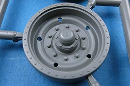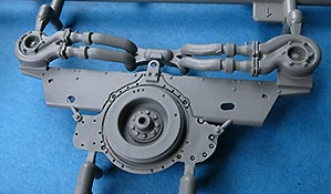 Und das setzt sich aus je drei Radstationen zusammen mit hervorragenden Laufrollen, die aus Außen und Innenrad zu Doppellaufrollen mit innenliegendem Polycap zusammengesetzt werden und außen mit einem Ring die Hinterschneidung der Felge dargestellt wird. Die Details der Felge sind sehr schön. Gleiches läßt sich auch über Treib- und Leitrad sagen, die fein, sauber und detailliert gespritzt sind.