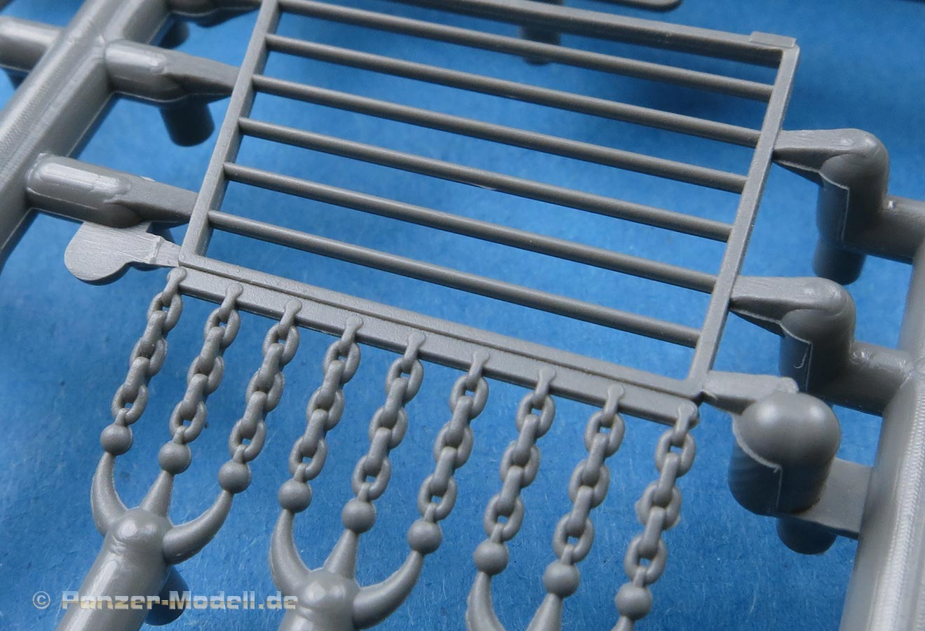 Der richtige Hinkucker sind allerdings die Turmstaukörbe mit dem Gerüst aus Spritzguss, Gittermaterial aus PE und den markanten Ball and Chain Elementen als Spritzgussteile. Sicher sieht dies aus echten Kettchen noch detaillierter aus, aber das was hier geboten wird, spart eine Menge Arbeit und macht für das Auge bereits eine Menge her.