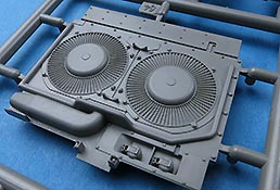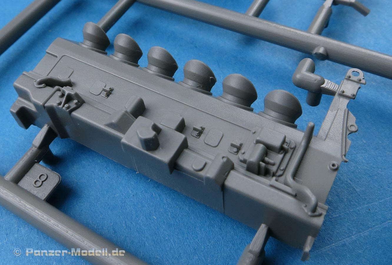 Die Unterwanne umfasst die komplette Inneneinrichtung - und das wirklich umfassend und wahnsinnig toll detailliert. Und Border hat hier nicht nach Kampf- und Fahrerraum aufgehört - nein auch der komplette Motorraum ist mit allem Zipp und Zapp enthalten. Auch hier erfeuen uns alle Details, vom Motorblock und Abgassystem, Lüfter und Getriebe.