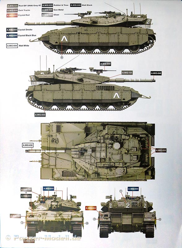 Am Ende der Anleitung gibt es zwei Seiten Farb-Renderings zur Bemaung der Innenräume und folgend zwei Seiten mit zwei Farbprofilen zu Bemalung und Markierung des Fahrzeugs.