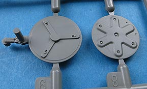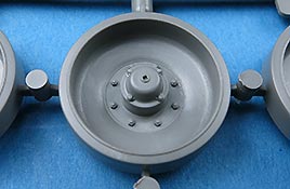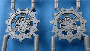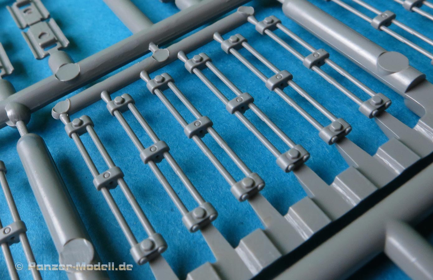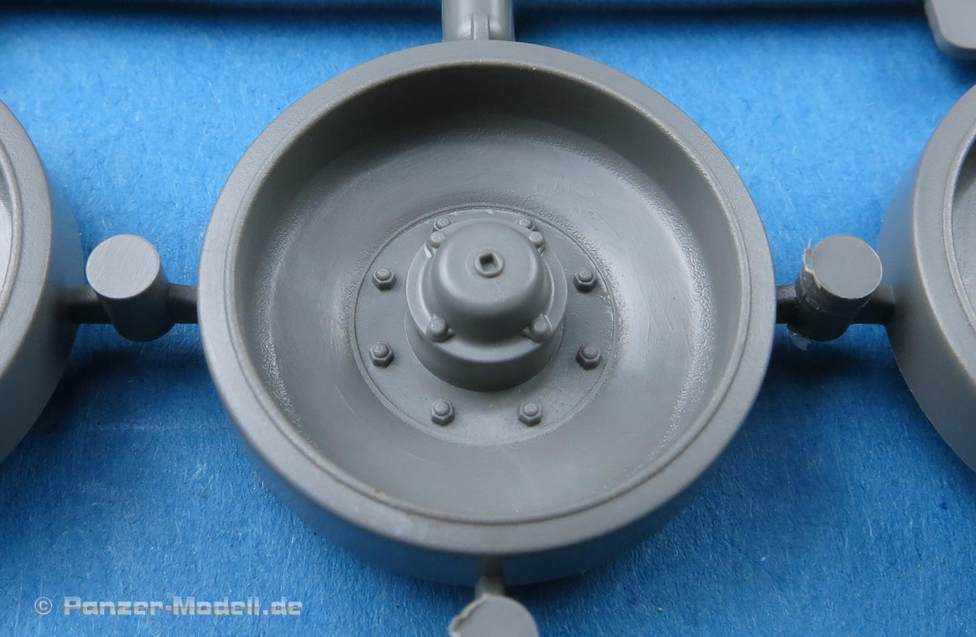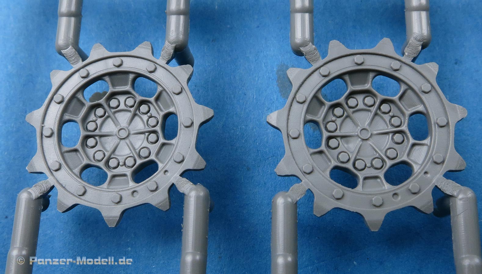 Die Laufrollen setzen sich wie gewohnt zweiteilig aus Innen- und Aussenlaufrolle zusammen, wobei ein Polycap mit eingebaut wird und damit die Laufrollen drehbar gelagert. Die Darstellung der Laufrollen ist sehr gelungen, mit toller Wölbung der Felgen, feine und scharfe Details der Radmuttern und ein sauber abgesetzter Laufrollengummirand. Interessanterweise hat Border auch neue Treib- und Leiträder spendiert.