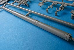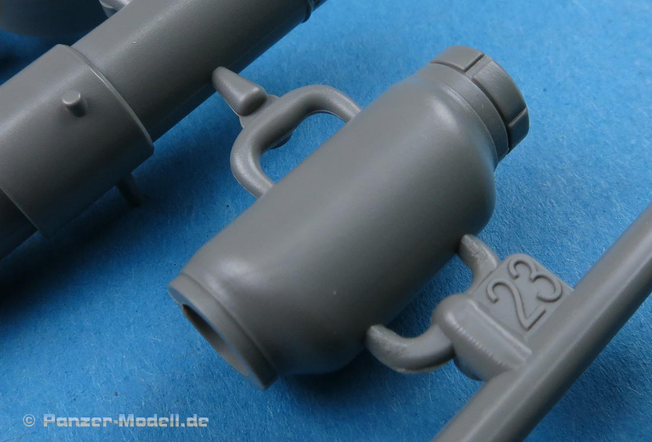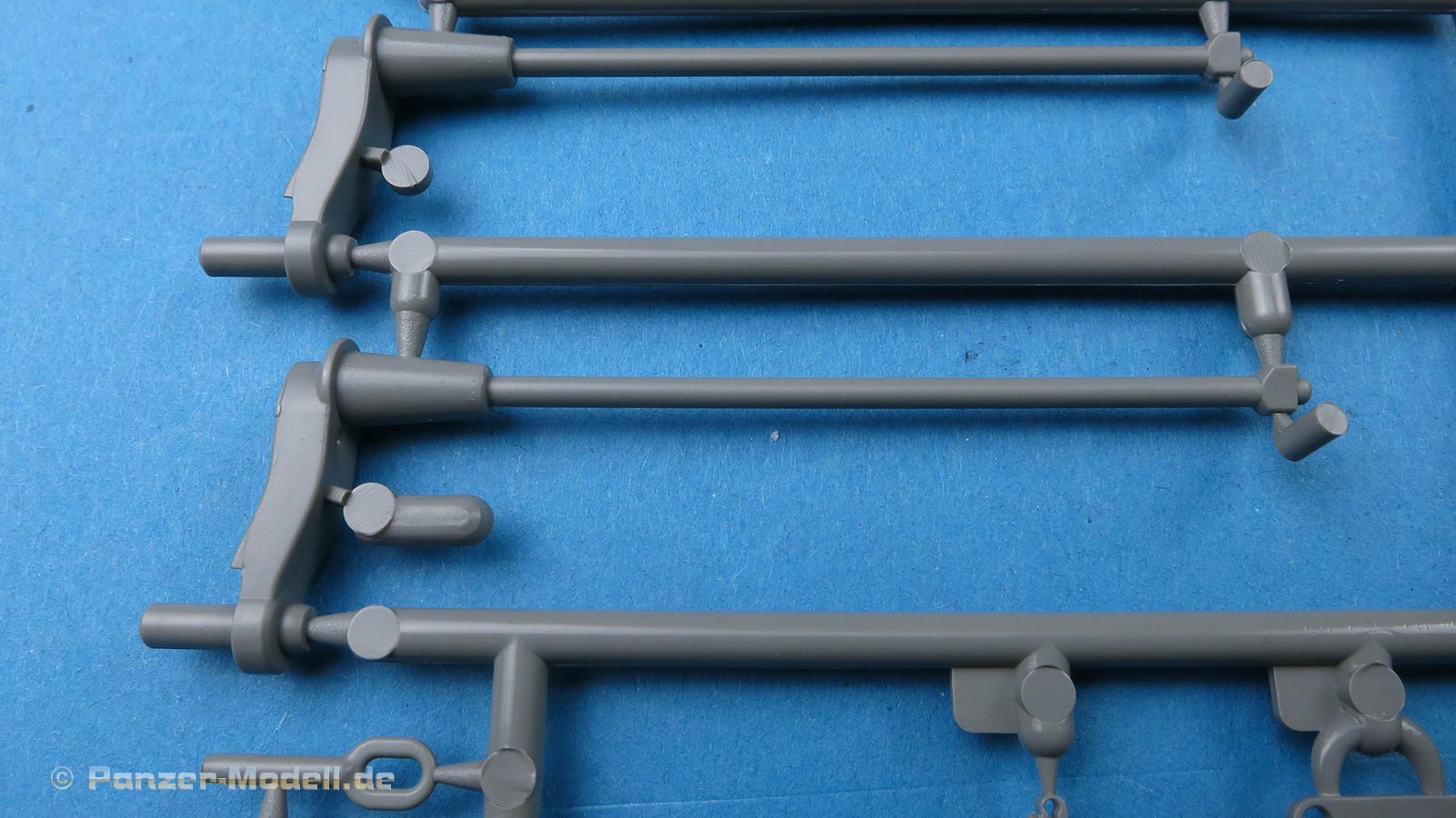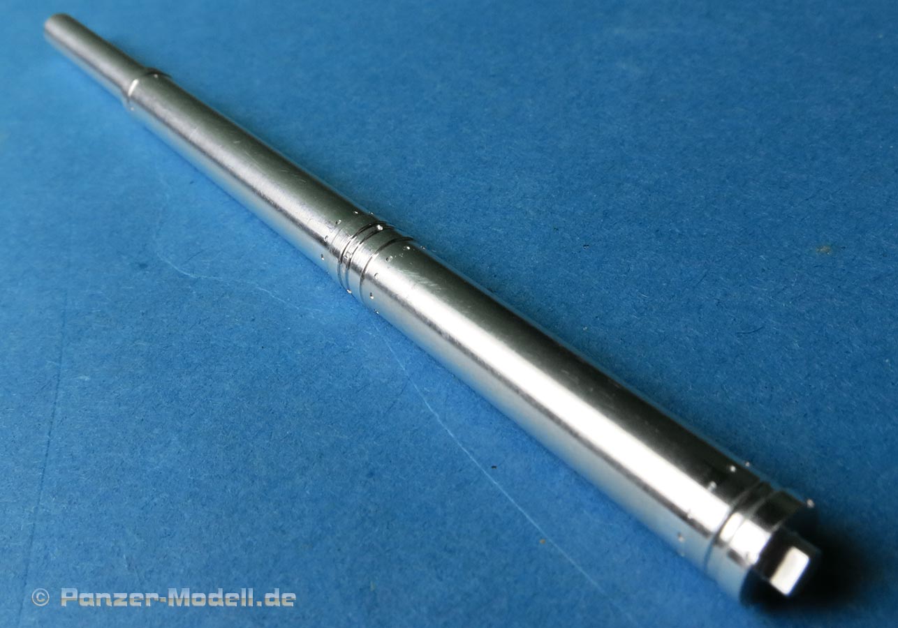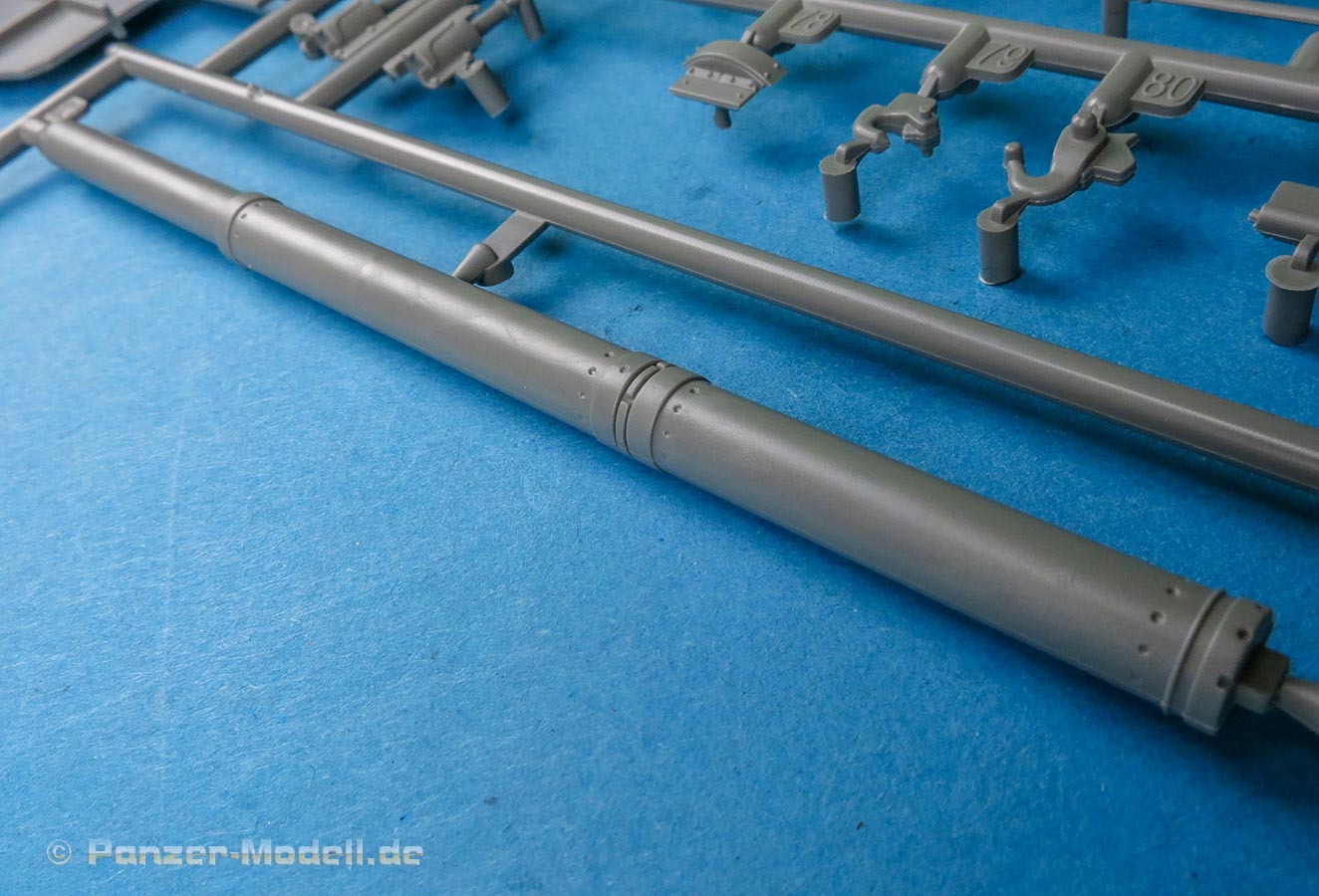 Das Kanonenrohr liegt als lange L/55 per se einteilig vor, heisst also keine Halbteile - dafür mehrteilig in der Länge, d.h. das Rohr setzt sich aus Basis, Rauchabsauger, Rohrhauptstück und Mündung zusammen - das sieht sehr gut aus! Zusätzlich hat Border dem Bausatz für das lange Hauptstück vorn ein entsprechendes Metallrohr beigelegt das wirklich gut aussieht. Ob dieses nur in der Erstauflage beiliegt, ist nicht ganz klar, ist aber wahrscheinlich. Der RTauchabsauger ist per se einteilig echt schön gemacht.