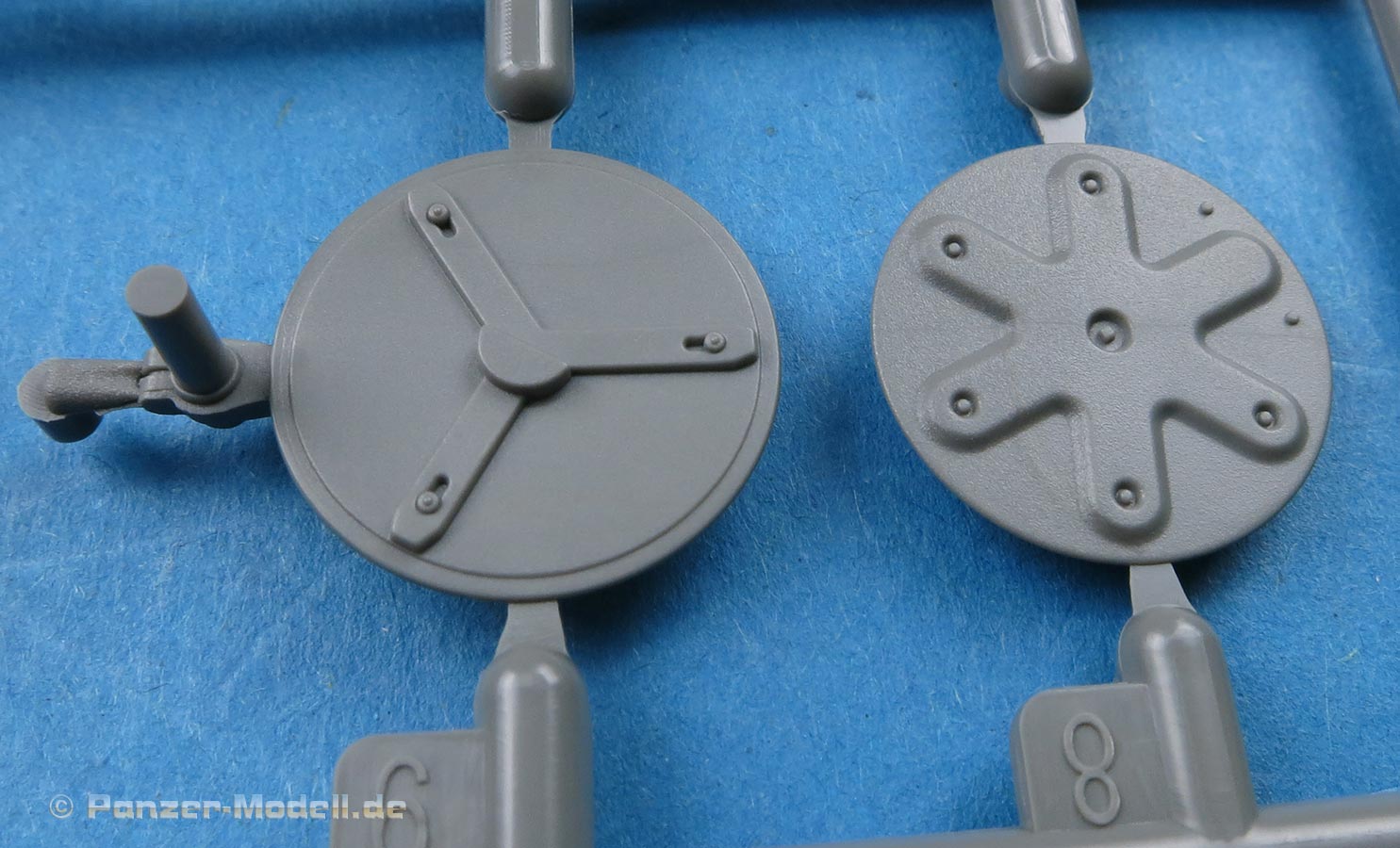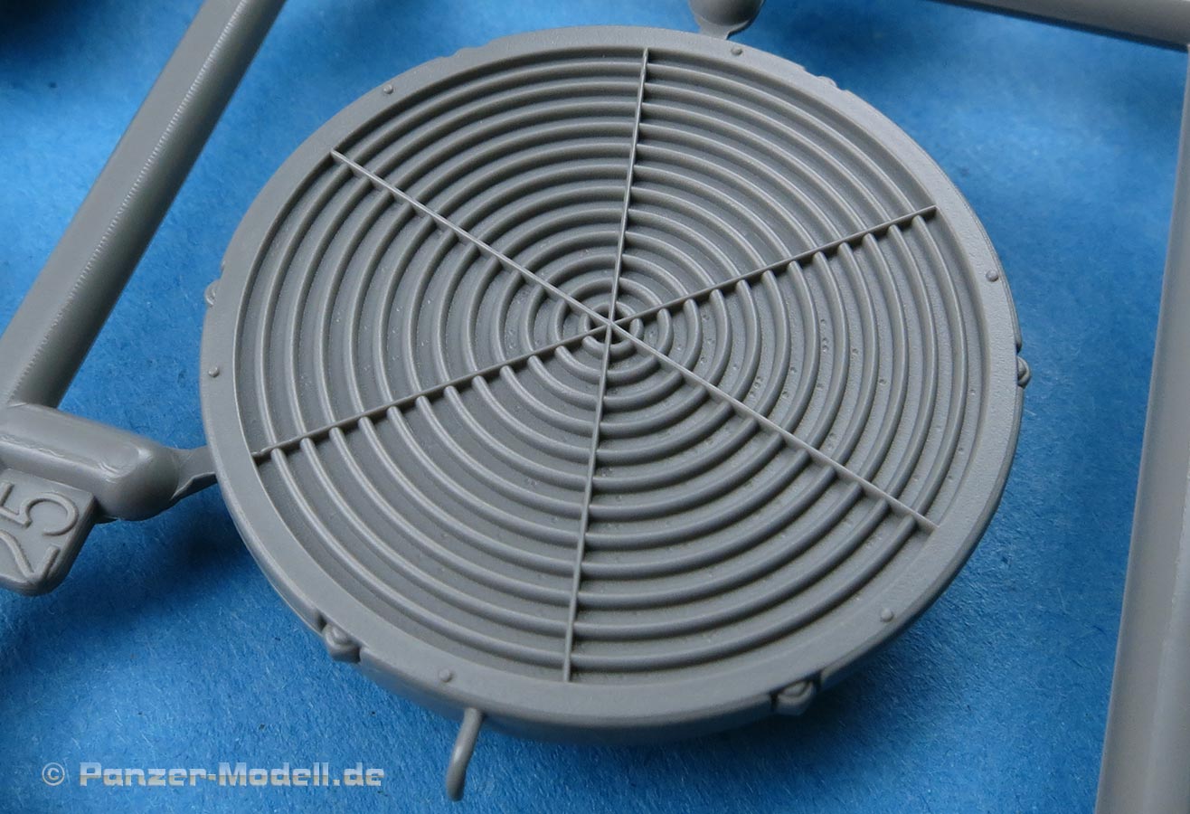 Die Turmstaukörbe bestehen aus dem Rohrgerüst aus Plastik und die Lochbleche aus wirklich ultrafein geätzem PE Blech - ehrlich, diese Lochung ist derartig fein, dass ich erst dachte es ist undurchbrochen, aber bei genauem hinsehen zeigen sich die superfeinen Löcher, die maßstäblich sehr realistisch sind. Bei den PE Blechen für die neuen Staukisten mittig müsste theoretisch ein Quadrat massiv sein auf dem das eiserne Kreuz angebracht wurd, aber das hat Border mit einem entsprechenden Decal kaschiert.