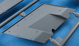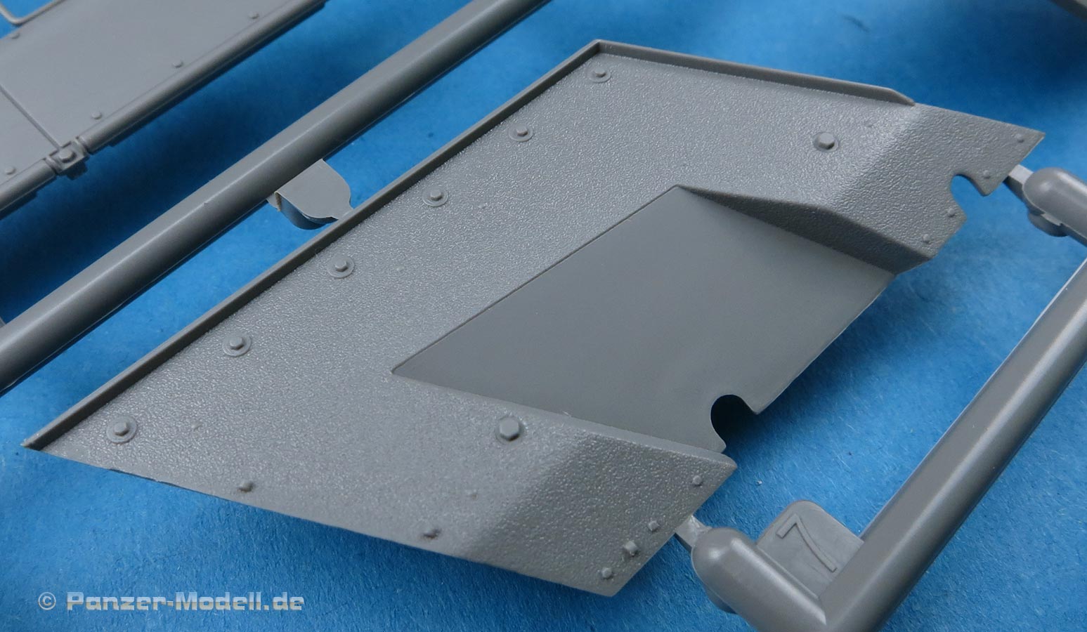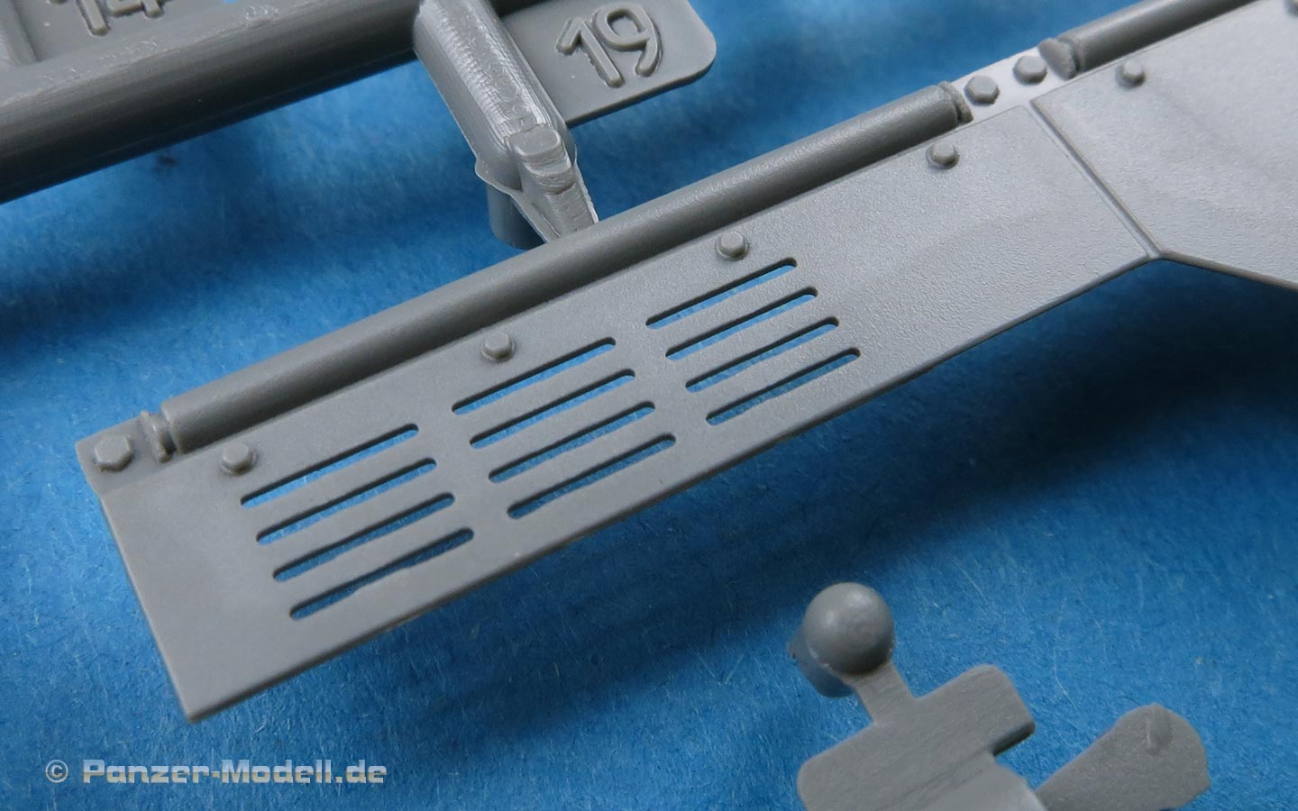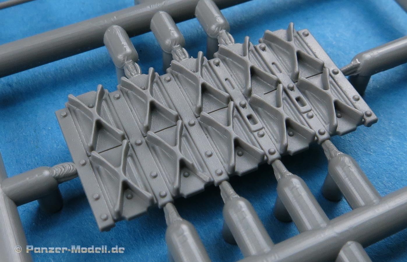Die beiliegenden Schürzen sind für den vorderen Bereich mehrteilig und theoretisch abklappbar und für den hinteren Bereich einteilig und in der Darstellung von der dritten Generation mit aufgesetzten Schraubenköpfen und hier mit den typischen Schlitzen die beim A7V eingeführt wurden.
