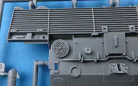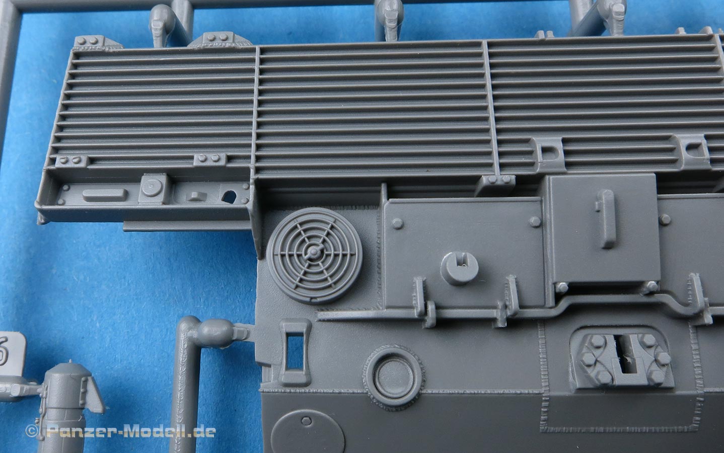 Auch hier feine Details, dass das Modellbauerherz hüpft. Vor allem die Antirutschpads sind sehr sehr gut gemacht mit einer feinen und wahnsinnig realistischen rauen Struktur! Natürlich sind die spezifischen Details des A7V mit Dargestellt - die Erhöhung auf der rechten Seite des Motordecks für die APU, die mit der A7 Version kam, dazu die extra Lüfter links mittig für die Klimaanlage der Wanne und natürlich die Zusatzpanzerplatte am Bug.