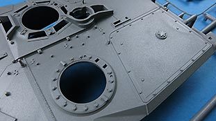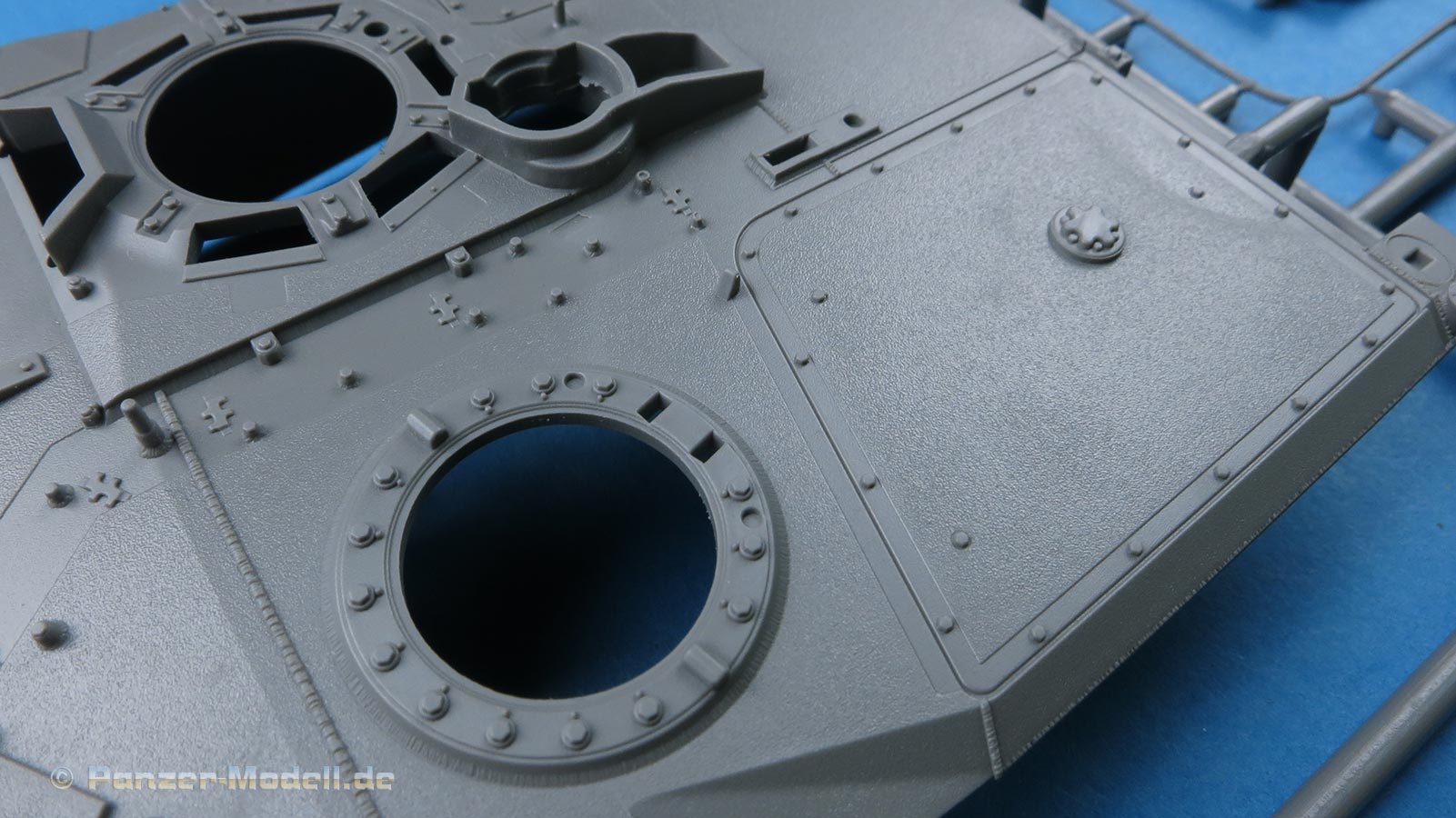 Die beiden Crewluken im Turm sind fein detailliert und lassen sich offen oder geschlossen einbauen. Das Kommandantenperi ist mit klarem Plastik für die Optik versehen und wird drehbar eingebaut.