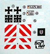Am Ende der Bauanleitung bietet Border ein farbiges Profil zur Bemalung und Markierung eines Fahrzeugs vom PzBtl.393. Die Farbangaben sind allein für Farben von Amig. Der Decalbogen beherrbergt alles, was man zur Markierung benötigt - zwei Sets Eiserne Kreuze, Nummernschilder, taktische Zeichen, MLC, Warntafeln und ein Einheitenabzeichen der 393er. Schön wöre heir zum einen gewesen, wenn man noch ein paar mehr Optionen gehabt hätte und die Wartungsaufdrucke, gerade für das Motordeck, wären das ultimative Detail gewesen.