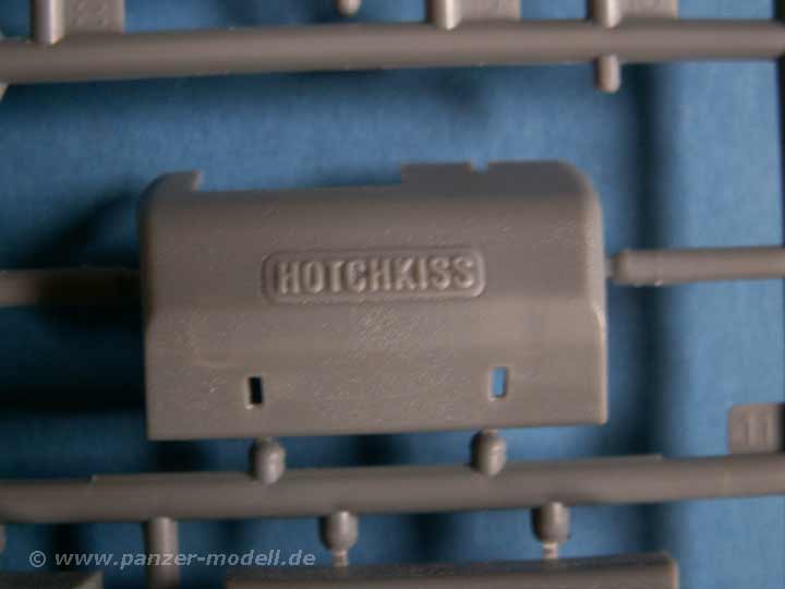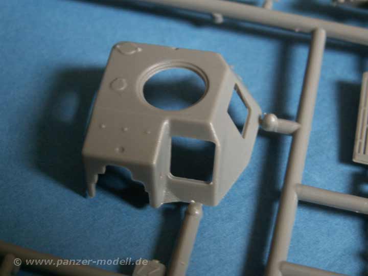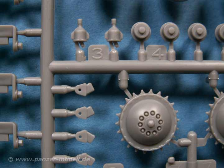 Die Spritzgussteile sind durch die Bank schön detailiert, die Frontpartie weist eine sehr feine Gussstruktur auf und auch für den Innenraum gibt es eine Einrichtung wie Fahrerplatz, Getriebe, Antriebswelle, Bodenplatte, usw. mit guten Details. Gut finde ich die Beigabe eines Motors für den Motorraum, damit dieser durch die Lüftungsschlitze nicht so leer aussieht! Ebenfalls gut ist die Verwendung einer Einzelgliedkette, auch wenn diese durch ihre kleinen Glieder sicher nicht einfach im Zusammenbau ist. Doch dadurch kann man die Kette besser anpassen und mit mehr Details versehen, als eine Vinylkette. Im Gegensatz zu den Trumpeter Modellen ist hier die Länge im ganzen korrekt wiedergegeben.