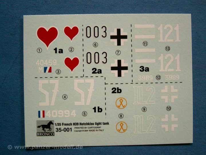 Die Markierungen umfassen 2 Fahrzeuge der französischen Armee, 25e BCC, 1ere DCR in Frankreich 1940, 7e Cuir, Frankwreich 1940, 3 Fahrzeuge der deutschen Armee, 211.PzAbt. in Finnland 1942, 7.SS Freiw.Div., Norwegen 1943 und Norwegisches Panzerbataillon, Norwegen 1942, sowie 1 Fahrzeug der russischen Kompanier, 82, Armored Battallion, Israelische Armee 1948. Die Decals sind sehr sauber gedruckt und machen einen hervorragenden Eindruck.