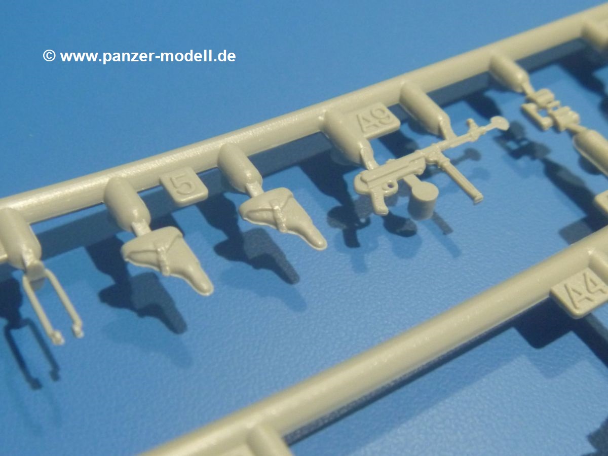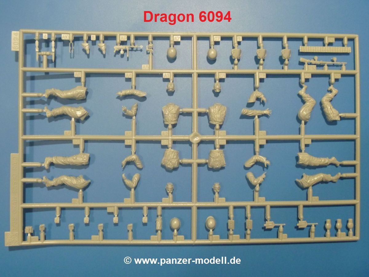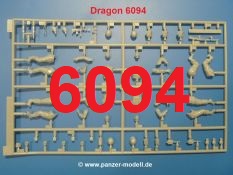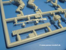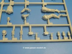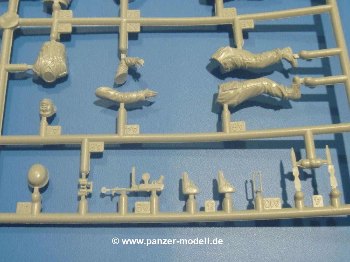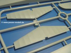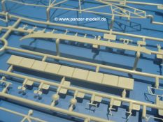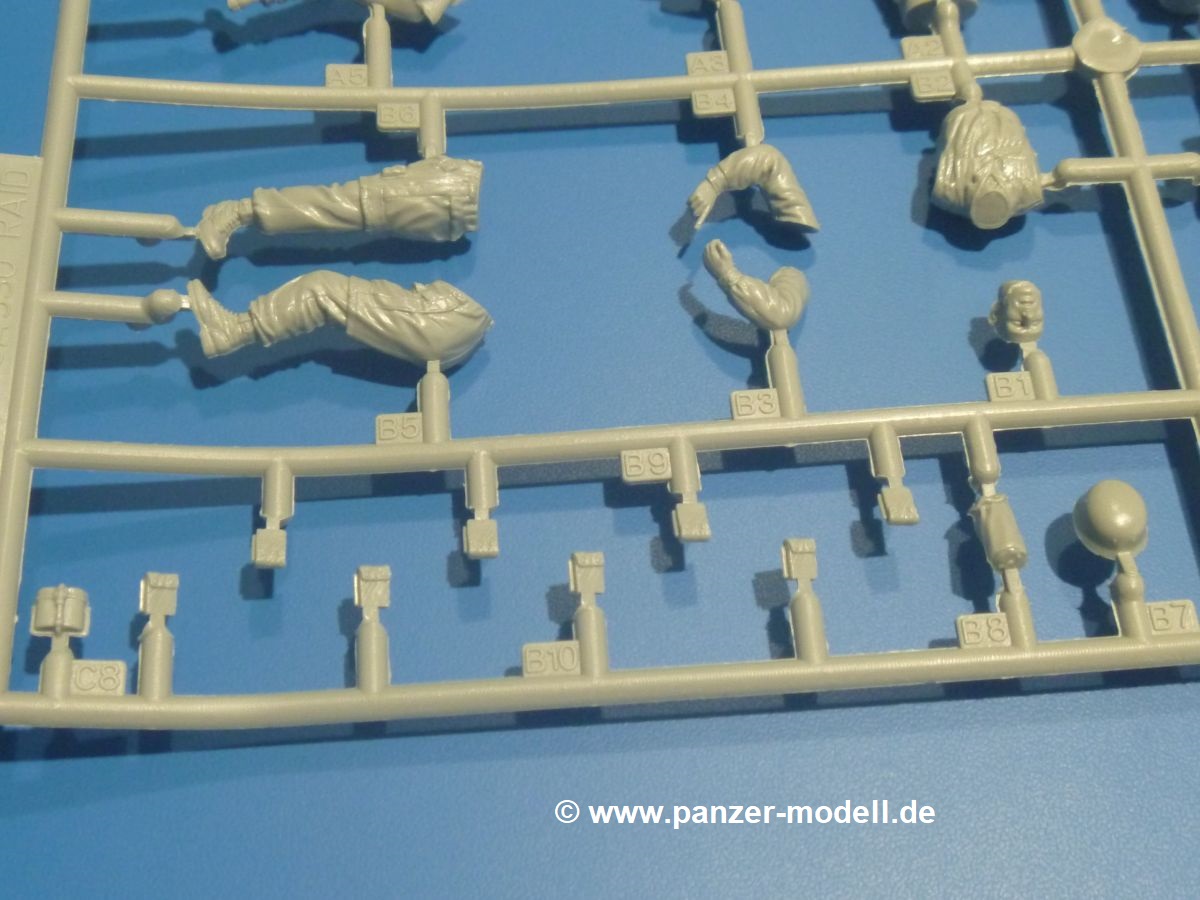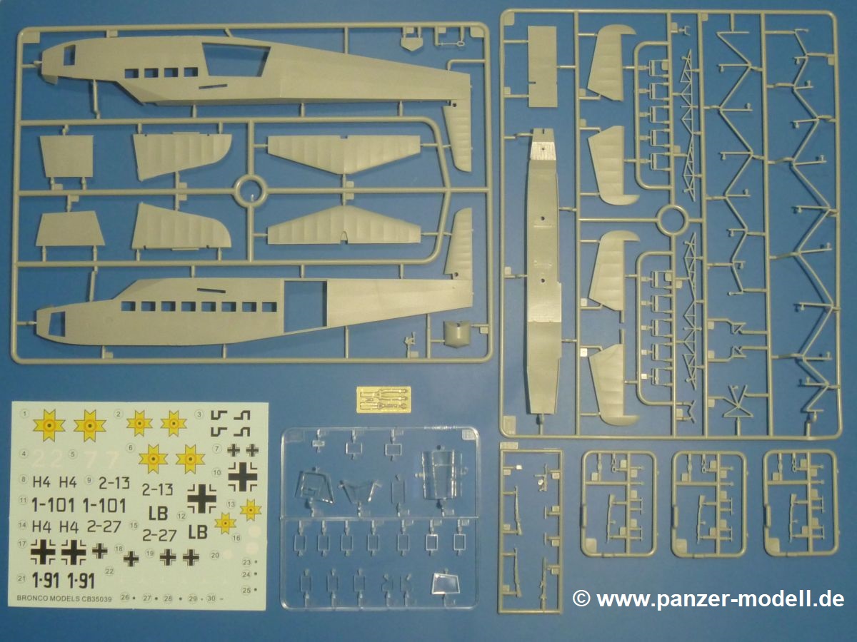 Alle Teile sind sauber gespritzt. Hier und da ist etwas feiner Grat (an Verstrebungen, Höhenruder) zu finden. Auswerferspuren befinden sich auf später nicht oder kaum einsehbaren Teilen. Die Klarsichtteile sind kristallklar, ohne Schlieren oder Einschlüsse. Die Figuren stammen zwar aus 20 Jahre alten Formen, aber weisen genügend Details und einen schönen Faltenwurf der Uniformen auf. Nur die Gesichter sind etwas zu einheitlich (Man könnte ganz sim(m)pel meinen: „Alle Menschen werden Brüder ...").Das Original hat Bronco wenig Chancen gelassen, filigrane Kleinstteile zu produzieren. So sind die kleinsten und feinsten Teile im Pilotenbereich zu finden. Auch das Fla-MG ist sehr filigran, aber der Rest sollte auch Anfänger nicht abschrecken.Im Inneren gibt es die Bodenplatte, die sowohl Pilotensitz, Steuerhorn und Fußsteuerung für die Querruder aufnimmt. Dahinter kommt die Sitzbank für die 9 Soldaten. Sie besteht aus den Bodenstreben, Sitzpolster und Rückenlehnen. 3 Karabiner, bei denen man die Wahl zwischen 2 Verschlüssen hat, werden im vorderen, rechten Bereich platziert. Der Rumpfkäfig besteht aus 2 Seiten-, 1 Boden- und 1 Deckenteil. Hier wird man sauber arbeiten müssen, damit die Streben beim Zusammenfügen der Rumpfhälften sauber zusammenkommen. Rumpf und Tragflächen zeigen bei näherem Hinschauen die Struktur des Bespannungsmaterials. Viele Seitenfenster, Cockpit- und 2 Einstiegsöffnungen rechts und links erlauben gute Einsicht ins Innere. In der rechten Rumpfhälfte und der linken Einstiegstür kann man weilweise Öffnungen für zusätzliche Fenster ausschneiden. Die linke Tür zeigt auch innen Verstrebungen an, aber dafür finden sich hier auch 4 Auswerferspuren in den Ecken, die man verspachteln sollte, wenn man die Tür offen anbringt. Für die großen Tragflächen wird eine stabile Aufnahme in den Rumpf eingeschoben, so dass kaum Last auf den dünnen Stützstreben liegen sollte. Jede Tragfläche besteht aus je Ober-, Unterteil und dem jeweils zweiteiligen Querruder. Der Pilotenbereich weist am meisten Details auf, die auch bei geschlossener Cockpithaube gut zu sehen sein werden. Auch durch die großen Seitenfenster im Fußbereich erhält man guten Einblick. Bedienhebel, Steuerhorn, Leuchtpatronenhalter (?) und die Armaturentafel, die mit 8 Decals ihr wahres Aussehen erhält, sind Details des Cockpits. Der Bug wird mit einer einfache Bugnase verschlossen. Darunter befindet sich Aufnahme für das Schleppseil. Die Landekufe wird an 3 Federbeinen angebracht, die durch den Rumpf bis zur Bodenplatte reichen. Am Heck findet sich nur ein einfacher Sporn. Für die wahlweise Startkonfiguration gibt es ein einfaches Fahrgestell, bestehend aus Quer-, Stützstreben und den beiden Rädern. Die Speichen der Radfelgen sind zwar da, kommen mir aber etwas vereinfacht vor. Der DFS-230 B1 war der erste seiner Art, der mit einem MG zur Selbstverteidigung ausgerüstet war. Das MG samt Halterung und Trommelmagazin sind dabei. Das MG erscheint mir etwas zu filigran, aber im Vergleich mit Originalaufnahmen doch wieder richtig. Damit der Schütze nicht versehentlich ins Cockpit schießen konnte, wird ein Abweiserbügel angebracht.Ein Figurensatz (Dragon Nr. 6094) mit 4 Fallschirmjägern erweitert den Bausatz. Der Satz besteht aus 1 stehenden, 2 laufenden und einen im Aufstehen begriffenen Fallschirmjäger. Ausrüstungsgegenstände wie die typischen Fallschirmjägerhelme, Brotbeutel, Feldflasche, Essgeschirr, Klappspaten, Munitionstaschen etc. und Waffen wie eine MP40 und ein Fallschirmjägergewehr 42 sind dabei. Die Waffen werden durch den Dragon Satz Nr. 6003 ergänzt. Dieser enthält eine weitere MP40, 1 Fallschirmjägergewehr 42, 2 Karabiner und Magazine.Der Decalbogen liefert neben den Instrumenten Decals Optionen für 4 Luftwaffe und 2 rumänische Lastensegler:
