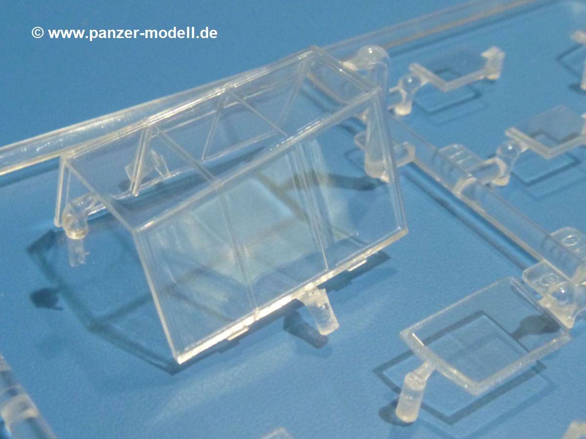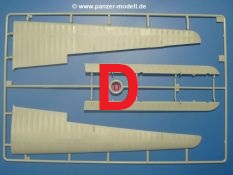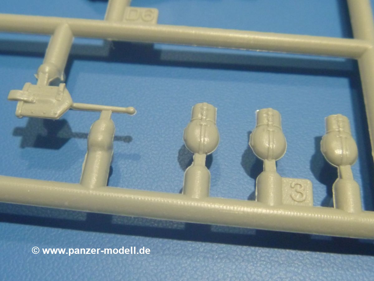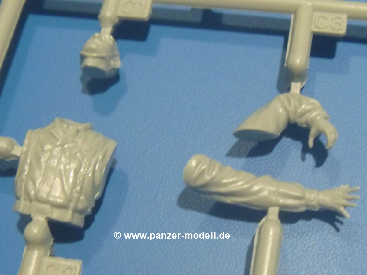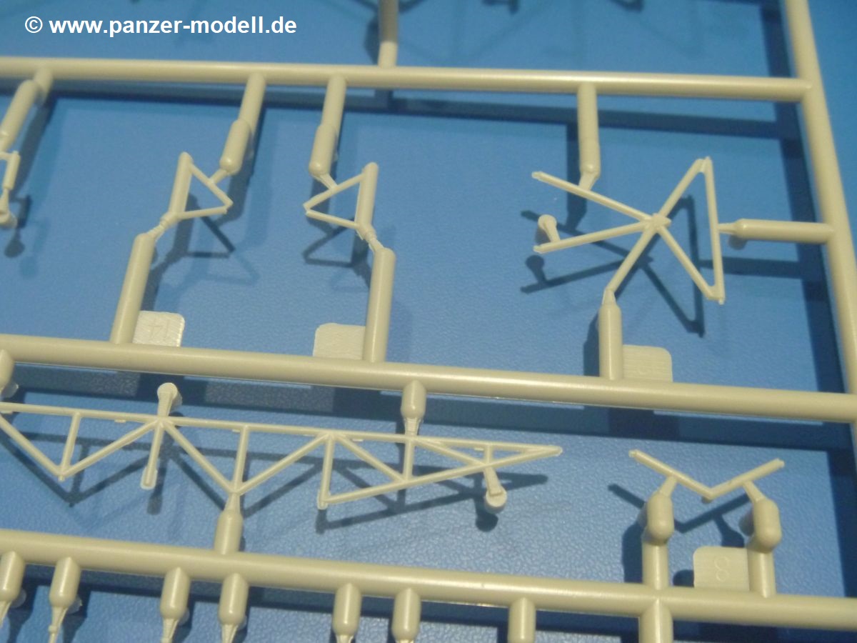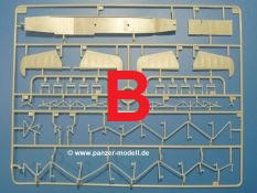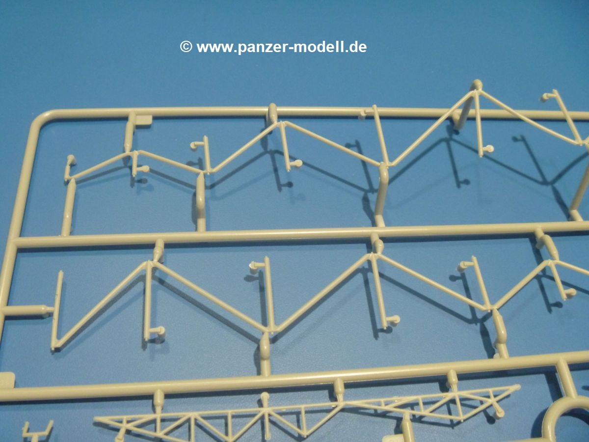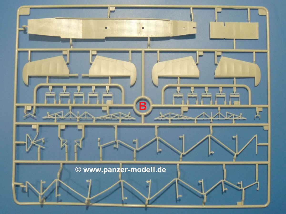 Alle Teile sind sauber gespritzt. Hier und da ist etwas feiner Grat (an Verstrebungen, Höhenruder) zu finden. Auswerferspuren befinden sich auf später nicht oder kaum einsehbaren Teilen. Die Klarsichtteile sind kristallklar, ohne Schlieren oder Einschlüsse. Die Figuren stammen zwar aus 20 Jahre alten Formen, aber weisen genügend Details und einen schönen Faltenwurf der Uniformen auf. Nur die Gesichter sind etwas zu einheitlich (Man könnte ganz sim(m)pel meinen: „Alle Menschen werden Brüder ...").Das Original hat Bronco wenig Chancen gelassen, filigrane Kleinstteile zu produzieren. So sind die kleinsten und feinsten Teile im Pilotenbereich zu finden. Auch das Fla-MG ist sehr filigran, aber der Rest sollte auch Anfänger nicht abschrecken.Im Inneren gibt es die Bodenplatte, die sowohl Pilotensitz, Steuerhorn und Fußsteuerung für die Querruder aufnimmt. Dahinter kommt die Sitzbank für die 9 Soldaten. Sie besteht aus den Bodenstreben, Sitzpolster und Rückenlehnen. 3 Karabiner, bei denen man die Wahl zwischen 2 Verschlüssen hat, werden im vorderen, rechten Bereich platziert. Der Rumpfkäfig besteht aus 2 Seiten-, 1 Boden- und 1 Deckenteil. Hier wird man sauber arbeiten müssen, damit die Streben beim Zusammenfügen der Rumpfhälften sauber zusammenkommen. Rumpf und Tragflächen zeigen bei näherem Hinschauen die Struktur des Bespannungsmaterials. Viele Seitenfenster, Cockpit- und 2 Einstiegsöffnungen rechts und links erlauben gute Einsicht ins Innere. In der rechten Rumpfhälfte und der linken Einstiegstür kann man weilweise Öffnungen für zusätzliche Fenster ausschneiden. Die linke Tür zeigt auch innen Verstrebungen an, aber dafür finden sich hier auch 4 Auswerferspuren in den Ecken, die man verspachteln sollte, wenn man die Tür offen anbringt. Für die großen Tragflächen wird eine stabile Aufnahme in den Rumpf eingeschoben, so dass kaum Last auf den dünnen Stützstreben liegen sollte. Jede Tragfläche besteht aus je Ober-, Unterteil und dem jeweils zweiteiligen Querruder. Der Pilotenbereich weist am meisten Details auf, die auch bei geschlossener Cockpithaube gut zu sehen sein werden. Auch durch die großen Seitenfenster im Fußbereich erhält man guten Einblick. Bedienhebel, Steuerhorn, Leuchtpatronenhalter (?) und die Armaturentafel, die mit 8 Decals ihr wahres Aussehen erhält, sind Details des Cockpits. Der Bug wird mit einer einfache Bugnase verschlossen. Darunter befindet sich Aufnahme für das Schleppseil. Die Landekufe wird an 3 Federbeinen angebracht, die durch den Rumpf bis zur Bodenplatte reichen. Am Heck findet sich nur ein einfacher Sporn. Für die wahlweise Startkonfiguration gibt es ein einfaches Fahrgestell, bestehend aus Quer-, Stützstreben und den beiden Rädern. Die Speichen der Radfelgen sind zwar da, kommen mir aber etwas vereinfacht vor. Der DFS-230 B1 war der erste seiner Art, der mit einem MG zur Selbstverteidigung ausgerüstet war. Das MG samt Halterung und Trommelmagazin sind dabei. Das MG erscheint mir etwas zu filigran, aber im Vergleich mit Originalaufnahmen doch wieder richtig. Damit der Schütze nicht versehentlich ins Cockpit schießen konnte, wird ein Abweiserbügel angebracht.Ein Figurensatz (Dragon Nr. 6094) mit 4 Fallschirmjägern erweitert den Bausatz. Der Satz besteht aus 1 stehenden, 2 laufenden und einen im Aufstehen begriffenen Fallschirmjäger. Ausrüstungsgegenstände wie die typischen Fallschirmjägerhelme, Brotbeutel, Feldflasche, Essgeschirr, Klappspaten, Munitionstaschen etc. und Waffen wie eine MP40 und ein Fallschirmjägergewehr 42 sind dabei. Die Waffen werden durch den Dragon Satz Nr. 6003 ergänzt. Dieser enthält eine weitere MP40, 1 Fallschirmjägergewehr 42, 2 Karabiner und Magazine.Der Decalbogen liefert neben den Instrumenten Decals Optionen für 4 Luftwaffe und 2 rumänische Lastensegler: