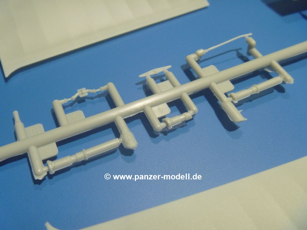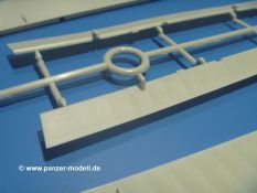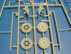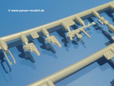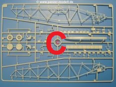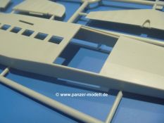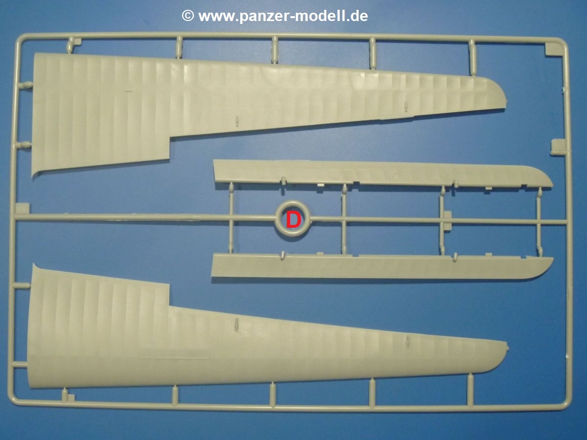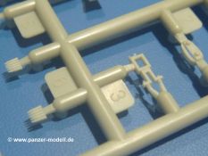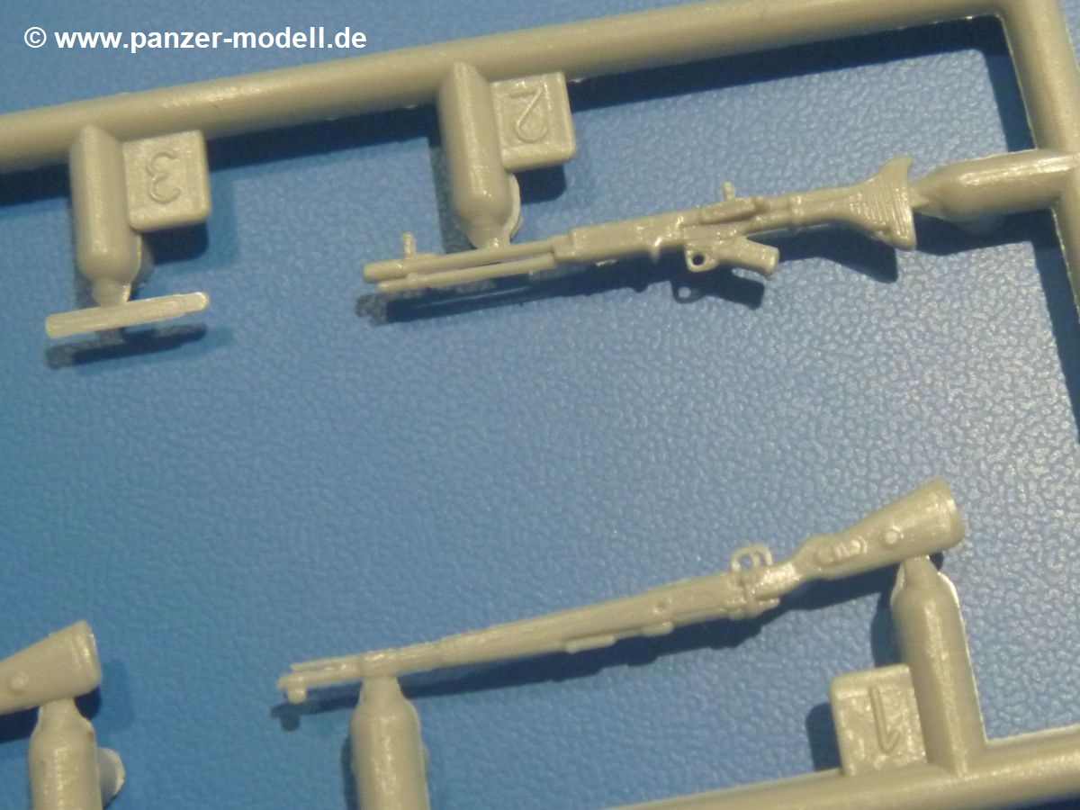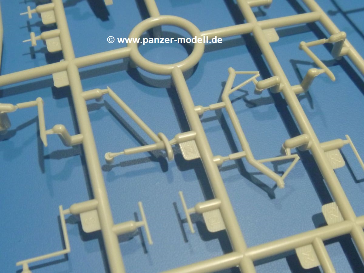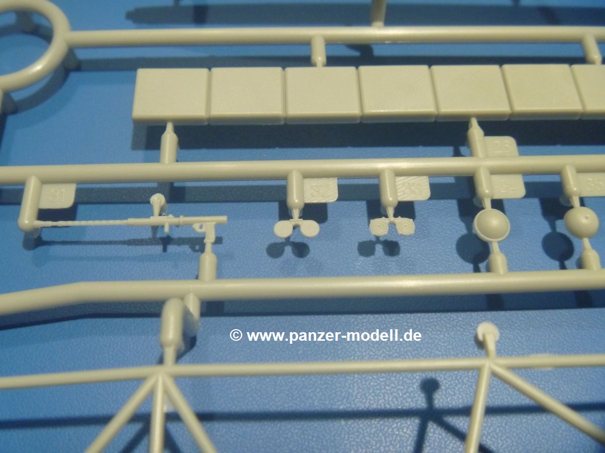 Alle Teile sind sauber gespritzt. Hier und da ist etwas feiner Grat (an Verstrebungen, Höhenruder) zu finden. Auswerferspuren befinden sich auf später nicht oder kaum einsehbaren Teilen. Die Klarsichtteile sind kristallklar, ohne Schlieren oder Einschlüsse. Die Figuren stammen zwar aus 20 Jahre alten Formen, aber weisen genügend Details und einen schönen Faltenwurf der Uniformen auf. Nur die Gesichter sind etwas zu einheitlich (Man könnte ganz sim(m)pel meinen: „Alle Menschen werden Brüder ...").Das Original hat Bronco wenig Chancen gelassen, filigrane Kleinstteile zu produzieren. So sind die kleinsten und feinsten Teile im Pilotenbereich zu finden. Auch das Fla-MG ist sehr filigran, aber der Rest sollte auch Anfänger nicht abschrecken.Im Inneren gibt es die Bodenplatte, die sowohl Pilotensitz, Steuerhorn und Fußsteuerung für die Querruder aufnimmt. Dahinter kommt die Sitzbank für die 9 Soldaten. Sie besteht aus den Bodenstreben, Sitzpolster und Rückenlehnen. 3 Karabiner, bei denen man die Wahl zwischen 2 Verschlüssen hat, werden im vorderen, rechten Bereich platziert. Der Rumpfkäfig besteht aus 2 Seiten-, 1 Boden- und 1 Deckenteil. Hier wird man sauber arbeiten müssen, damit die Streben beim Zusammenfügen der Rumpfhälften sauber zusammenkommen. Rumpf und Tragflächen zeigen bei näherem Hinschauen die Struktur des Bespannungsmaterials. Viele Seitenfenster, Cockpit- und 2 Einstiegsöffnungen rechts und links erlauben gute Einsicht ins Innere. In der rechten Rumpfhälfte und der linken Einstiegstür kann man weilweise Öffnungen für zusätzliche Fenster ausschneiden. Die linke Tür zeigt auch innen Verstrebungen an, aber dafür finden sich hier auch 4 Auswerferspuren in den Ecken, die man verspachteln sollte, wenn man die Tür offen anbringt. Für die großen Tragflächen wird eine stabile Aufnahme in den Rumpf eingeschoben, so dass kaum Last auf den dünnen Stützstreben liegen sollte. Jede Tragfläche besteht aus je Ober-, Unterteil und dem jeweils zweiteiligen Querruder. Der Pilotenbereich weist am meisten Details auf, die auch bei geschlossener Cockpithaube gut zu sehen sein werden. Auch durch die großen Seitenfenster im Fußbereich erhält man guten Einblick. Bedienhebel, Steuerhorn, Leuchtpatronenhalter (?) und die Armaturentafel, die mit 8 Decals ihr wahres Aussehen erhält, sind Details des Cockpits. Der Bug wird mit einer einfache Bugnase verschlossen. Darunter befindet sich Aufnahme für das Schleppseil. Die Landekufe wird an 3 Federbeinen angebracht, die durch den Rumpf bis zur Bodenplatte reichen. Am Heck findet sich nur ein einfacher Sporn. Für die wahlweise Startkonfiguration gibt es ein einfaches Fahrgestell, bestehend aus Quer-, Stützstreben und den beiden Rädern. Die Speichen der Radfelgen sind zwar da, kommen mir aber etwas vereinfacht vor. Der DFS-230 B1 war der erste seiner Art, der mit einem MG zur Selbstverteidigung ausgerüstet war. Das MG samt Halterung und Trommelmagazin sind dabei. Das MG erscheint mir etwas zu filigran, aber im Vergleich mit Originalaufnahmen doch wieder richtig. Damit der Schütze nicht versehentlich ins Cockpit schießen konnte, wird ein Abweiserbügel angebracht.Ein Figurensatz (Dragon Nr. 6094) mit 4 Fallschirmjägern erweitert den Bausatz. Der Satz besteht aus 1 stehenden, 2 laufenden und einen im Aufstehen begriffenen Fallschirmjäger. Ausrüstungsgegenstände wie die typischen Fallschirmjägerhelme, Brotbeutel, Feldflasche, Essgeschirr, Klappspaten, Munitionstaschen etc. und Waffen wie eine MP40 und ein Fallschirmjägergewehr 42 sind dabei. Die Waffen werden durch den Dragon Satz Nr. 6003 ergänzt. Dieser enthält eine weitere MP40, 1 Fallschirmjägergewehr 42, 2 Karabiner und Magazine.Der Decalbogen liefert neben den Instrumenten Decals Optionen für 4 Luftwaffe und 2 rumänische Lastensegler: