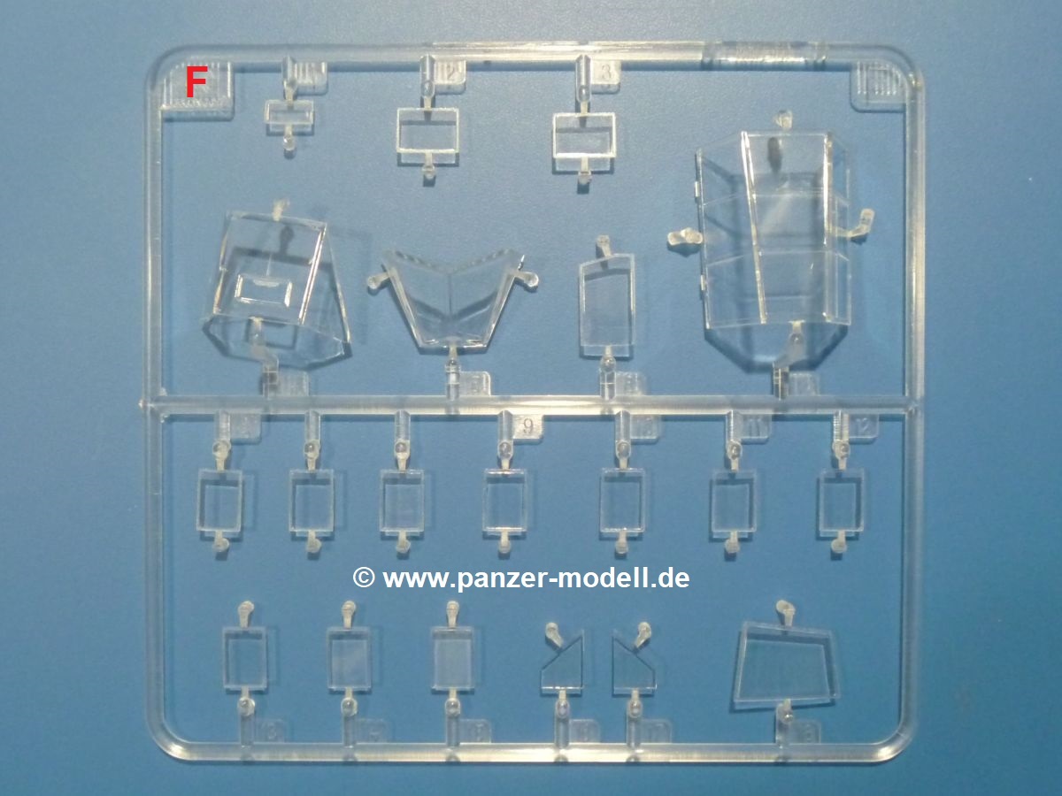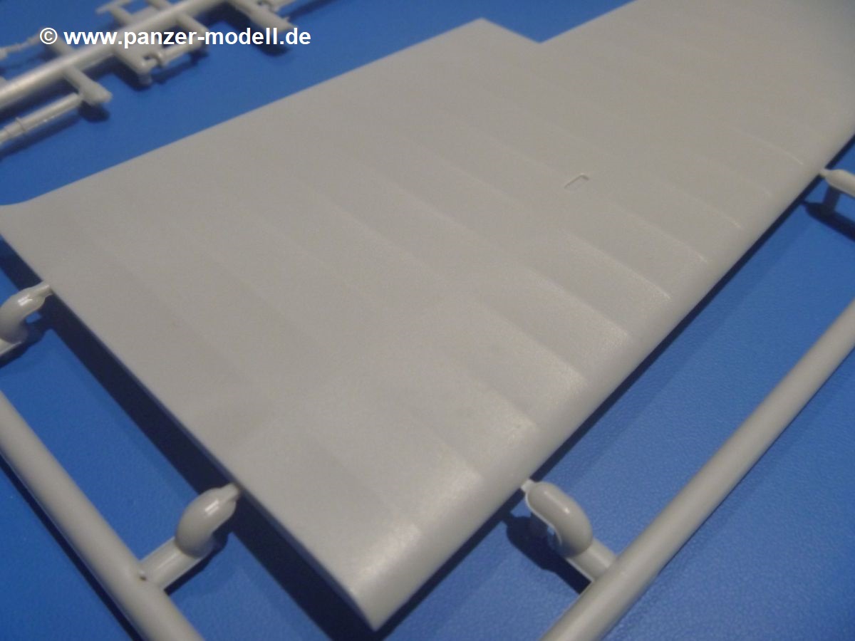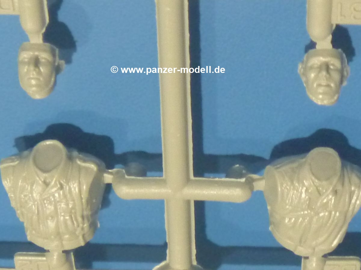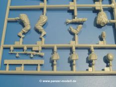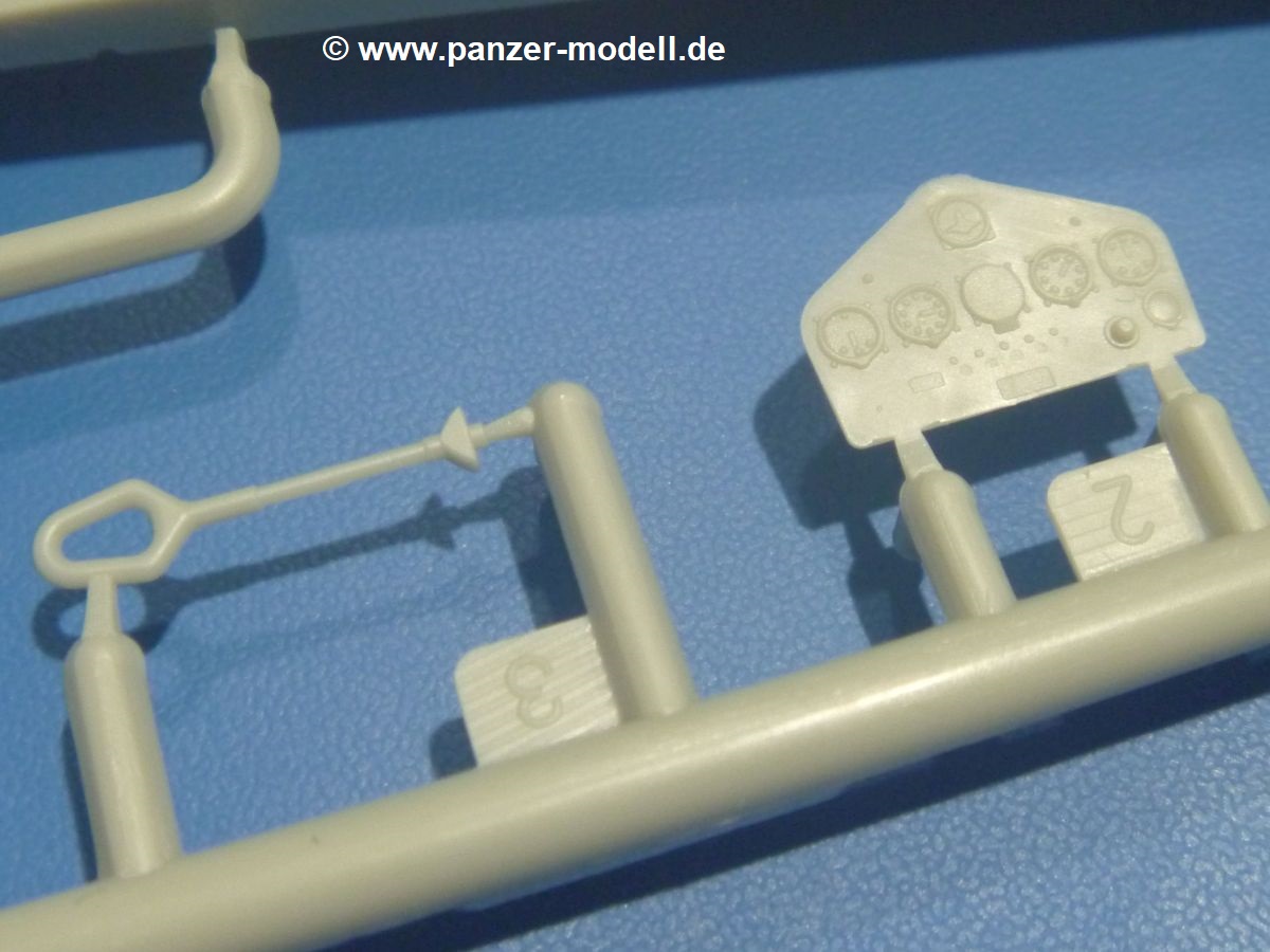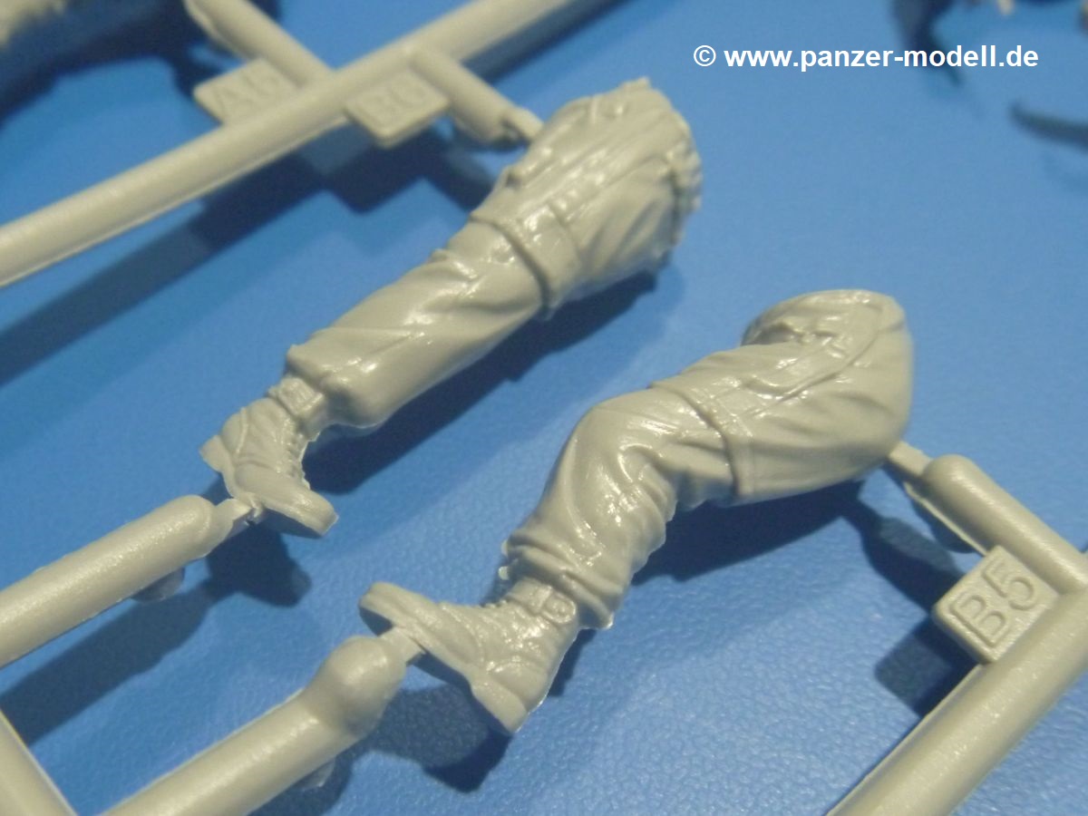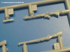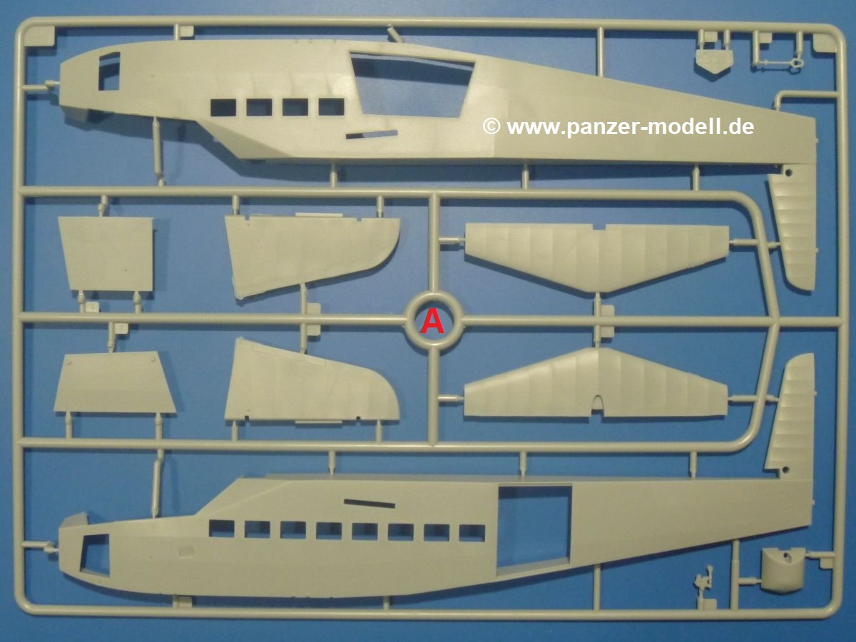 Alle Teile sind sauber gespritzt. Hier und da ist etwas feiner Grat (an Verstrebungen, Höhenruder) zu finden. Auswerferspuren befinden sich auf später nicht oder kaum einsehbaren Teilen. Die Klarsichtteile sind kristallklar, ohne Schlieren oder Einschlüsse. Die Figuren stammen zwar aus 20 Jahre alten Formen, aber weisen genügend Details und einen schönen Faltenwurf der Uniformen auf. Nur die Gesichter sind etwas zu einheitlich (Man könnte ganz sim(m)pel meinen: „Alle Menschen werden Brüder ...").Das Original hat Bronco wenig Chancen gelassen, filigrane Kleinstteile zu produzieren. So sind die kleinsten und feinsten Teile im Pilotenbereich zu finden. Auch das Fla-MG ist sehr filigran, aber der Rest sollte auch Anfänger nicht abschrecken.Im Inneren gibt es die Bodenplatte, die sowohl Pilotensitz, Steuerhorn und Fußsteuerung für die Querruder aufnimmt. Dahinter kommt die Sitzbank für die 9 Soldaten. Sie besteht aus den Bodenstreben, Sitzpolster und Rückenlehnen. 3 Karabiner, bei denen man die Wahl zwischen 2 Verschlüssen hat, werden im vorderen, rechten Bereich platziert. Der Rumpfkäfig besteht aus 2 Seiten-, 1 Boden- und 1 Deckenteil. Hier wird man sauber arbeiten müssen, damit die Streben beim Zusammenfügen der Rumpfhälften sauber zusammenkommen. Rumpf und Tragflächen zeigen bei näherem Hinschauen die Struktur des Bespannungsmaterials. Viele Seitenfenster, Cockpit- und 2 Einstiegsöffnungen rechts und links erlauben gute Einsicht ins Innere. In der rechten Rumpfhälfte und der linken Einstiegstür kann man weilweise Öffnungen für zusätzliche Fenster ausschneiden. Die linke Tür zeigt auch innen Verstrebungen an, aber dafür finden sich hier auch 4 Auswerferspuren in den Ecken, die man verspachteln sollte, wenn man die Tür offen anbringt. Für die großen Tragflächen wird eine stabile Aufnahme in den Rumpf eingeschoben, so dass kaum Last auf den dünnen Stützstreben liegen sollte. Jede Tragfläche besteht aus je Ober-, Unterteil und dem jeweils zweiteiligen Querruder. Der Pilotenbereich weist am meisten Details auf, die auch bei geschlossener Cockpithaube gut zu sehen sein werden. Auch durch die großen Seitenfenster im Fußbereich erhält man guten Einblick. Bedienhebel, Steuerhorn, Leuchtpatronenhalter (?) und die Armaturentafel, die mit 8 Decals ihr wahres Aussehen erhält, sind Details des Cockpits. Der Bug wird mit einer einfache Bugnase verschlossen. Darunter befindet sich Aufnahme für das Schleppseil. Die Landekufe wird an 3 Federbeinen angebracht, die durch den Rumpf bis zur Bodenplatte reichen. Am Heck findet sich nur ein einfacher Sporn. Für die wahlweise Startkonfiguration gibt es ein einfaches Fahrgestell, bestehend aus Quer-, Stützstreben und den beiden Rädern. Die Speichen der Radfelgen sind zwar da, kommen mir aber etwas vereinfacht vor. Der DFS-230 B1 war der erste seiner Art, der mit einem MG zur Selbstverteidigung ausgerüstet war. Das MG samt Halterung und Trommelmagazin sind dabei. Das MG erscheint mir etwas zu filigran, aber im Vergleich mit Originalaufnahmen doch wieder richtig. Damit der Schütze nicht versehentlich ins Cockpit schießen konnte, wird ein Abweiserbügel angebracht.Ein Figurensatz (Dragon Nr. 6094) mit 4 Fallschirmjägern erweitert den Bausatz. Der Satz besteht aus 1 stehenden, 2 laufenden und einen im Aufstehen begriffenen Fallschirmjäger. Ausrüstungsgegenstände wie die typischen Fallschirmjägerhelme, Brotbeutel, Feldflasche, Essgeschirr, Klappspaten, Munitionstaschen etc. und Waffen wie eine MP40 und ein Fallschirmjägergewehr 42 sind dabei. Die Waffen werden durch den Dragon Satz Nr. 6003 ergänzt. Dieser enthält eine weitere MP40, 1 Fallschirmjägergewehr 42, 2 Karabiner und Magazine.Der Decalbogen liefert neben den Instrumenten Decals Optionen für 4 Luftwaffe und 2 rumänische Lastensegler: