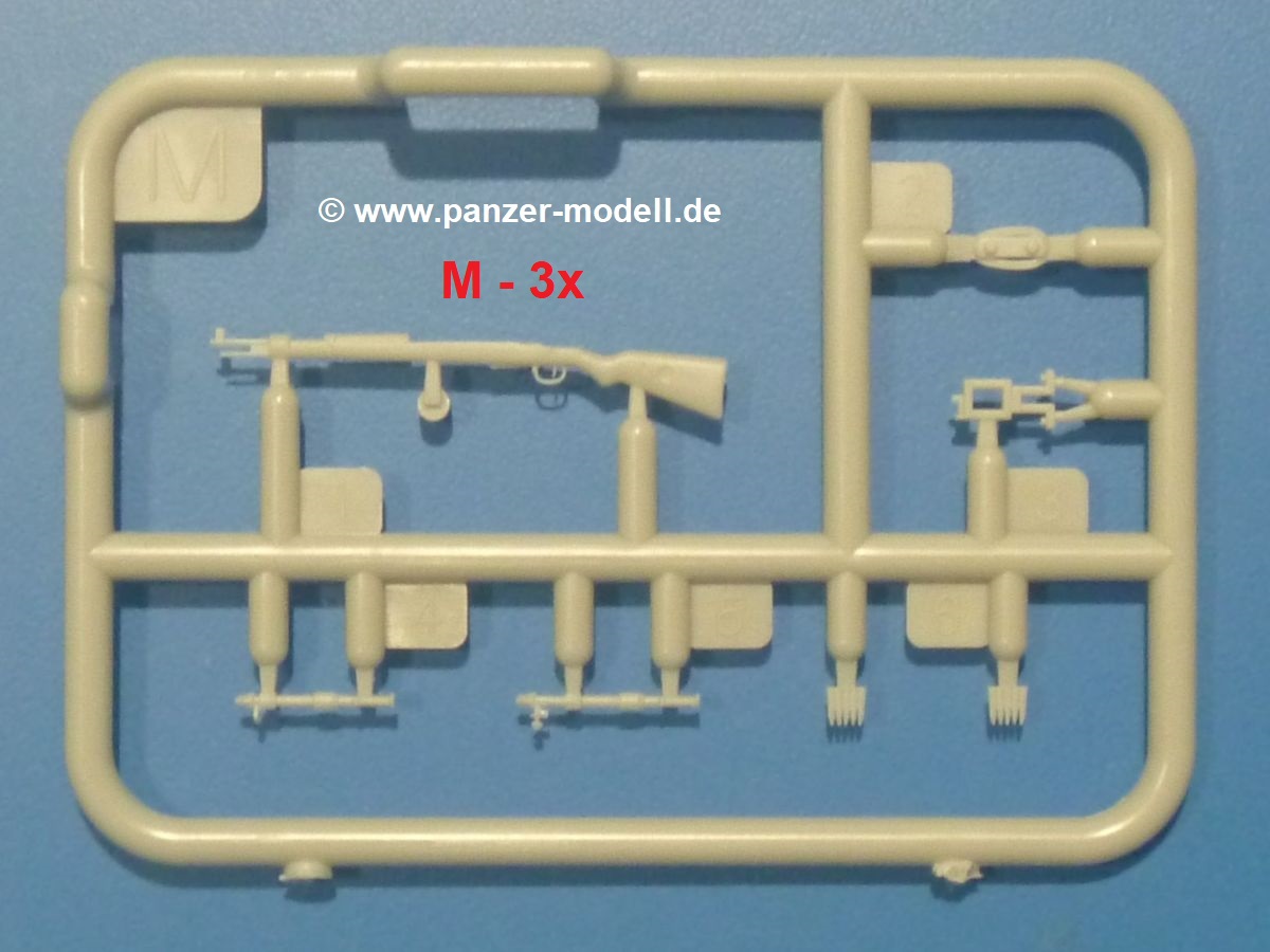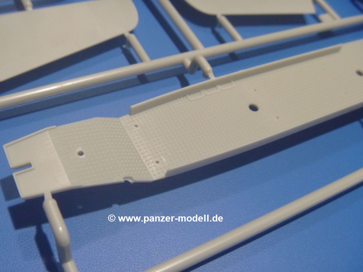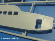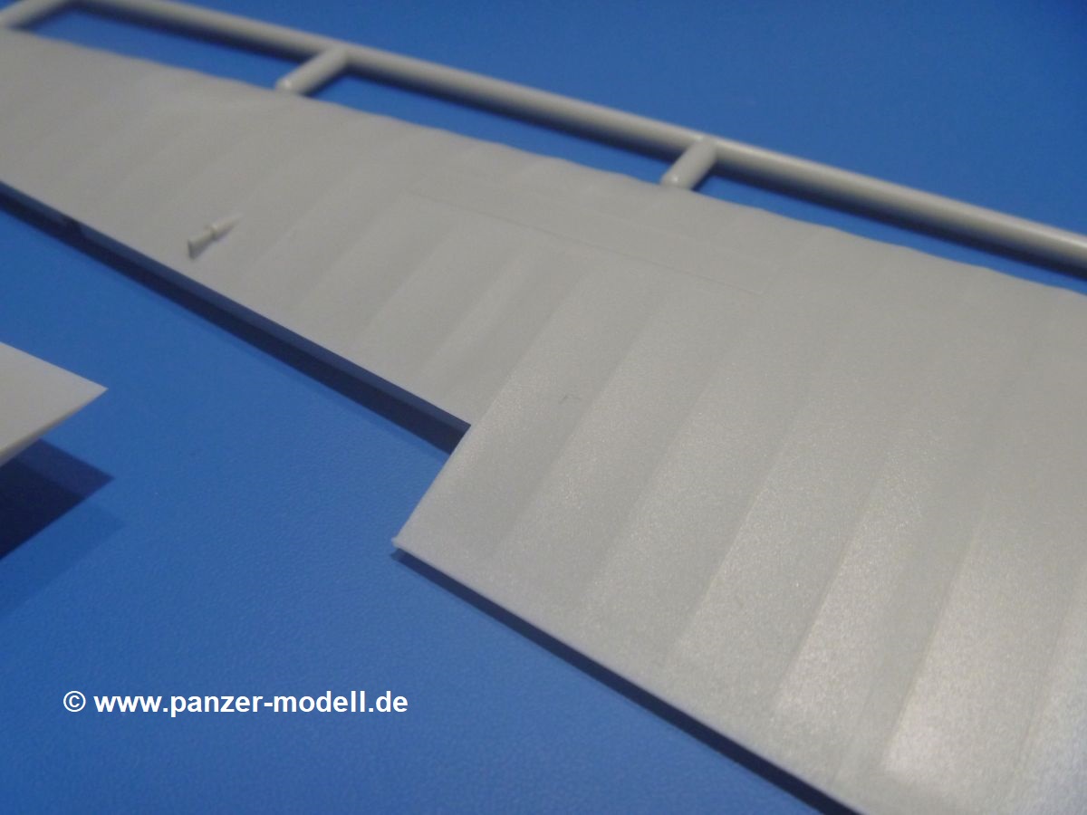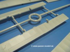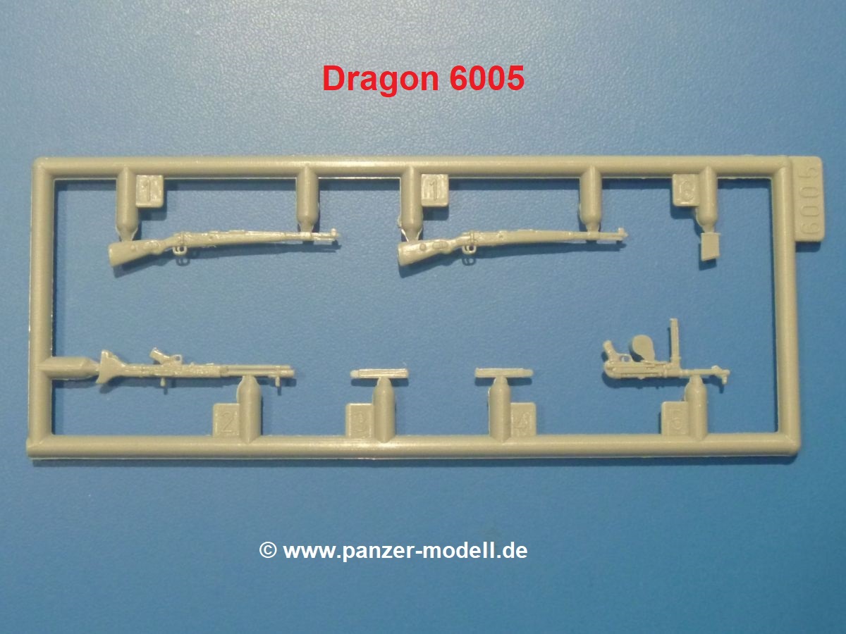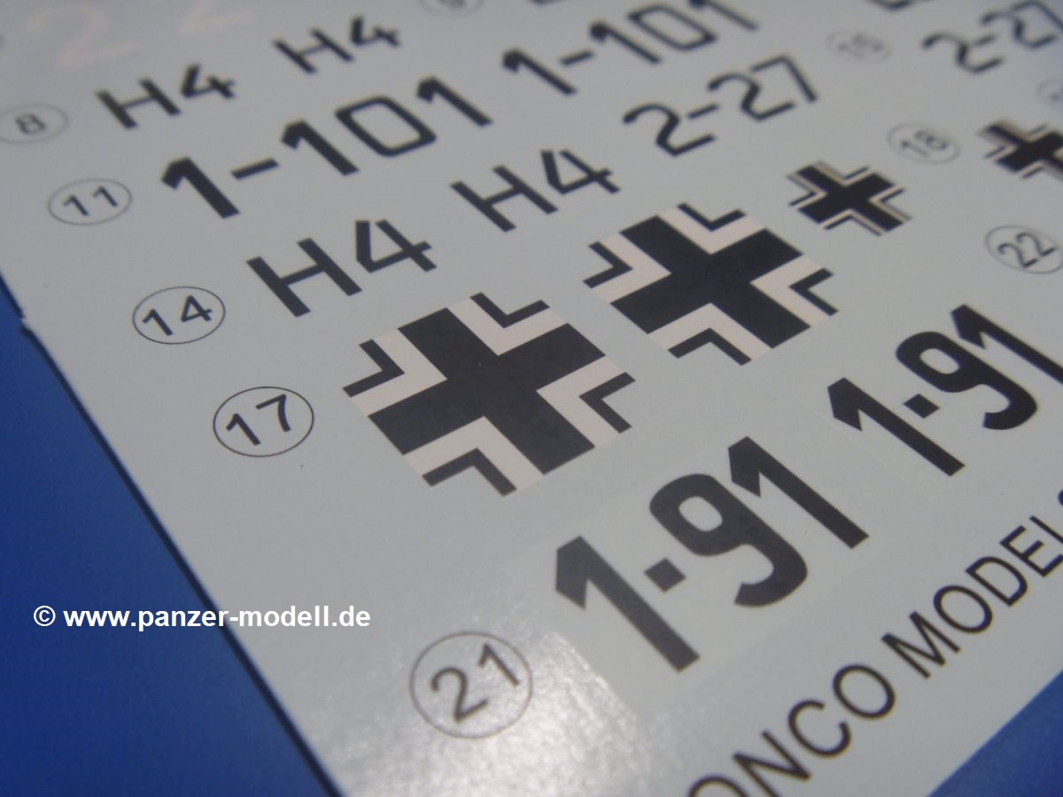 Alle Teile sind sauber gespritzt. Hier und da ist etwas feiner Grat (an Verstrebungen, Höhenruder) zu finden. Auswerferspuren befinden sich auf später nicht oder kaum einsehbaren Teilen. Die Klarsichtteile sind kristallklar, ohne Schlieren oder Einschlüsse. Die Figuren stammen zwar aus 20 Jahre alten Formen, aber weisen genügend Details und einen schönen Faltenwurf der Uniformen auf. Nur die Gesichter sind etwas zu einheitlich (Man könnte ganz sim(m)pel meinen: „Alle Menschen werden Brüder ...").Das Original hat Bronco wenig Chancen gelassen, filigrane Kleinstteile zu produzieren. So sind die kleinsten und feinsten Teile im Pilotenbereich zu finden. Auch das Fla-MG ist sehr filigran, aber der Rest sollte auch Anfänger nicht abschrecken.Im Inneren gibt es die Bodenplatte, die sowohl Pilotensitz, Steuerhorn und Fußsteuerung für die Querruder aufnimmt. Dahinter kommt die Sitzbank für die 9 Soldaten. Sie besteht aus den Bodenstreben, Sitzpolster und Rückenlehnen. 3 Karabiner, bei denen man die Wahl zwischen 2 Verschlüssen hat, werden im vorderen, rechten Bereich platziert. Der Rumpfkäfig besteht aus 2 Seiten-, 1 Boden- und 1 Deckenteil. Hier wird man sauber arbeiten müssen, damit die Streben beim Zusammenfügen der Rumpfhälften sauber zusammenkommen. Rumpf und Tragflächen zeigen bei näherem Hinschauen die Struktur des Bespannungsmaterials. Viele Seitenfenster, Cockpit- und 2 Einstiegsöffnungen rechts und links erlauben gute Einsicht ins Innere. In der rechten Rumpfhälfte und der linken Einstiegstür kann man weilweise Öffnungen für zusätzliche Fenster ausschneiden. Die linke Tür zeigt auch innen Verstrebungen an, aber dafür finden sich hier auch 4 Auswerferspuren in den Ecken, die man verspachteln sollte, wenn man die Tür offen anbringt. Für die großen Tragflächen wird eine stabile Aufnahme in den Rumpf eingeschoben, so dass kaum Last auf den dünnen Stützstreben liegen sollte. Jede Tragfläche besteht aus je Ober-, Unterteil und dem jeweils zweiteiligen Querruder. Der Pilotenbereich weist am meisten Details auf, die auch bei geschlossener Cockpithaube gut zu sehen sein werden. Auch durch die großen Seitenfenster im Fußbereich erhält man guten Einblick. Bedienhebel, Steuerhorn, Leuchtpatronenhalter (?) und die Armaturentafel, die mit 8 Decals ihr wahres Aussehen erhält, sind Details des Cockpits. Der Bug wird mit einer einfache Bugnase verschlossen. Darunter befindet sich Aufnahme für das Schleppseil. Die Landekufe wird an 3 Federbeinen angebracht, die durch den Rumpf bis zur Bodenplatte reichen. Am Heck findet sich nur ein einfacher Sporn. Für die wahlweise Startkonfiguration gibt es ein einfaches Fahrgestell, bestehend aus Quer-, Stützstreben und den beiden Rädern. Die Speichen der Radfelgen sind zwar da, kommen mir aber etwas vereinfacht vor. Der DFS-230 B1 war der erste seiner Art, der mit einem MG zur Selbstverteidigung ausgerüstet war. Das MG samt Halterung und Trommelmagazin sind dabei. Das MG erscheint mir etwas zu filigran, aber im Vergleich mit Originalaufnahmen doch wieder richtig. Damit der Schütze nicht versehentlich ins Cockpit schießen konnte, wird ein Abweiserbügel angebracht.Ein Figurensatz (Dragon Nr. 6094) mit 4 Fallschirmjägern erweitert den Bausatz. Der Satz besteht aus 1 stehenden, 2 laufenden und einen im Aufstehen begriffenen Fallschirmjäger. Ausrüstungsgegenstände wie die typischen Fallschirmjägerhelme, Brotbeutel, Feldflasche, Essgeschirr, Klappspaten, Munitionstaschen etc. und Waffen wie eine MP40 und ein Fallschirmjägergewehr 42 sind dabei. Die Waffen werden durch den Dragon Satz Nr. 6003 ergänzt. Dieser enthält eine weitere MP40, 1 Fallschirmjägergewehr 42, 2 Karabiner und Magazine.Der Decalbogen liefert neben den Instrumenten Decals Optionen für 4 Luftwaffe und 2 rumänische Lastensegler: