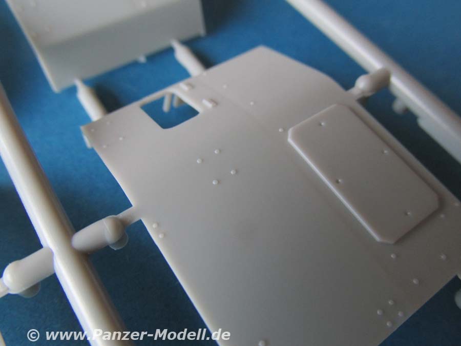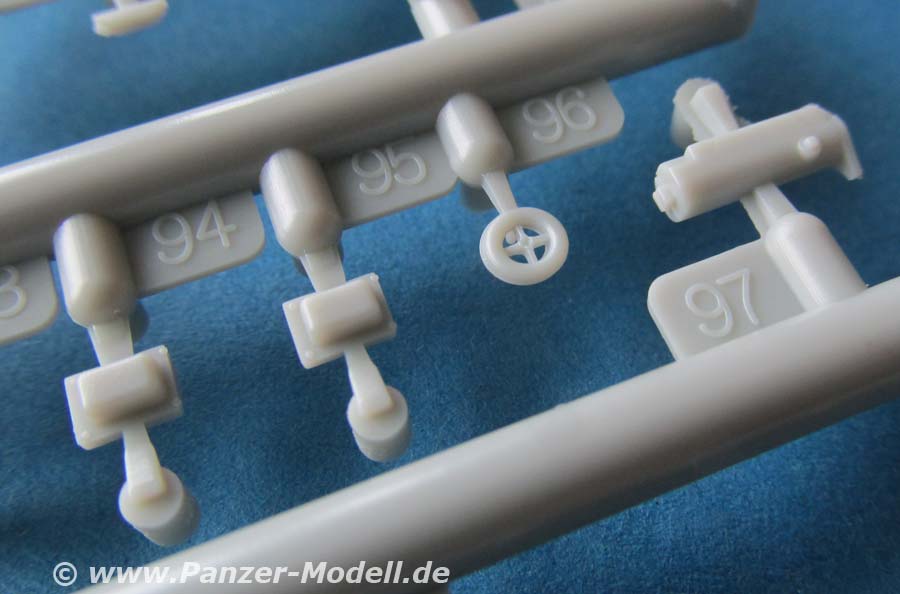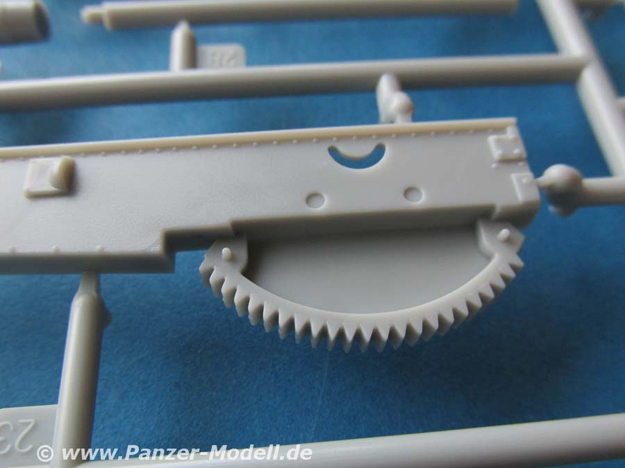 Der Großteil des Bausatzes ist prinzipiell bereits aus dem Bausatz 35067 bekannt, denn die Lafette inklusive der Schutzschilde ist von dort. Die Qualität ist ausgezeichnet mit vielen feinen Details und sauberem Guss. Die Schutzschilde sind ebenfalls sehr gut und maßstäblich erstaunlich dünn. Insgesamt gibt es hier schon sehr viele, teils winzige Anbauteile - schön für die Optik, schlecht für die Motivation. Auch sämtliche Anbauteile wie Höhenrichtung, Anzeigen, usw. sind in wahnsinnig viele Kleinteile aufgebrochen - da wird einem schon beim Blick in die Bauanleitung schwindelig. Andereseits - detaillierter geht es dann kaum noch.