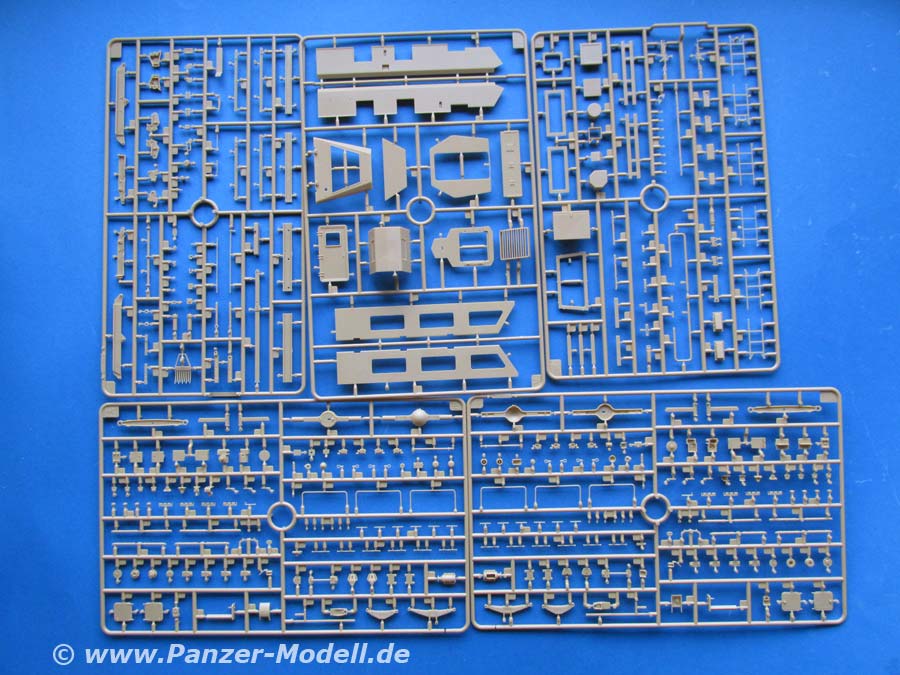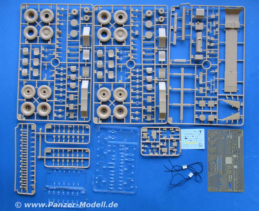 Im Bausatz finden sich 20 sandgelbe Spritzlinge, dazu 5 durchsichtige Spritzlinge, eine PE Platine, Schlauchmaterial, die unterwanne und der Aufbau, 8 Reifenprofilringe und ein Decalbogen.