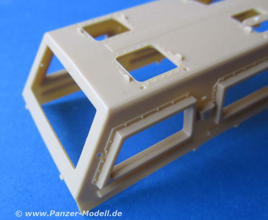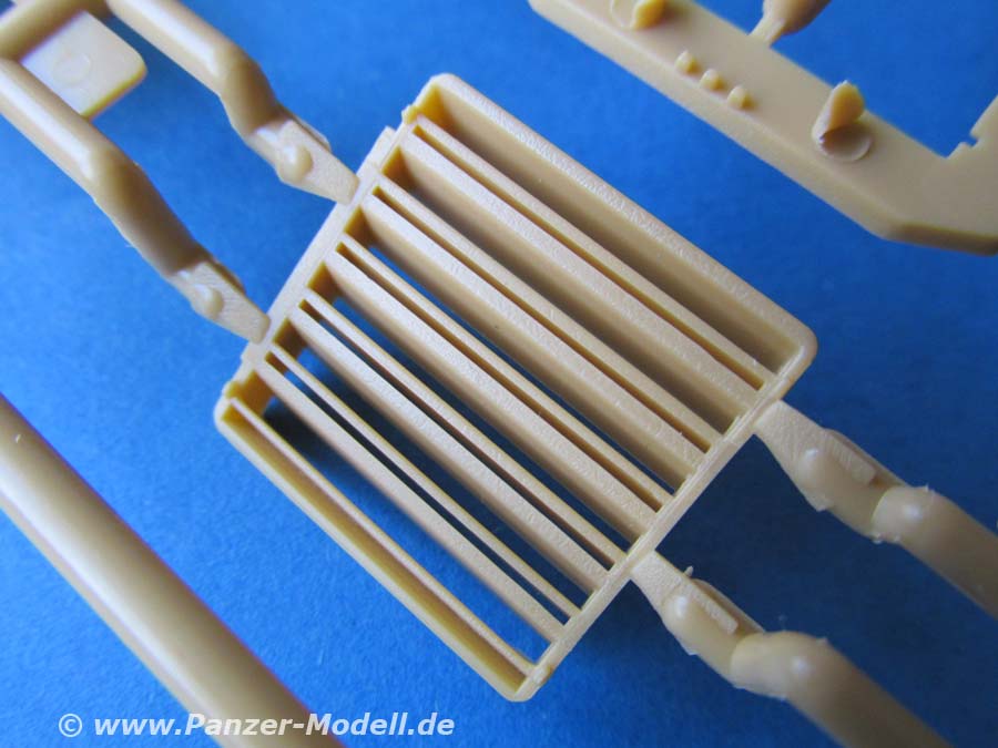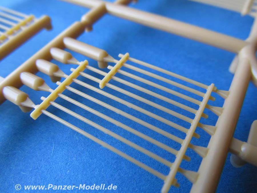 Hauptaugenmerk dieses Bausatzes liegt aber natürlich auf der Slat Panzerung. Diese hat Bronco als Platsikspritzgussteile in einzelnen Elementen dem bausatz beigelegt. Das ganze macht einen guten und einfach zu handhabenden Eindruck. Das einzig fummelige dürften die halterungen und Verbindungen aus PE teilen sein, die offenbar teilweise mit einzelnen Plastiknietenköpfen noch bestückt werden sollen.