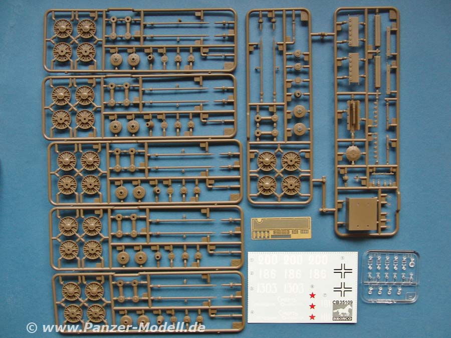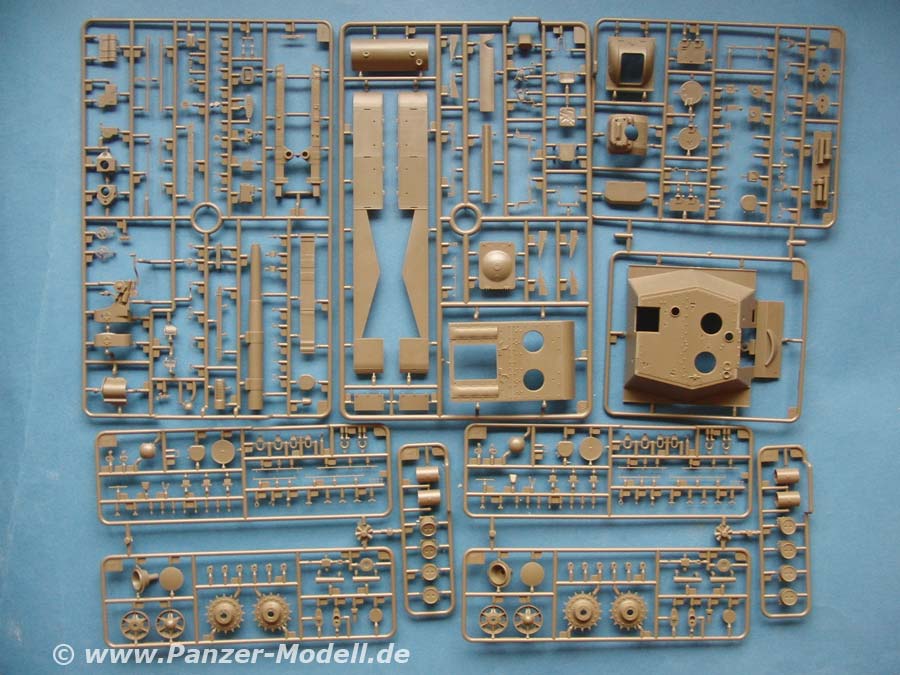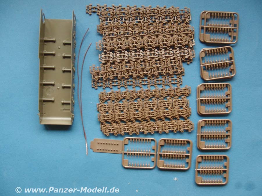 Im Karton finden sich 11 Spritzlinge, Klarsichtteile, die Unterwanne, Einzelkettenglieder mit Steckbolzen, PE Teile, Kabelmaterial und ein Decalbogen.