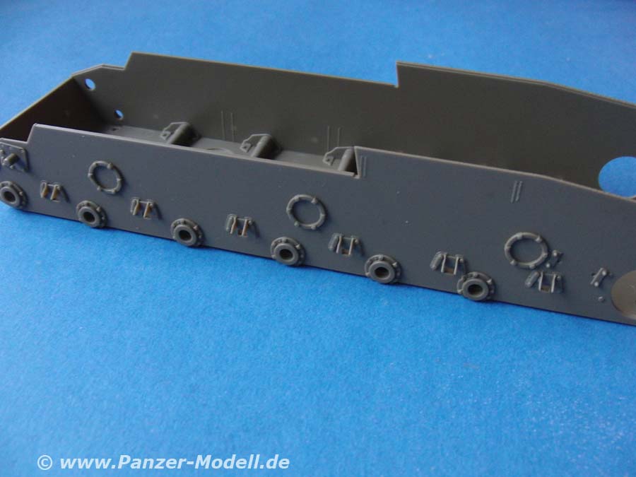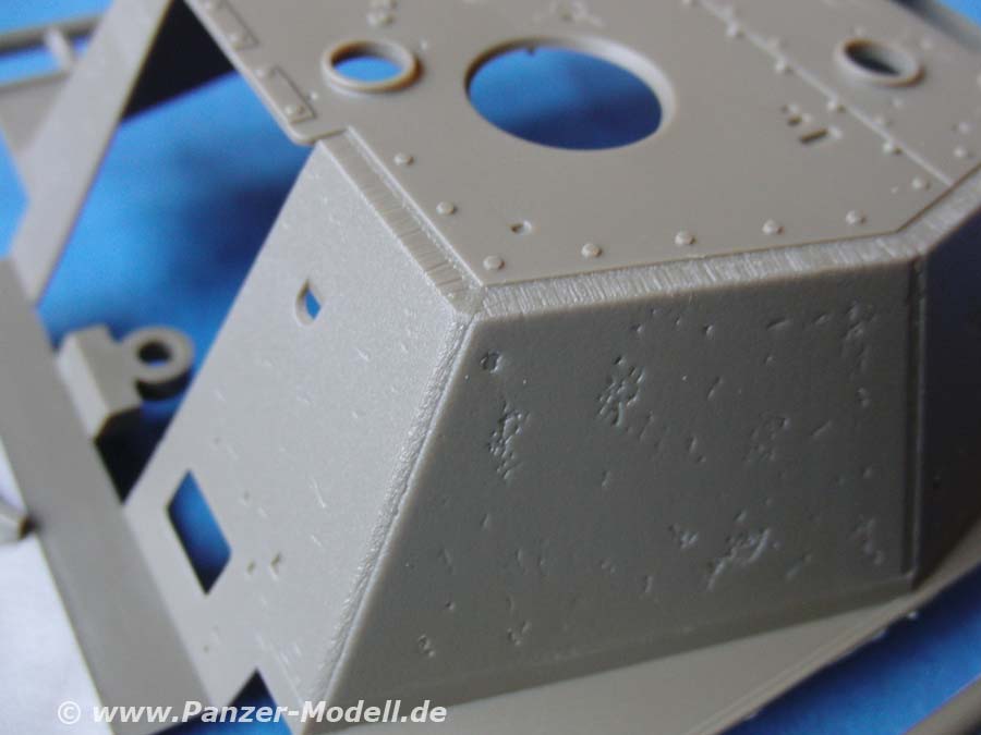 Der Guss der Teile ist wieder sehr sauber und fein gelungen. Die Oberwanne ist mit markanter Gussstruktur dargestellt. Auch wunderschön dargestellt sind die Schnittkanten der Panzerplatten, Schweißnähte und Nietenköpfe.