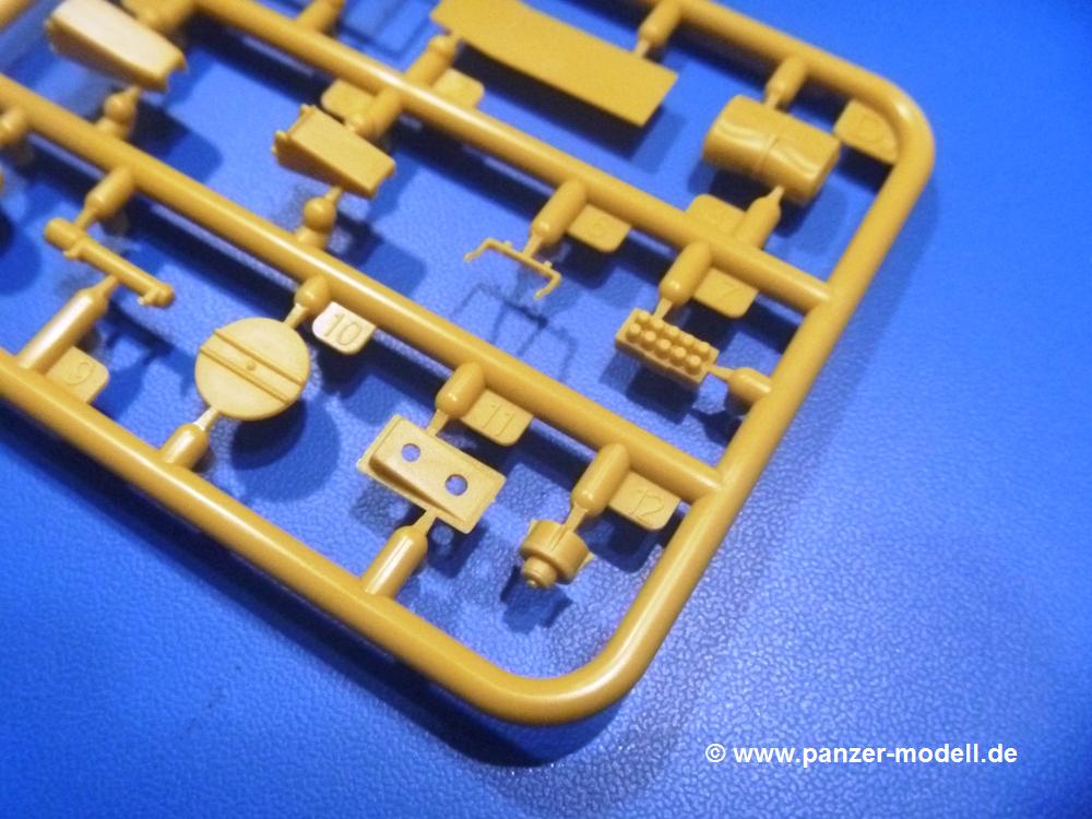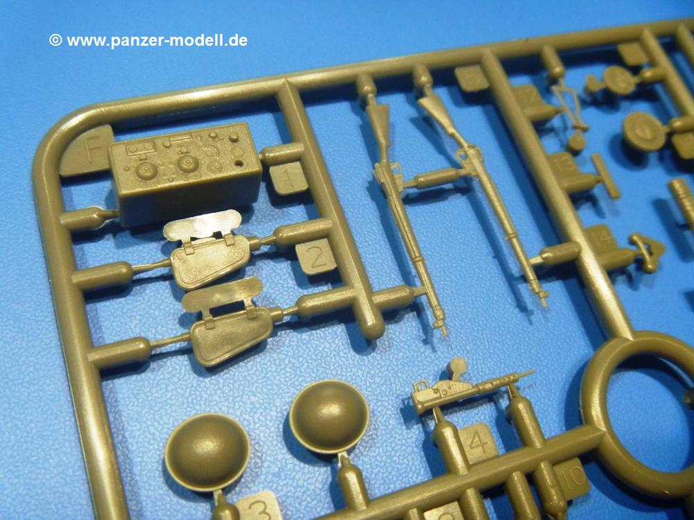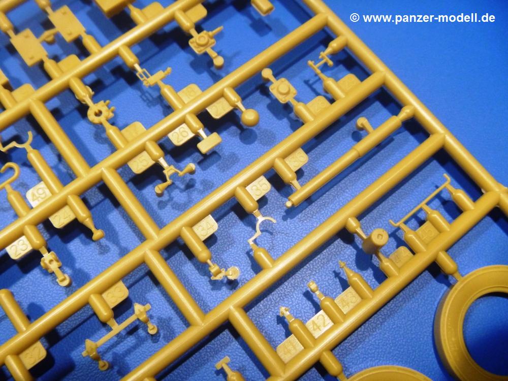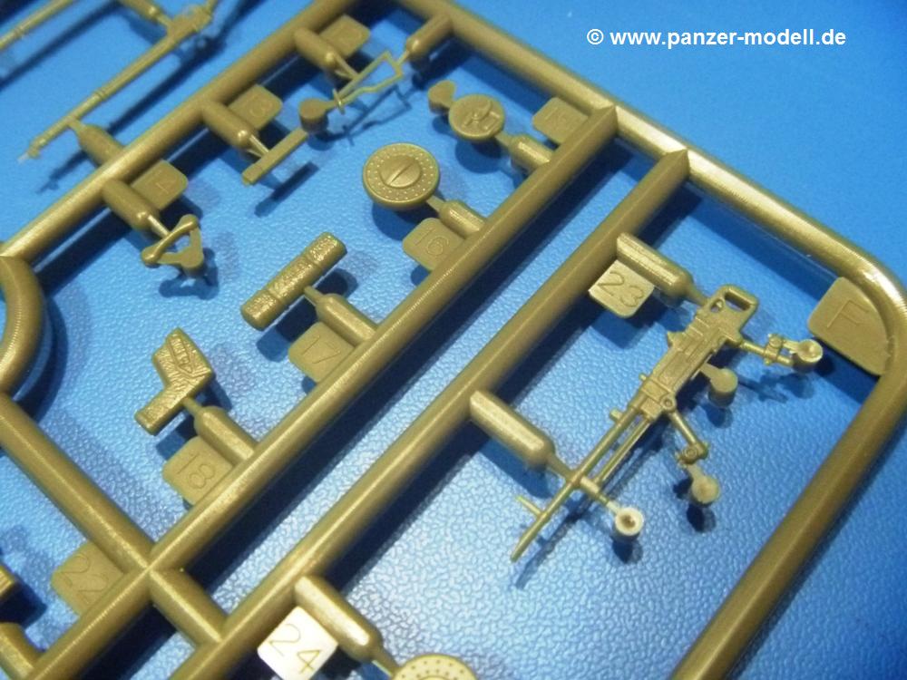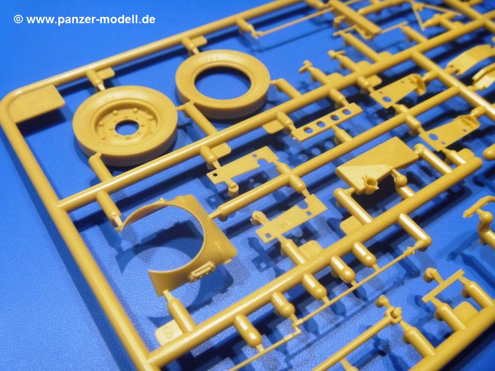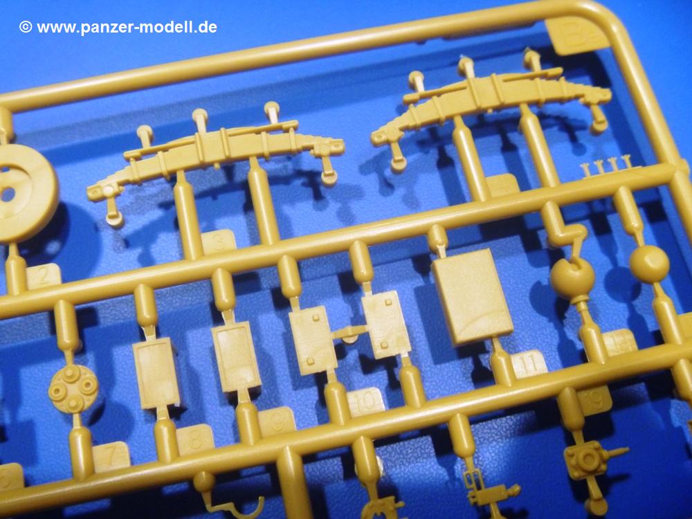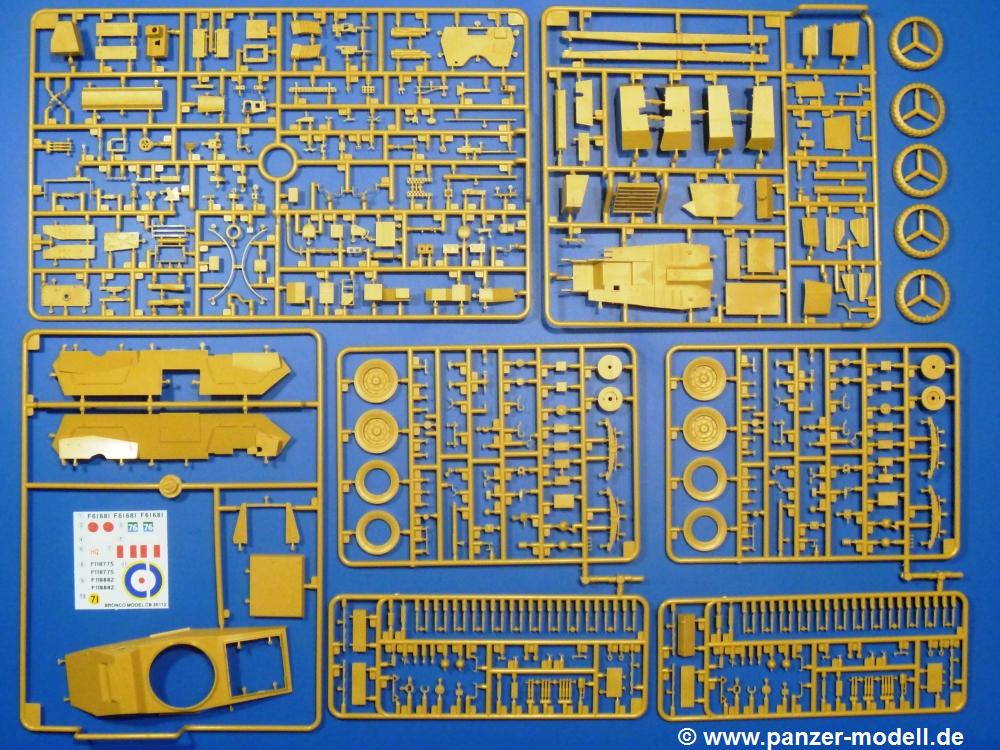 So, wie beschreibt man nun einen Bausatz der Superlative, ohne zu viel oder zu wenig zusagen? Beginnen wir beim Motor. Motorblock und Ölwanne sind selbstverständlich. Der Zylinderkopf ist mit feinen Verschraubungen versehen, Zündkerzenstecker sind angedeutet. Zuluft- und Auspuffkrümmer, Öleinfüllstutzen, Zündspule, Lichtmaschine (Generator), Doppelkeilriemen, -scheiben, Kühlventilator - alles da als separat anzubringende Teile. Allein die Lichtmaschine wird aus 6 Teilen zusammengesetzt und dazu gibt es auch den Keilriemenspanner. Der 6-teilige Kühler glänzt mit feinen Kühlrippen. Bronco hat die Schlauchverbindungen zum Motor nicht vergessen. Vergaser und Luftfilter bilden eine Einheit. Der Luftansaugschlauch führt zum Kampfraum, von wo der Motor sich seine Luft holt. An den Auspuffkrümmer schließt sich das Abgasrohr an, das in einem Schalldämpfer endet. Eigentlich fehlt nur die Verkabelung! An den Motor wird das Kupplungsgehäuse mit dem nachfolgenden Schaltgetriebe angeflanscht, das die Kraft über zwischengeschaltete Fliehkraftkupplungen an das Verteilergetriebe abgibt. Die Gimmicks hierbei sind, dass z.B. vom Allradschalthebel bis zum Verteilergetriebe das komplette Gestänge vorhanden ist. Man kann also am Modell die Verbindungen verfolgen. Vom Verteilergetriebe führen Kardanwellen zu den Achsen, deren Differentialgehäuse auch mit feinen Verschraubungen und Stützrippen ausgestattet sind. An der Hinterachse finden wir ein Bremsgestänge und einen extra Kontroll-/Einfüllstutzen für das Getriebeöl. Die Achsen ruhen auf Blattfederpaketen, die in ihre Lager ohne Klebstoff nur eingeschnappt werden, um die Beweglichkeit zu erhalten. Je Blattfederpaket gibt es noch einen Stoßdämpfer. Während die hinteren Stoßdämpfer sich an Lagern in Motorraum abstützen, bekommen die vorderen separate, außen an der Karosserie anliegende. Die großen Räder sind mehrteilig ausgeführt. Jedes Vorderrad besteht aus 9, jedes Hinterrad aus 6 Teilen! Zum einen dient dies der besseren Detaillierung, zum anderen um die Dreh- und Lenkbarkeit zu erreichen. Das komplette Lenkgestänge ist vorhanden und kann gemäß Anleitung funktionsfähig gebaut werden. Das "Rückgrat" des Fahrzeugs ist der Rahmen, der sich aus Längs-, Stütz- und Querträgern zusammensetzt. Für das Verteilergetriebe gibt noch mal einen mehrteiligen Hilfsrahmen, der in den eigentlichen Rahmen eingepasst wird. Auf dem Rahmen sitzt dann der Fahrzeugboden. Der Kampfraum wird vom Motor durch ein Brandschott getrennt. In dem Schott befindet sich eine Klappe, die geschlossen oder offen gebaut werden kann. Der Trick an der Klappe ist, dass die Besatzung durch sie hindurch greifen konnte, um den Ver-/Entriegelungsmechanismus der großen Motorklappe zu bedienen. Natürlich ist dieser Mechanismus vorhanden und kann aus 8 Teilen in geöffneter oder geschlossener Version gebaut werden. Lässt man die Motorklappe offen, wird man auch später noch sehen können, dass sich neben 2 Tanks auch noch Batteriekasten, Ölnachfüll- und andere Behälter im Motorraum befinden. Auch im Fahrerraum kann man sich austoben, dabei ist der Sitz noch das größte Teil. Schalt-, Feststellbrems- und Allradschalthebel sind vorhanden. Dies gilt auch für mehrteilige Pedalerie. Lenkrad, -stange, -getriebe inkl. Verbindungen zum Lenkgestänge sind da. Die Armaturentafel zeigt Details wie Lichtschalter und Instrumente (Laut Bauschritt 7 liegen Decals für die Instrumente bei. Dem ist aber nicht so!) plus eine Kartenleuchte. Der restliche Innenraum ist mit Feuerlöscher, Munitionskasten, -halterungen, Feldflasche, Leuchtpistole und einigem mehr ausgestattet. Die Seitensichtklappen sind einteilig, aber sehr schön detailliert, die Fahrersichtklappe dafür 14-teilig. Sie kann offen oder geschlossen gebaut werden. Die beiden Seitentüren können geöffnet oder geschlossen gebaut werden. Die rechte kann aber nur bei Option 1 mit dem Ersatzrad auf dem Bug geöffnet werden. Auch der Turm geht als eigenes Modell durch. Natürlich sind Waffen komplett und mit Munitionskästen und Hülsenfangsäcken, -kasten ausgestattet. 3 Sitze der Turmbesatzung, Turmseitenschwenkwerk, Handgranatenhalter aus PE Teilen mit separaten Handgranaten, Abfeuerungsmechanismus der 2 Nebelwurfrohre in der Blende, Seitensichtluken mit Öffnerhebel, Aufbewahrungskästen, Trommelmagazinhalterungen, Turmbelüftung und ein sehr schönes Funkgerät mit Schutzgitter und Verkabelung sind weitere Innendetails. Die Dachwinkelspiegel sind aus Klarsichtmaterial, werden aus mehreren Teilen zusammengesetzt und können gedreht eingebaut werden. Für die faltbaren Turmluken gibt es die Optionen offen oder geschlossen. Für den Suchscheinwerfer an der Turmfront gibt es eine Klarsichtscheibe. Die MG-Rohre sind bereits aufgebohrt, die Blende kann höhenbeweglich gebaut werden, bleibt aber beweglich, nur wenn man im Inneren die Hülsenfangsäcke weglässt oder durch flexibles Material (nicht im Bausatz enthalten) ersetzt. Weitere Details außen am Turm sind die durchbohrten Nebelwurfrohre, die Abdeckung des Turmlüfters, MG-Halterung samt MG und die Antennen. Außen am Fahrzeug finden sich Werkzeuge wie Schaufel, Brechstange, Hackenstiel und Wagenheber, Feuerlöscher, Außenspiegel, Hupe, Begrenzungsleuchten, Fahrscheinwerfer, Hebe- und Zurrösen, eine Halterung für ein Sandblech und dasselbige, verschiedene Stau-, Munitions- und Kraftstoffbehälter und das Ersatzrad. Die Anbringung der letzteren hängt von der Optionswahl ab. Das Abschleppseil aus dem beiliegenden Bindfaden wird mittels 2 Haken in die seitlichen Haltegriffe eingehängt. Der Decalbogen liefert die Außenmarkierungen für vier Fahrzeuge. Es fehlen die Instrumentenanzeigen und die Plaketten für Kästen und Feuerlöscher, die in die Bauschritten zwar angegeben sind, aber nicht auf dem Bogen erscheinen. Varianten: