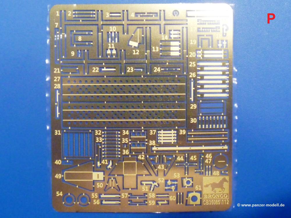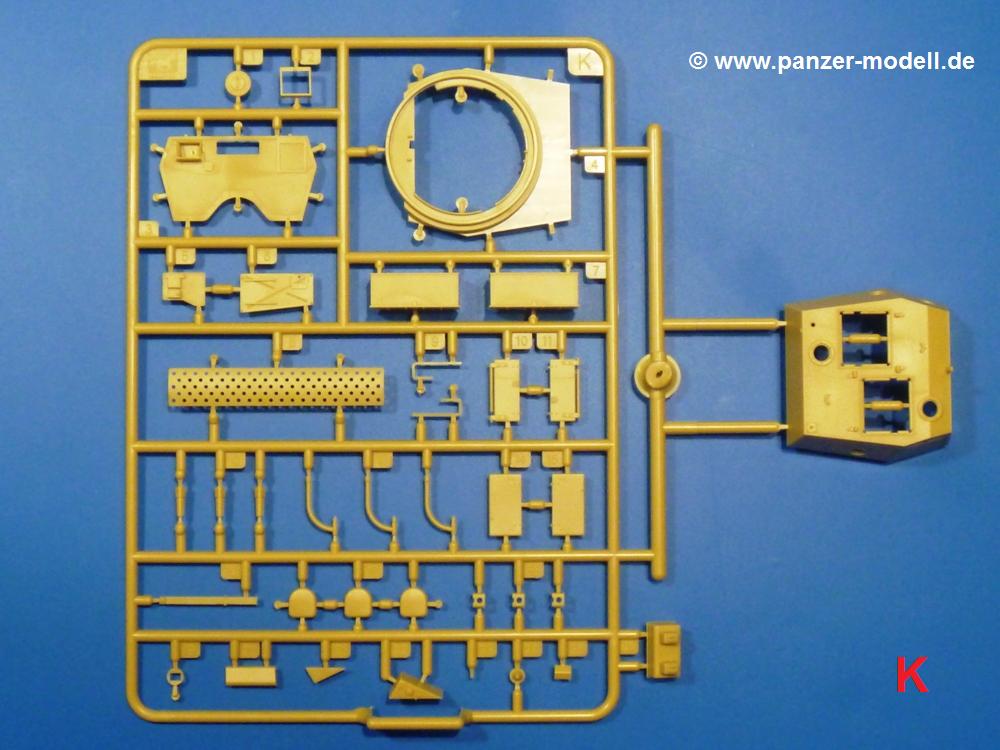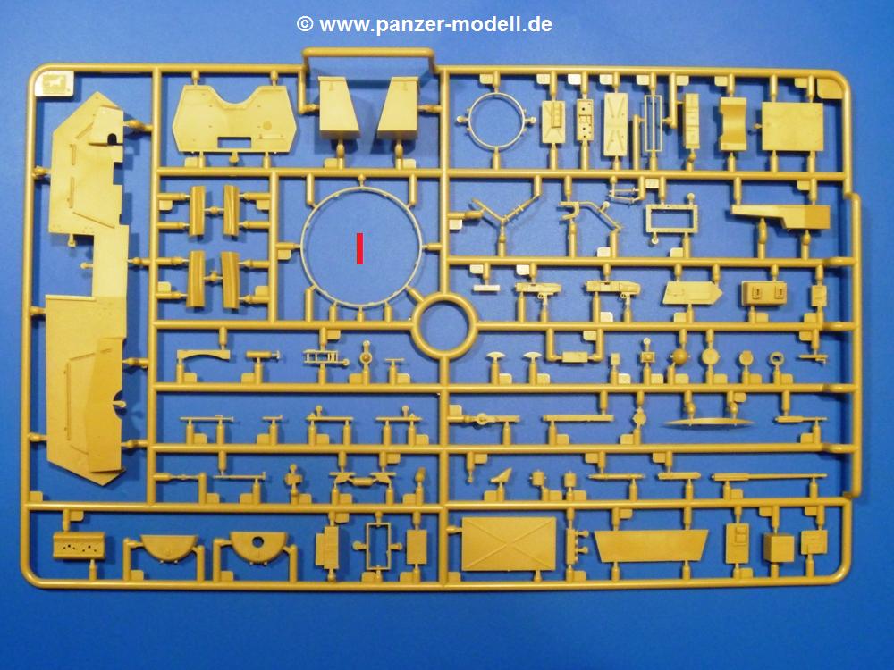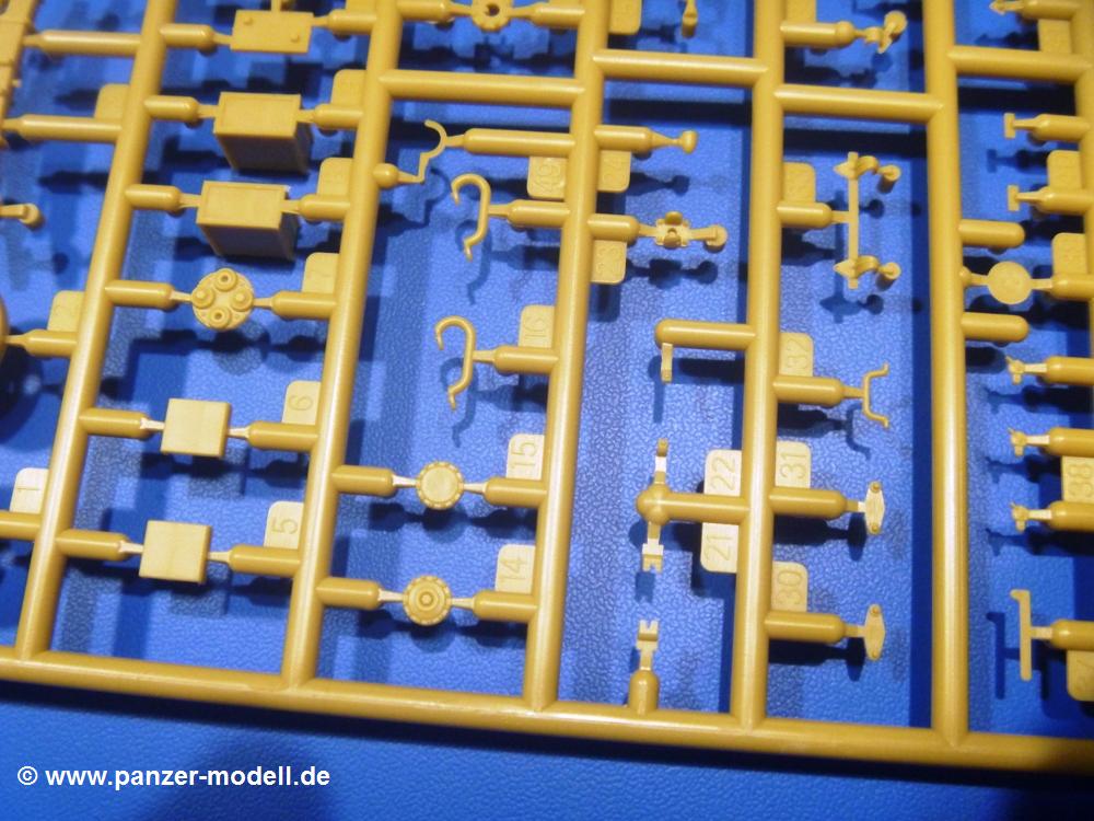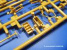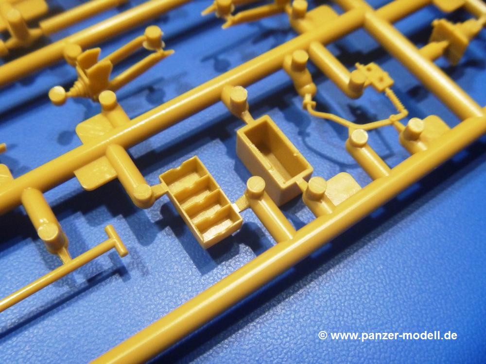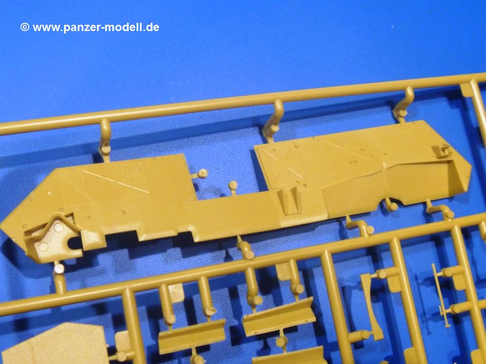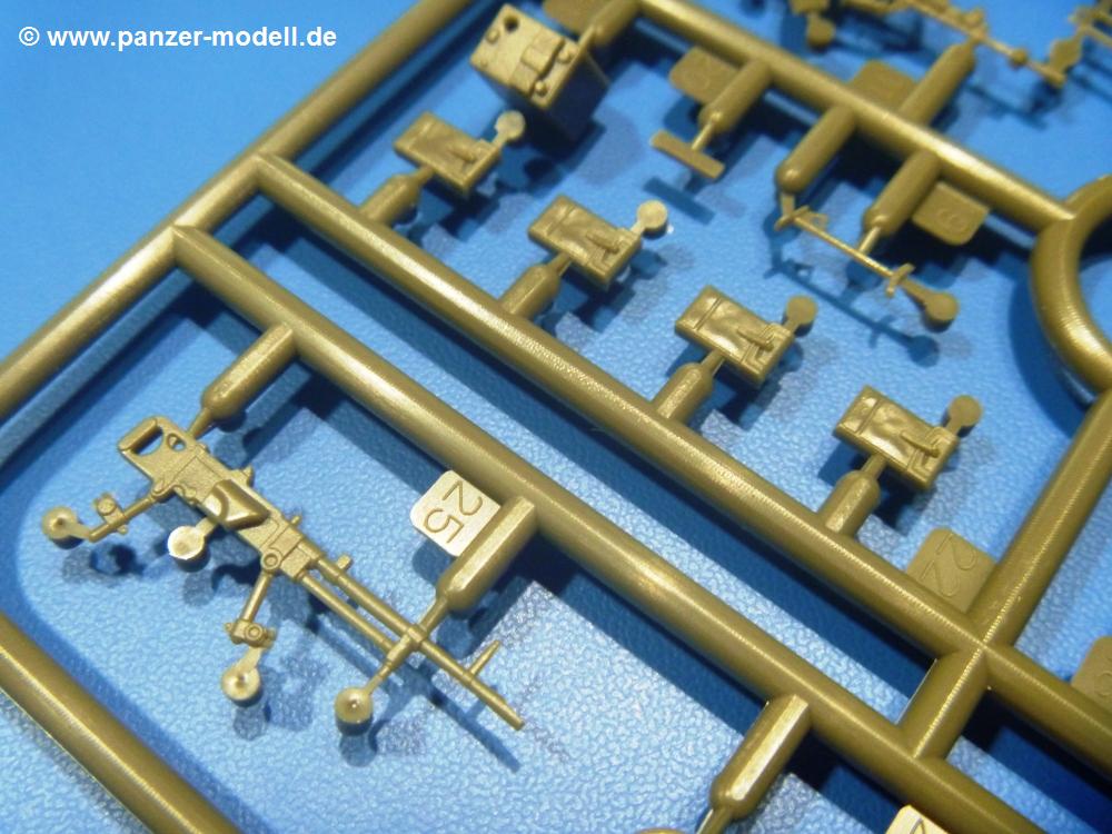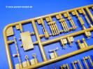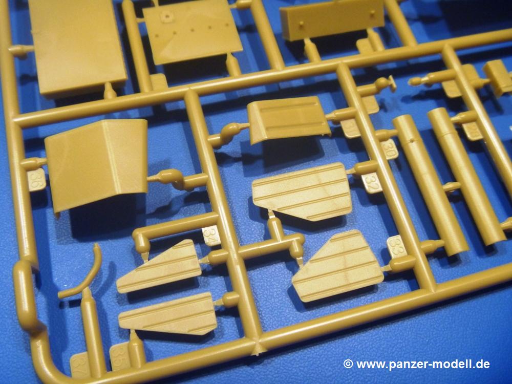So, wie beschreibt man nun einen Bausatz der Superlative, ohne zu viel oder zu wenig zusagen? Beginnen wir beim Motor. Motorblock und Ölwanne sind selbstverständlich. Der Zylinderkopf ist mit feinen Verschraubungen versehen, Zündkerzenstecker sind angedeutet. Zuluft- und Auspuffkrümmer, Öleinfüllstutzen, Zündspule, Lichtmaschine (Generator), Doppelkeilriemen, -scheiben, Kühlventilator - alles da als separat anzubringende Teile. Allein die Lichtmaschine wird aus 6 Teilen zusammengesetzt und dazu gibt es auch den Keilriemenspanner. Der 6-teilige Kühler glänzt mit feinen Kühlrippen. Bronco hat die Schlauchverbindungen zum Motor nicht vergessen. Vergaser und Luftfilter bilden eine Einheit. Der Luftansaugschlauch führt zum Kampfraum, von wo der Motor sich seine Luft holt. An den Auspuffkrümmer schließt sich das Abgasrohr an, das in einem Schalldämpfer endet. Eigentlich fehlt nur die Verkabelung! An den Motor wird das Kupplungsgehäuse mit dem nachfolgenden Schaltgetriebe angeflanscht, das die Kraft über zwischengeschaltete Fliehkraftkupplungen an das Verteilergetriebe abgibt. Die Gimmicks hierbei sind, dass z.B. vom Allradschalthebel bis zum Verteilergetriebe das komplette Gestänge vorhanden ist. Man kann also am Modell die Verbindungen verfolgen. Vom Verteilergetriebe führen Kardanwellen zu den Achsen, deren Differentialgehäuse auch mit feinen Verschraubungen und Stützrippen ausgestattet sind. An der Hinterachse finden wir ein Bremsgestänge und einen extra Kontroll-/Einfüllstutzen für das Getriebeöl. Die Achsen ruhen auf Blattfederpaketen, die in ihre Lager ohne Klebstoff nur eingeschnappt werden, um die Beweglichkeit zu erhalten. Je Blattfederpaket gibt es noch einen Stoßdämpfer. Während die hinteren Stoßdämpfer sich an Lagern in Motorraum abstützen, bekommen die vorderen separate, außen an der Karosserie anliegende. Die großen Räder sind mehrteilig ausgeführt. Jedes Vorderrad besteht aus 9, jedes Hinterrad aus 6 Teilen! Zum einen dient dies der besseren Detaillierung, zum anderen um die Dreh- und Lenkbarkeit zu erreichen. Das komplette Lenkgestänge ist vorhanden und kann gemäß Anleitung funktionsfähig gebaut werden. Das "Rückgrat" des Fahrzeugs ist der Rahmen, der sich aus Längs-, Stütz- und Querträgern zusammensetzt. Für das Verteilergetriebe gibt noch mal einen mehrteiligen Hilfsrahmen, der in den eigentlichen Rahmen eingepasst wird. Auf dem Rahmen sitzt dann der Fahrzeugboden. Der Kampfraum wird vom Motor durch ein Brandschott getrennt. In dem Schott befindet sich eine Klappe, die geschlossen oder offen gebaut werden kann. Der Trick an der Klappe ist, dass die Besatzung durch sie hindurch greifen konnte, um den Ver-/Entriegelungsmechanismus der großen Motorklappe zu bedienen. Natürlich ist dieser Mechanismus vorhanden und kann aus 8 Teilen in geöffneter oder geschlossener Version gebaut werden. Lässt man die Motorklappe offen, wird man auch später noch sehen können, dass sich neben 2 Tanks auch noch Batteriekasten, Ölnachfüll- und andere Behälter im Motorraum befinden. Auch im Fahrerraum kann man sich austoben, dabei ist der Sitz noch das größte Teil. Schalt-, Feststellbrems- und Allradschalthebel sind vorhanden. Dies gilt auch für mehrteilige Pedalerie. Lenkrad, -stange, -getriebe inkl. Verbindungen zum Lenkgestänge sind da. Die Armaturentafel zeigt Details wie Lichtschalter und Instrumente (Laut Bauschritt 7 liegen Decals für die Instrumente bei. Dem ist aber nicht so!) plus eine Kartenleuchte. Der restliche Innenraum ist mit Feuerlöscher, Munitionskasten, -halterungen, Feldflasche, Leuchtpistole und einigem mehr ausgestattet. Die Seitensichtklappen sind einteilig, aber sehr schön detailliert, die Fahrersichtklappe dafür 14-teilig. Sie kann offen oder geschlossen gebaut werden. Die beiden Seitentüren können geöffnet oder geschlossen gebaut werden. Die rechte kann aber nur bei Option 1 mit dem Ersatzrad auf dem Bug geöffnet werden. Auch der Turm geht als eigenes Modell durch. Natürlich sind Waffen komplett und mit Munitionskästen und Hülsenfangsäcken, -kasten ausgestattet. 3 Sitze der Turmbesatzung, Turmseitenschwenkwerk, Handgranatenhalter aus PE Teilen mit separaten Handgranaten, Abfeuerungsmechanismus der 2 Nebelwurfrohre in der Blende, Seitensichtluken mit Öffnerhebel, Aufbewahrungskästen, Trommelmagazinhalterungen, Turmbelüftung und ein sehr schönes Funkgerät mit Schutzgitter und Verkabelung sind weitere Innendetails. Die Dachwinkelspiegel sind aus Klarsichtmaterial, werden aus mehreren Teilen zusammengesetzt und können gedreht eingebaut werden. Für die faltbaren Turmluken gibt es die Optionen offen oder geschlossen. Für den Suchscheinwerfer an der Turmfront gibt es eine Klarsichtscheibe. Die MG-Rohre sind bereits aufgebohrt, die Blende kann höhenbeweglich gebaut werden, bleibt aber beweglich, nur wenn man im Inneren die Hülsenfangsäcke weglässt oder durch flexibles Material (nicht im Bausatz enthalten) ersetzt. Weitere Details außen am Turm sind die durchbohrten Nebelwurfrohre, die Abdeckung des Turmlüfters, MG-Halterung samt MG und die Antennen. Außen am Fahrzeug finden sich Werkzeuge wie Schaufel, Brechstange, Hackenstiel und Wagenheber, Feuerlöscher, Außenspiegel, Hupe, Begrenzungsleuchten, Fahrscheinwerfer, Hebe- und Zurrösen, eine Halterung für ein Sandblech und dasselbige, verschiedene Stau-, Munitions- und Kraftstoffbehälter und das Ersatzrad. Die Anbringung der letzteren hängt von der Optionswahl ab. Das Abschleppseil aus dem beiliegenden Bindfaden wird mittels 2 Haken in die seitlichen Haltegriffe eingehängt. Der Decalbogen liefert die Außenmarkierungen für vier Fahrzeuge. Es fehlen die Instrumentenanzeigen und die Plaketten für Kästen und Feuerlöscher, die in die Bauschritten zwar angegeben sind, aber nicht auf dem Bogen erscheinen. Varianten:
