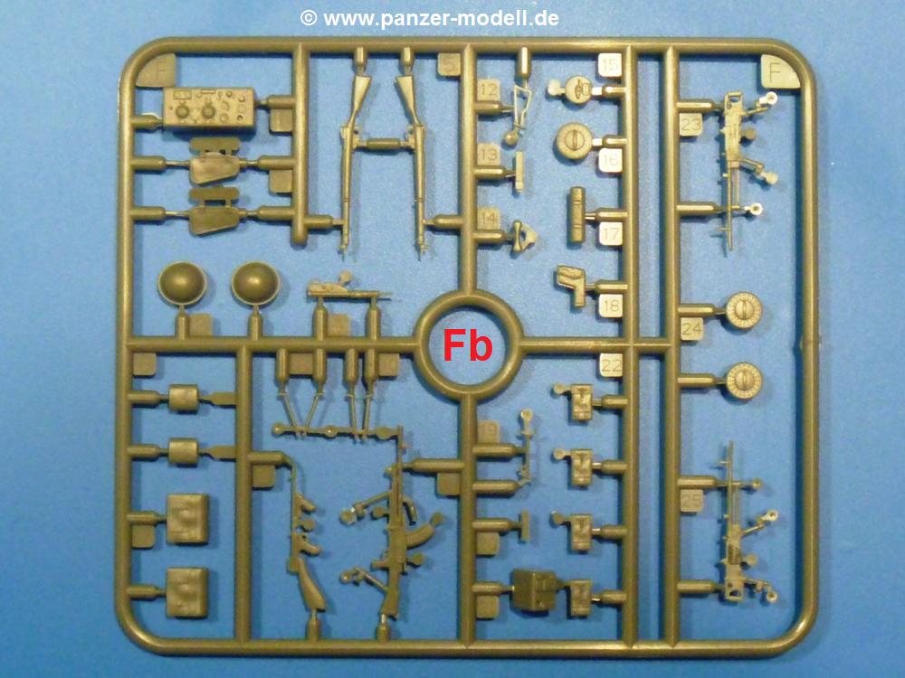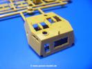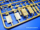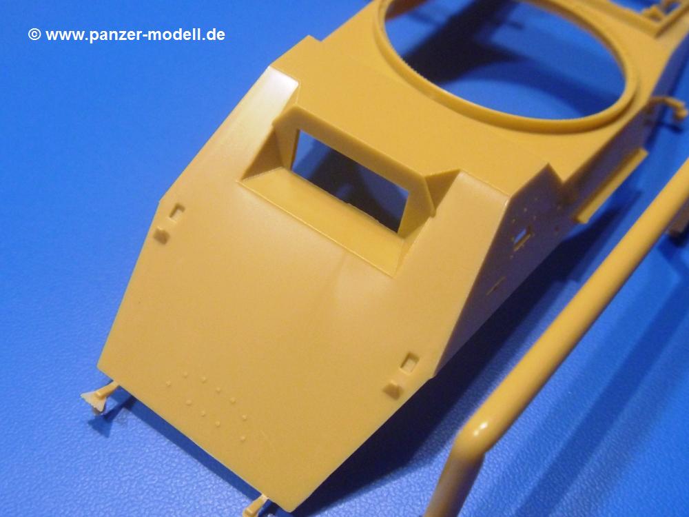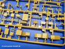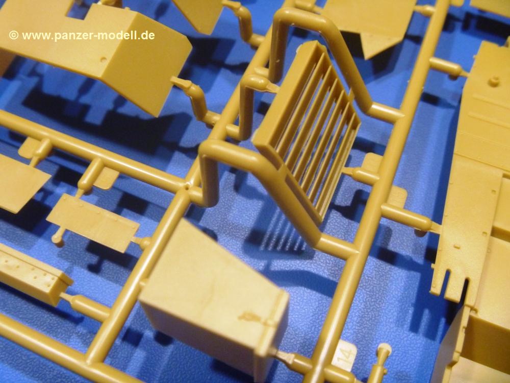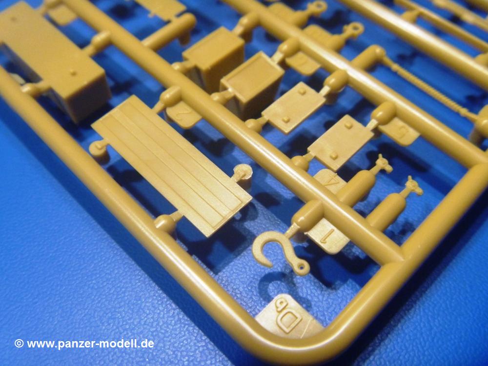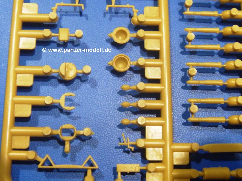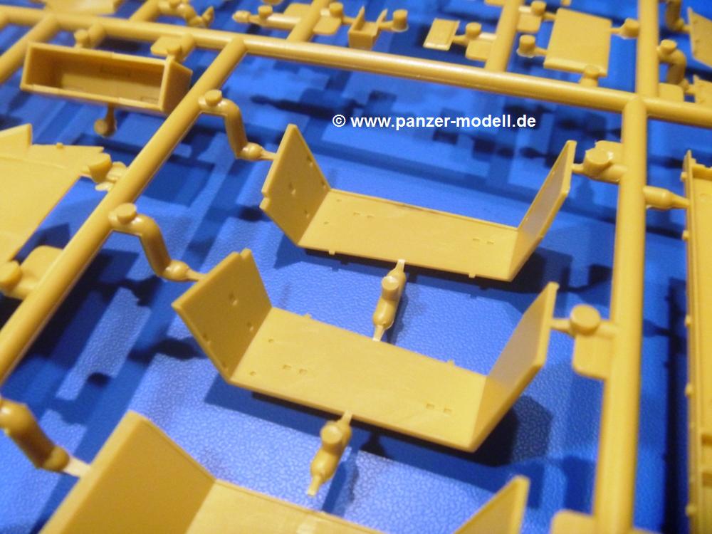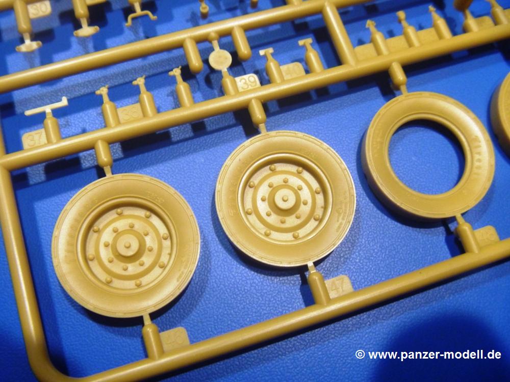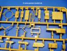 So, wie beschreibt man nun einen Bausatz der Superlative, ohne zu viel oder zu wenig zusagen? Beginnen wir beim Motor. Motorblock und Ölwanne sind selbstverständlich. Der Zylinderkopf ist mit feinen Verschraubungen versehen, Zündkerzenstecker sind angedeutet. Zuluft- und Auspuffkrümmer, Öleinfüllstutzen, Zündspule, Lichtmaschine (Generator), Doppelkeilriemen, -scheiben, Kühlventilator - alles da als separat anzubringende Teile. Allein die Lichtmaschine wird aus 6 Teilen zusammengesetzt und dazu gibt es auch den Keilriemenspanner. Der 6-teilige Kühler glänzt mit feinen Kühlrippen. Bronco hat die Schlauchverbindungen zum Motor nicht vergessen. Vergaser und Luftfilter bilden eine Einheit. Der Luftansaugschlauch führt zum Kampfraum, von wo der Motor sich seine Luft holt. An den Auspuffkrümmer schließt sich das Abgasrohr an, das in einem Schalldämpfer endet. Eigentlich fehlt nur die Verkabelung! An den Motor wird das Kupplungsgehäuse mit dem nachfolgenden Schaltgetriebe angeflanscht, das die Kraft über zwischengeschaltete Fliehkraftkupplungen an das Verteilergetriebe abgibt. Die Gimmicks hierbei sind, dass z.B. vom Allradschalthebel bis zum Verteilergetriebe das komplette Gestänge vorhanden ist. Man kann also am Modell die Verbindungen verfolgen. Vom Verteilergetriebe führen Kardanwellen zu den Achsen, deren Differentialgehäuse auch mit feinen Verschraubungen und Stützrippen ausgestattet sind. An der Hinterachse finden wir ein Bremsgestänge und einen extra Kontroll-/Einfüllstutzen für das Getriebeöl. Die Achsen ruhen auf Blattfederpaketen, die in ihre Lager ohne Klebstoff nur eingeschnappt werden, um die Beweglichkeit zu erhalten. Je Blattfederpaket gibt es noch einen Stoßdämpfer. Während die hinteren Stoßdämpfer sich an Lagern in Motorraum abstützen, bekommen die vorderen separate, außen an der Karosserie anliegende. Die großen Räder sind mehrteilig ausgeführt. Jedes Vorderrad besteht aus 9, jedes Hinterrad aus 6 Teilen! Zum einen dient dies der besseren Detaillierung, zum anderen um die Dreh- und Lenkbarkeit zu erreichen. Das komplette Lenkgestänge ist vorhanden und kann gemäß Anleitung funktionsfähig gebaut werden. Das "Rückgrat" des Fahrzeugs ist der Rahmen, der sich aus Längs-, Stütz- und Querträgern zusammensetzt. Für das Verteilergetriebe gibt noch mal einen mehrteiligen Hilfsrahmen, der in den eigentlichen Rahmen eingepasst wird. Auf dem Rahmen sitzt dann der Fahrzeugboden. Der Kampfraum wird vom Motor durch ein Brandschott getrennt. In dem Schott befindet sich eine Klappe, die geschlossen oder offen gebaut werden kann. Der Trick an der Klappe ist, dass die Besatzung durch sie hindurch greifen konnte, um den Ver-/Entriegelungsmechanismus der großen Motorklappe zu bedienen. Natürlich ist dieser Mechanismus vorhanden und kann aus 8 Teilen in geöffneter oder geschlossener Version gebaut werden. Lässt man die Motorklappe offen, wird man auch später noch sehen können, dass sich neben 2 Tanks auch noch Batteriekasten, Ölnachfüll- und andere Behälter im Motorraum befinden. Auch im Fahrerraum kann man sich austoben, dabei ist der Sitz noch das größte Teil. Schalt-, Feststellbrems- und Allradschalthebel sind vorhanden. Dies gilt auch für mehrteilige Pedalerie. Lenkrad, -stange, -getriebe inkl. Verbindungen zum Lenkgestänge sind da. Die Armaturentafel zeigt Details wie Lichtschalter und Instrumente (Laut Bauschritt 7 liegen Decals für die Instrumente bei. Dem ist aber nicht so!) plus eine Kartenleuchte. Der restliche Innenraum ist mit Feuerlöscher, Munitionskasten, -halterungen, Feldflasche, Leuchtpistole und einigem mehr ausgestattet. Die Seitensichtklappen sind einteilig, aber sehr schön detailliert, die Fahrersichtklappe dafür 14-teilig. Sie kann offen oder geschlossen gebaut werden. Die beiden Seitentüren können geöffnet oder geschlossen gebaut werden. Die rechte kann aber nur bei Option 1 mit dem Ersatzrad auf dem Bug geöffnet werden. Auch der Turm geht als eigenes Modell durch. Natürlich sind Waffen komplett und mit Munitionskästen und Hülsenfangsäcken, -kasten ausgestattet. 3 Sitze der Turmbesatzung, Turmseitenschwenkwerk, Handgranatenhalter aus PE Teilen mit separaten Handgranaten, Abfeuerungsmechanismus der 2 Nebelwurfrohre in der Blende, Seitensichtluken mit Öffnerhebel, Aufbewahrungskästen, Trommelmagazinhalterungen, Turmbelüftung und ein sehr schönes Funkgerät mit Schutzgitter und Verkabelung sind weitere Innendetails. Die Dachwinkelspiegel sind aus Klarsichtmaterial, werden aus mehreren Teilen zusammengesetzt und können gedreht eingebaut werden. Für die faltbaren Turmluken gibt es die Optionen offen oder geschlossen. Für den Suchscheinwerfer an der Turmfront gibt es eine Klarsichtscheibe. Die MG-Rohre sind bereits aufgebohrt, die Blende kann höhenbeweglich gebaut werden, bleibt aber beweglich, nur wenn man im Inneren die Hülsenfangsäcke weglässt oder durch flexibles Material (nicht im Bausatz enthalten) ersetzt. Weitere Details außen am Turm sind die durchbohrten Nebelwurfrohre, die Abdeckung des Turmlüfters, MG-Halterung samt MG und die Antennen. Außen am Fahrzeug finden sich Werkzeuge wie Schaufel, Brechstange, Hackenstiel und Wagenheber, Feuerlöscher, Außenspiegel, Hupe, Begrenzungsleuchten, Fahrscheinwerfer, Hebe- und Zurrösen, eine Halterung für ein Sandblech und dasselbige, verschiedene Stau-, Munitions- und Kraftstoffbehälter und das Ersatzrad. Die Anbringung der letzteren hängt von der Optionswahl ab. Das Abschleppseil aus dem beiliegenden Bindfaden wird mittels 2 Haken in die seitlichen Haltegriffe eingehängt. Der Decalbogen liefert die Außenmarkierungen für vier Fahrzeuge. Es fehlen die Instrumentenanzeigen und die Plaketten für Kästen und Feuerlöscher, die in die Bauschritten zwar angegeben sind, aber nicht auf dem Bogen erscheinen. Varianten: