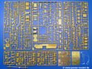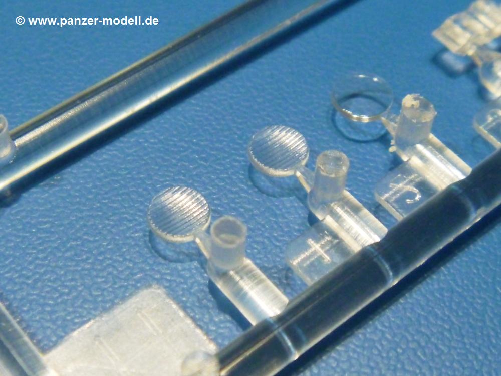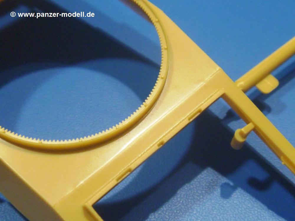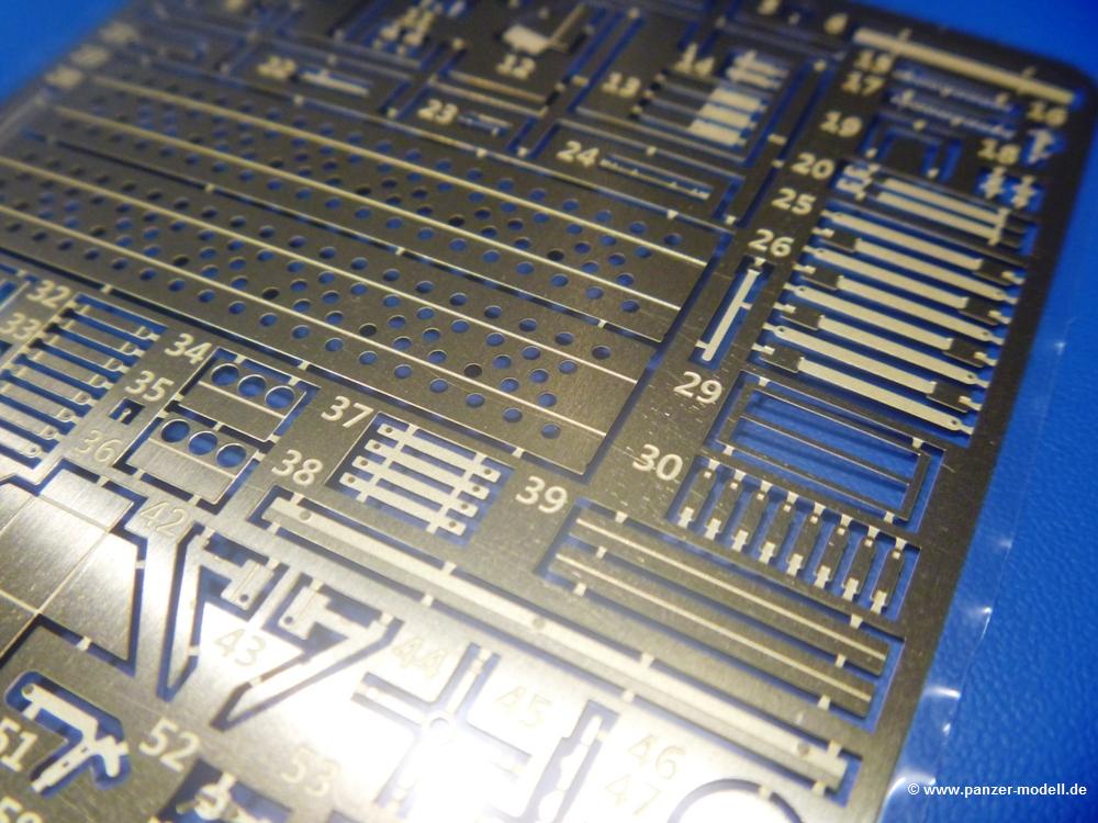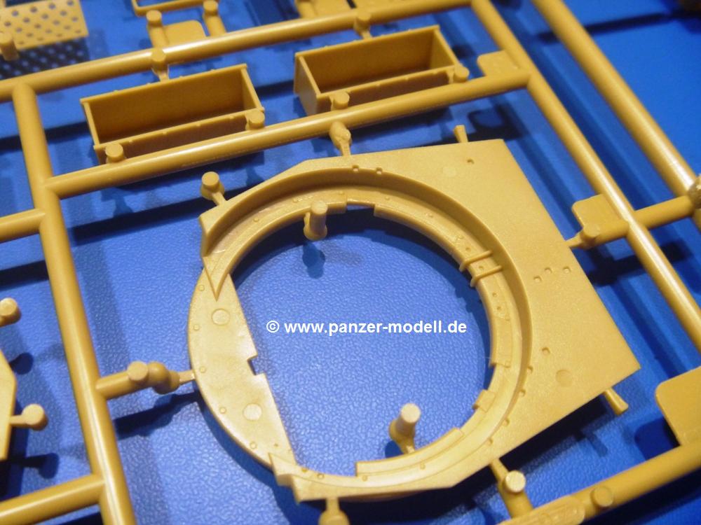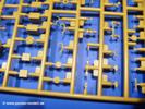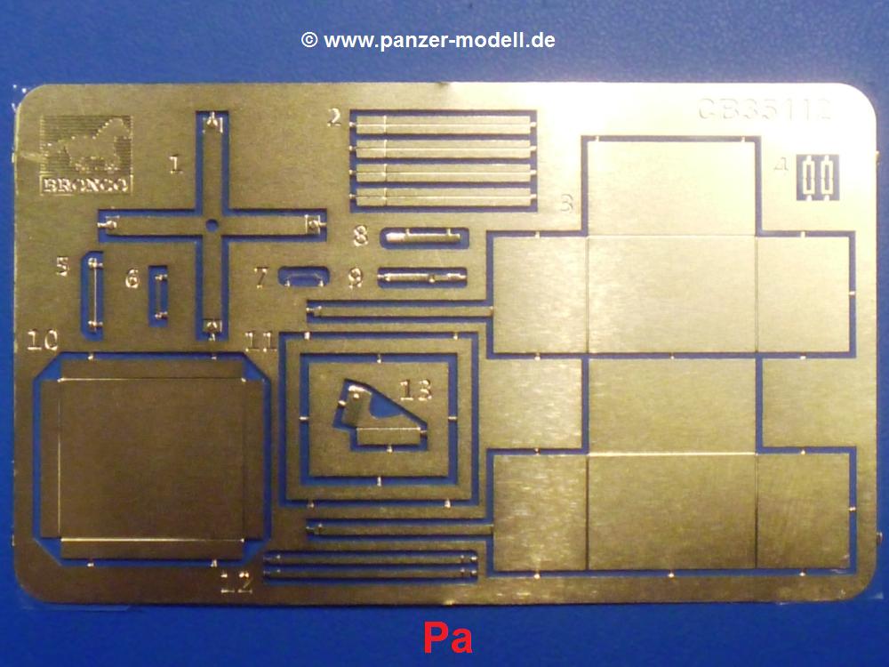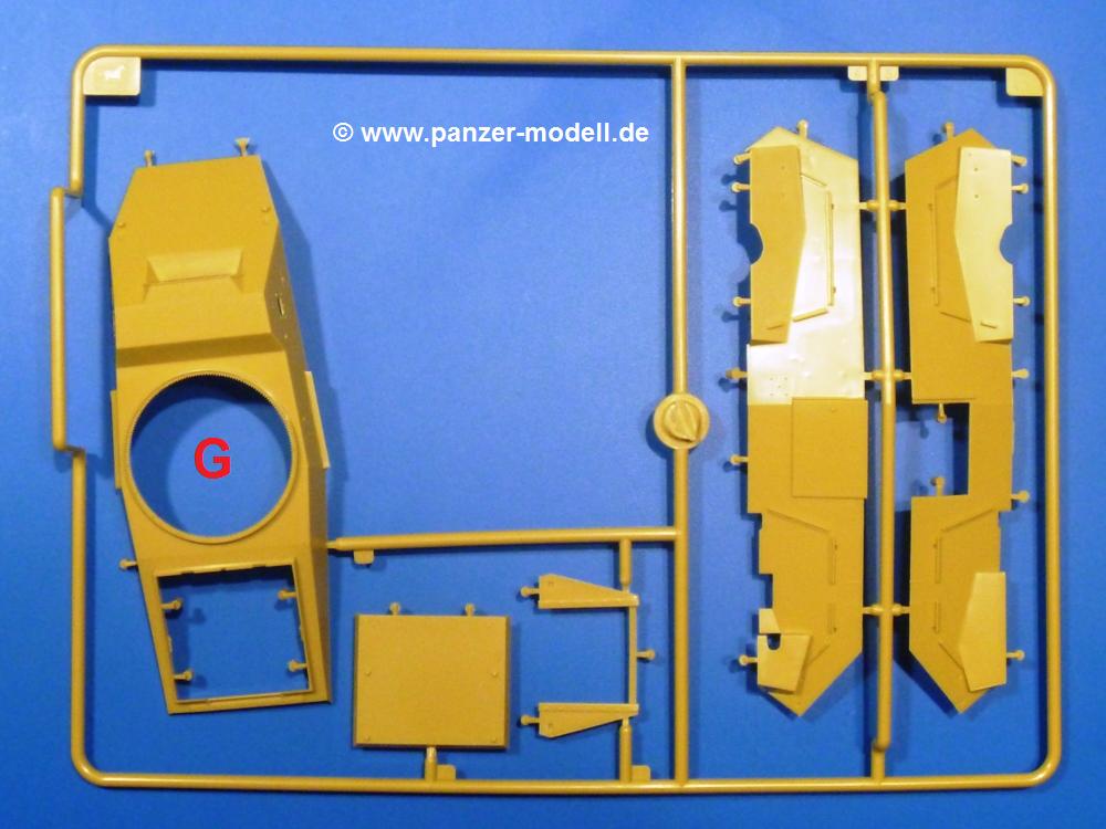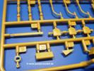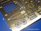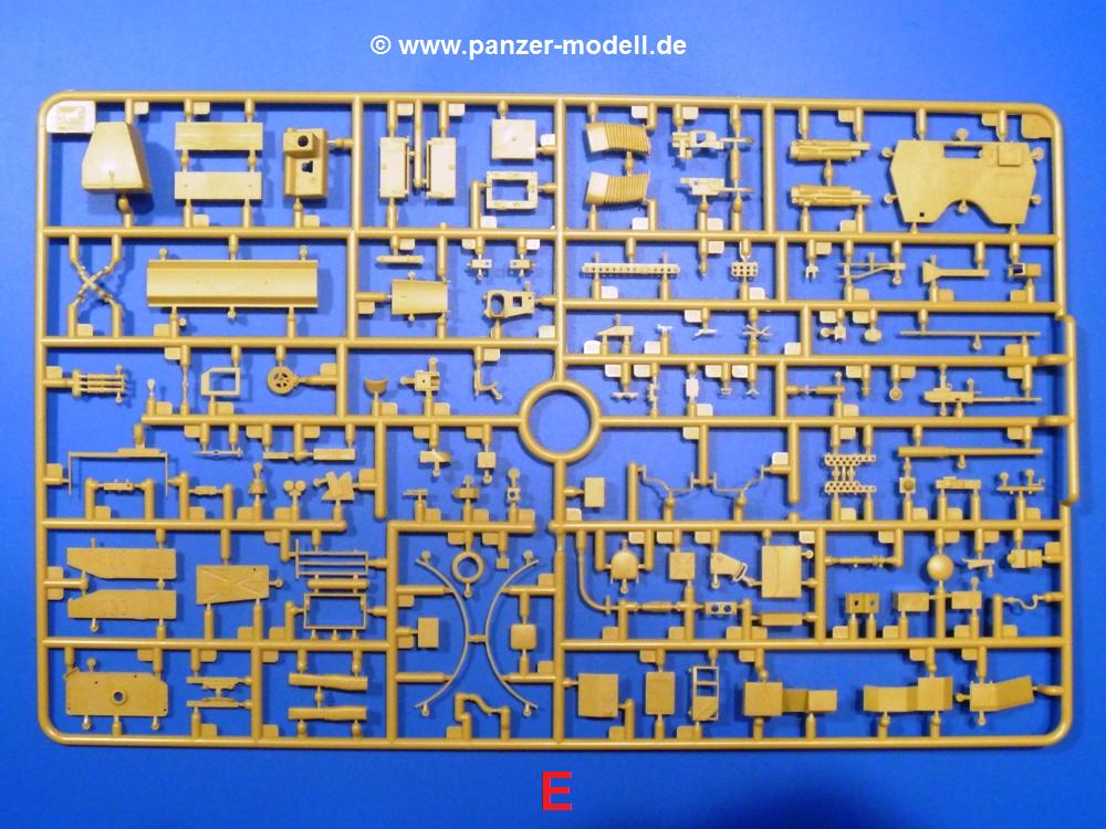 So, wie beschreibt man nun einen Bausatz der Superlative, ohne zu viel oder zu wenig zusagen? Beginnen wir beim Motor. Motorblock und Ölwanne sind selbstverständlich. Der Zylinderkopf ist mit feinen Verschraubungen versehen, Zündkerzenstecker sind angedeutet. Zuluft- und Auspuffkrümmer, Öleinfüllstutzen, Zündspule, Lichtmaschine (Generator), Doppelkeilriemen, -scheiben, Kühlventilator - alles da als separat anzubringende Teile. Allein die Lichtmaschine wird aus 6 Teilen zusammengesetzt und dazu gibt es auch den Keilriemenspanner. Der 6-teilige Kühler glänzt mit feinen Kühlrippen. Bronco hat die Schlauchverbindungen zum Motor nicht vergessen. Vergaser und Luftfilter bilden eine Einheit. Der Luftansaugschlauch führt zum Kampfraum, von wo der Motor sich seine Luft holt. An den Auspuffkrümmer schließt sich das Abgasrohr an, das in einem Schalldämpfer endet. Eigentlich fehlt nur die Verkabelung! An den Motor wird das Kupplungsgehäuse mit dem nachfolgenden Schaltgetriebe angeflanscht, das die Kraft über zwischengeschaltete Fliehkraftkupplungen an das Verteilergetriebe abgibt. Die Gimmicks hierbei sind, dass z.B. vom Allradschalthebel bis zum Verteilergetriebe das komplette Gestänge vorhanden ist. Man kann also am Modell die Verbindungen verfolgen. Vom Verteilergetriebe führen Kardanwellen zu den Achsen, deren Differentialgehäuse auch mit feinen Verschraubungen und Stützrippen ausgestattet sind. An der Hinterachse finden wir ein Bremsgestänge und einen extra Kontroll-/Einfüllstutzen für das Getriebeöl. Die Achsen ruhen auf Blattfederpaketen, die in ihre Lager ohne Klebstoff nur eingeschnappt werden, um die Beweglichkeit zu erhalten. Je Blattfederpaket gibt es noch einen Stoßdämpfer. Während die hinteren Stoßdämpfer sich an Lagern in Motorraum abstützen, bekommen die vorderen separate, außen an der Karosserie anliegende. Die großen Räder sind mehrteilig ausgeführt. Jedes Vorderrad besteht aus 9, jedes Hinterrad aus 6 Teilen! Zum einen dient dies der besseren Detaillierung, zum anderen um die Dreh- und Lenkbarkeit zu erreichen. Das komplette Lenkgestänge ist vorhanden und kann gemäß Anleitung funktionsfähig gebaut werden. Das "Rückgrat" des Fahrzeugs ist der Rahmen, der sich aus Längs-, Stütz- und Querträgern zusammensetzt. Für das Verteilergetriebe gibt noch mal einen mehrteiligen Hilfsrahmen, der in den eigentlichen Rahmen eingepasst wird. Auf dem Rahmen sitzt dann der Fahrzeugboden. Der Kampfraum wird vom Motor durch ein Brandschott getrennt. In dem Schott befindet sich eine Klappe, die geschlossen oder offen gebaut werden kann. Der Trick an der Klappe ist, dass die Besatzung durch sie hindurch greifen konnte, um den Ver-/Entriegelungsmechanismus der großen Motorklappe zu bedienen. Natürlich ist dieser Mechanismus vorhanden und kann aus 8 Teilen in geöffneter oder geschlossener Version gebaut werden. Lässt man die Motorklappe offen, wird man auch später noch sehen können, dass sich neben 2 Tanks auch noch Batteriekasten, Ölnachfüll- und andere Behälter im Motorraum befinden. Auch im Fahrerraum kann man sich austoben, dabei ist der Sitz noch das größte Teil. Schalt-, Feststellbrems- und Allradschalthebel sind vorhanden. Dies gilt auch für mehrteilige Pedalerie. Lenkrad, -stange, -getriebe inkl. Verbindungen zum Lenkgestänge sind da. Die Armaturentafel zeigt Details wie Lichtschalter und Instrumente (Laut Bauschritt 7 liegen Decals für die Instrumente bei. Dem ist aber nicht so!) plus eine Kartenleuchte. Der restliche Innenraum ist mit Feuerlöscher, Munitionskasten, -halterungen, Feldflasche, Leuchtpistole und einigem mehr ausgestattet. Die Seitensichtklappen sind einteilig, aber sehr schön detailliert, die Fahrersichtklappe dafür 14-teilig. Sie kann offen oder geschlossen gebaut werden. Die beiden Seitentüren können geöffnet oder geschlossen gebaut werden. Die rechte kann aber nur bei Option 1 mit dem Ersatzrad auf dem Bug geöffnet werden. Auch der Turm geht als eigenes Modell durch. Natürlich sind Waffen komplett und mit Munitionskästen und Hülsenfangsäcken, -kasten ausgestattet. 3 Sitze der Turmbesatzung, Turmseitenschwenkwerk, Handgranatenhalter aus PE Teilen mit separaten Handgranaten, Abfeuerungsmechanismus der 2 Nebelwurfrohre in der Blende, Seitensichtluken mit Öffnerhebel, Aufbewahrungskästen, Trommelmagazinhalterungen, Turmbelüftung und ein sehr schönes Funkgerät mit Schutzgitter und Verkabelung sind weitere Innendetails. Die Dachwinkelspiegel sind aus Klarsichtmaterial, werden aus mehreren Teilen zusammengesetzt und können gedreht eingebaut werden. Für die faltbaren Turmluken gibt es die Optionen offen oder geschlossen. Für den Suchscheinwerfer an der Turmfront gibt es eine Klarsichtscheibe. Die MG-Rohre sind bereits aufgebohrt, die Blende kann höhenbeweglich gebaut werden, bleibt aber beweglich, nur wenn man im Inneren die Hülsenfangsäcke weglässt oder durch flexibles Material (nicht im Bausatz enthalten) ersetzt. Weitere Details außen am Turm sind die durchbohrten Nebelwurfrohre, die Abdeckung des Turmlüfters, MG-Halterung samt MG und die Antennen. Außen am Fahrzeug finden sich Werkzeuge wie Schaufel, Brechstange, Hackenstiel und Wagenheber, Feuerlöscher, Außenspiegel, Hupe, Begrenzungsleuchten, Fahrscheinwerfer, Hebe- und Zurrösen, eine Halterung für ein Sandblech und dasselbige, verschiedene Stau-, Munitions- und Kraftstoffbehälter und das Ersatzrad. Die Anbringung der letzteren hängt von der Optionswahl ab. Das Abschleppseil aus dem beiliegenden Bindfaden wird mittels 2 Haken in die seitlichen Haltegriffe eingehängt. Der Decalbogen liefert die Außenmarkierungen für vier Fahrzeuge. Es fehlen die Instrumentenanzeigen und die Plaketten für Kästen und Feuerlöscher, die in die Bauschritten zwar angegeben sind, aber nicht auf dem Bogen erscheinen. Varianten: