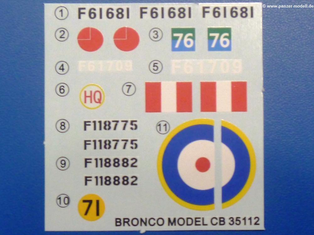 Das Original: 1941 startete die Produktion der ersten Humber Panzerwagen (Humber Armoured Car). Es gab ihn in den Versionen von Mk. I bis Mk. IV. Seine Panzerung war bis zu 15 mm dick. Er wog 5 Tonnen und kam mit seinem 90 PS (67 kW) Benzinmotor auf eine Spitzengeschwindigkeit von 80 km/h. Der Humber war hinterachsgetrieben mit zuschaltbarem Allradantrieb. Seine Bewaffnung bestand aus einem 15 mm Besa-MG, zusätzlich ein 7,62 mm Besa-MG. Ab Mk. III bekam er einen größeren Turm mit zusätzlichem Platz für einen Funker, ab Mk. IV statt dem 15 mm MG eine 37 mm Kanone. Dafür entfiel der Funkerplatz wieder, da die Kanone mehr Platz brauchte. Insgesamt wurden 5.400 Humber Panzerwagen gebaut, 1.650 davon in der Version Mk. III. Seine ersten Einsätze sah er 1941 in Nordafrika und wurde von britischen und kanadischen Streitkräften auf dem europäischen Kriegsschauplatz eingesetzt. Auch bei der Rückeroberung von Burma war er dabei. Nach dem 2. Weltkrieg setzen ihn viele Nationen bis in die frühen 60-er Jahre ein. Der Bausatz: Nach 5 Jahren Pause macht Bronco nun auch beim Humber Armoured Car weiter - diesmal mit der Mk. III Version und auch wie bei den Vorgängern mit voller Inneneinrichtung, d.h. Fahrer-, Kampf- und Motorraum sind mit ihren Innereien ausgestattet. 385 x 245 x 60 mm ist der Karton groß. In ihm befinden sich 14 sandgelbe, 1 olivgrüner, 1 Klarsichtspritzling, 5 Reifen, 2 PE-Platinen, 1 Stück Bindfaden und ein Decalbogen. Die Bauanleitung im A4 Format hat 32 Seiten. Die Spritzlinge sind wie folgt aufgeteilt: