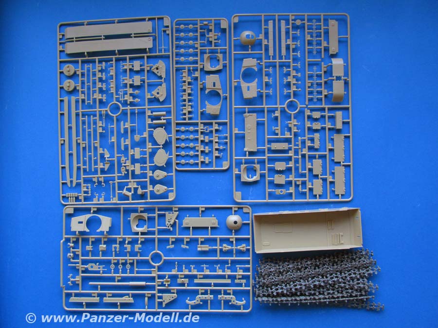 Im Karton finden sich 12 Spritzlinge, Klarsichtteile, die Unterwanne, Aufbau, Einzelkettenglieder, PE Teile und ein Decalbogen.