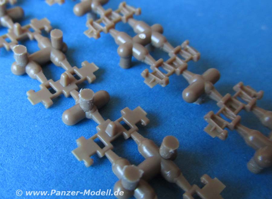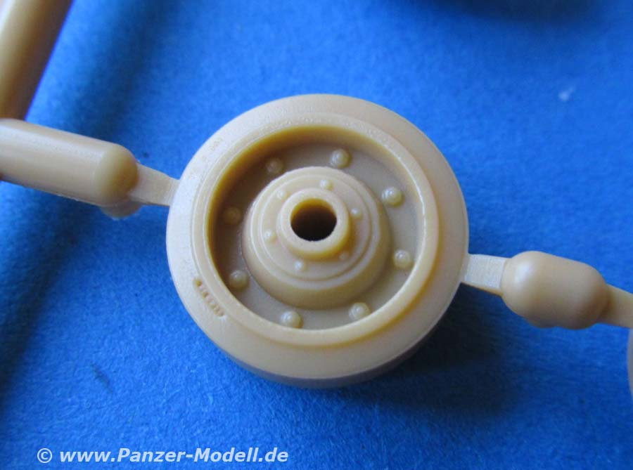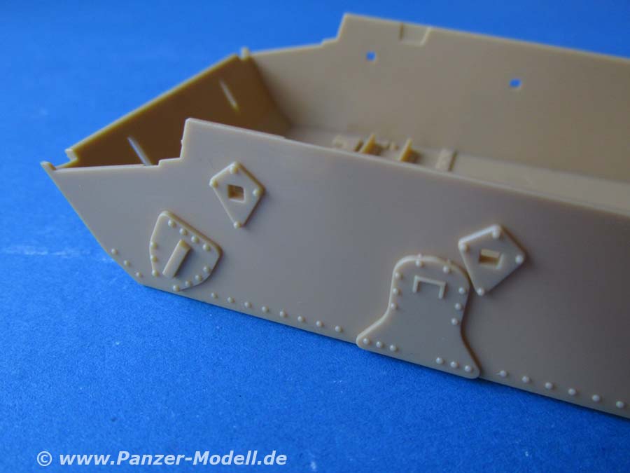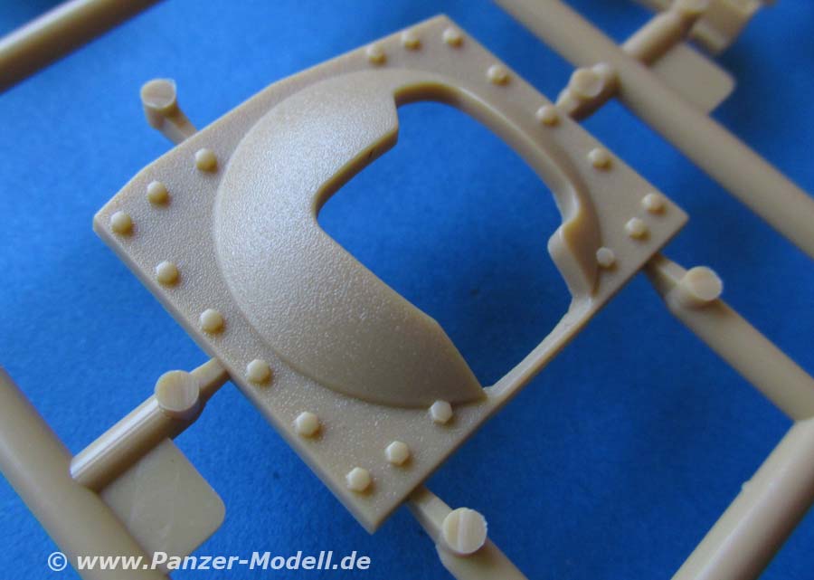 Auch dieser Bausatz erfreut mit seiner umfangreichen Ausstattung und Detaillierung. Der Guss der Teile ist wirklich hervorragend fein und sauber. Allein die unzähligen verschieden großen Nietenreihen an allen Bereichen des Panzers sind eine echte Augenweide.