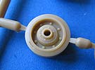 Die Unterwanne beherbergt zum einen einen Innenraum für den Fahrer und ein recht umfangreiches Laufwerk mit zwei großen Blattfederpaketen mit je 4 kleinen Doppellaufrollen. Das ganze sieht dehr fein und detailliert aus. Die Kette ist such hier eine bewegliche Einzelgliedkette. Diese ist sehr fein und vor allem ohne Auswerferstellen. Die einzelnen Kettenglieder sind an je drei Angusspunkten in einer Reihe und nicht in einem starren Spritzlingsrahmen untergebracht.
