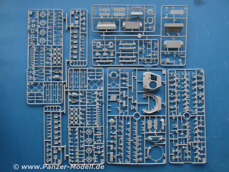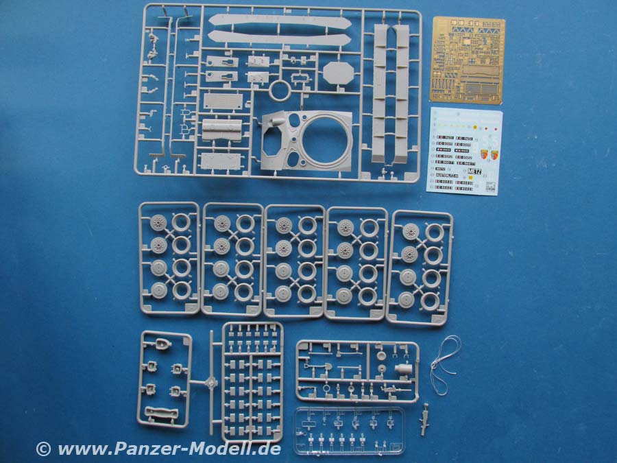 Im Karton finden sich 20 Spritzlinge, Klarsichtteile, die Unterwanne, Leit- und Triebräder, zwei verschiedene Einzelkettenglieder, PE Teile, Seilmaterial und ein Decalbogen.