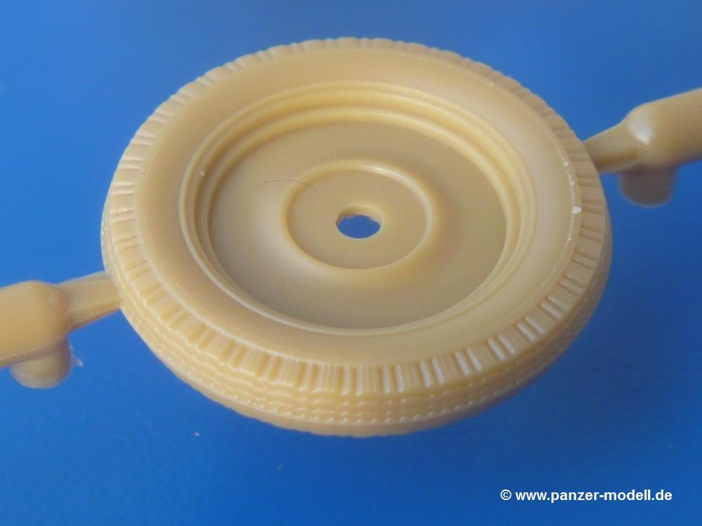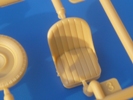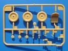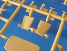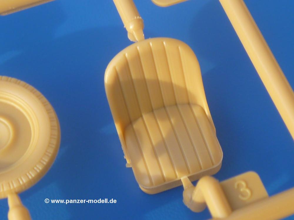 Räder, Radkappen, Sitze und Pedale finden wir an den beiden sandgelben B Spritzlingen. Das Profil der 6 Räder (man braucht nur 4) ist sehr schön wiedergegeben. Enttäuschend ist hier das Fehlen der am Original recht auffälligen Ventile. Wer auf dieses Detail nicht verzichten möchte, kann sich aber mit dünnem Draht oder heißgezogenem Plastik behelfen. Dafür punkten wieder die Radkappen mit dem FIAT Druck und die geriffelten Sitze sehen recht gut aus. Die Pedale kann man erst für Grat am Spritzling halten, so winzig sind sie. Wenn das nicht maßstabsgerecht ist.