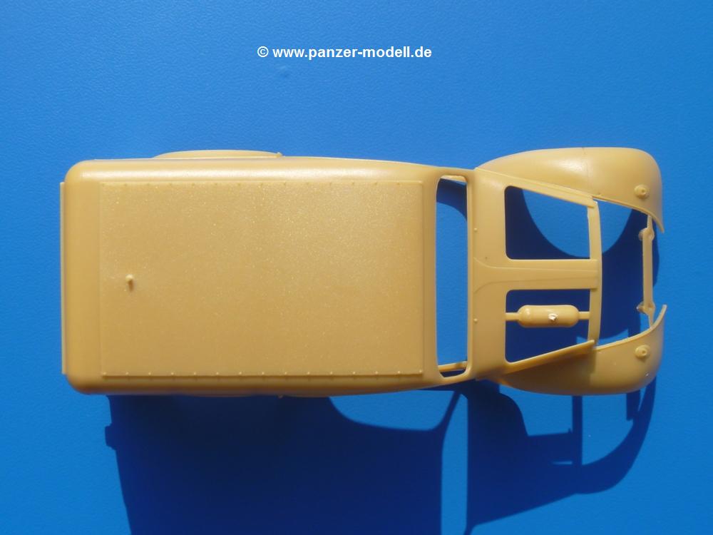 Die Karosserie F ist, von den Auswerferspuren innen am Dach abgesehen, fehlerfrei aus einem Stück gespritzt. Das Dach war beim Original wohl ein mit Druckknöpfen ausgesetztes Stoffverdeck. Zumindest lässt die Struktur und die Knöpfe am Rand des Verdecks am Model darauf schließen. Leider konnte ich keine Originalaufnahmen ausfindig machen.