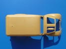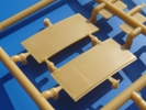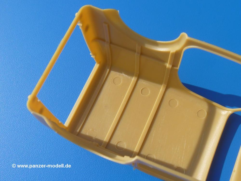 Der neue Unterboden findet sich am Spritzling J. Man kann zwischen Links- und Rechtslenkerversion (z.B. für Linksverkehr in England) wählen. Die Ansatzpunkte für die Pedale und die Lenkstange der Linkslenkerversion sind im Fahrgastraum am Boden erkennbar. Für die Rechtslenkerversion muss man die Löcher aufbohren. Man findet die Ansatzpunkte von der Motorraumseite her. Die Hecktüren sind leicht gewölbt und von glaubhafter Materialstärke. Lattenroste als Verstärkung der Türen und des Lieferwagenaufbaus werden separat angebracht und erhöhen den Realitätsgrad. Ohne Heckfenster ist die "Rücksicht" schwierig, daher gibt es zusätzlich 2 winzigste Außenspiegel mit Halterung. Der einzelne Griff der Hecktür ist grad mal 3 Millimeter klein.