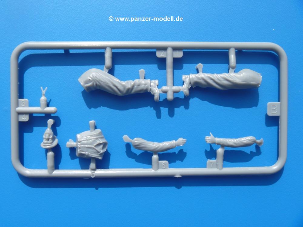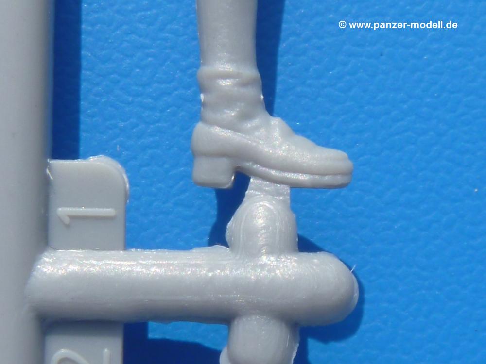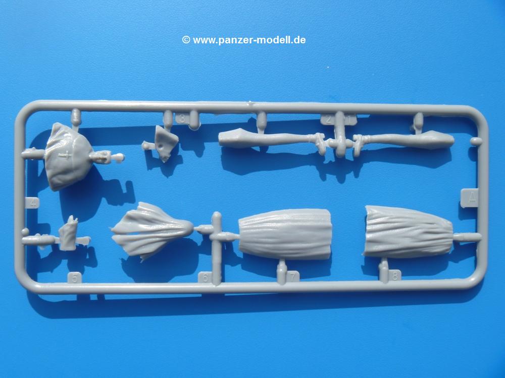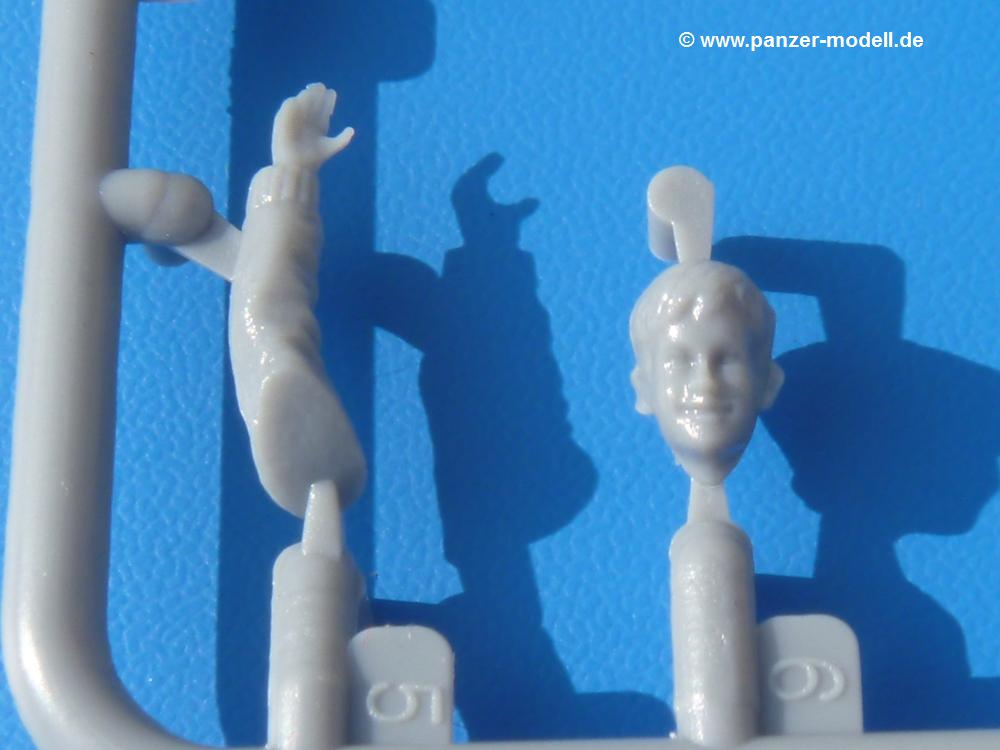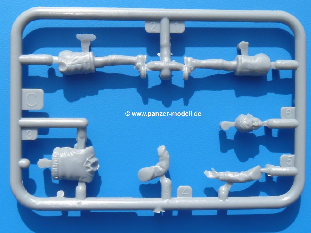 Diesmal sind 3 zivile Figuren dem Bausatz beigelegt. Die Nonne (grauer Spritzling A) besteht aus 8 Teilen - den beiden Beinen, Vorder- und Rückseite des Habits, den weiten Ärmeln mit den Händen, dem Oberkörper mit Ordenskreuz und dem Kopf und dem Schleier. Die Gesichtsdetails sind etwas schwammig, aber der Faltenwurf der Kleidung und Details der Schuhe sind gut. Der Nonne zur Seite steht ein kleiner Junge (grauer Spritzling C) bestehend aus den beiden Beinen inkl. Unterkörper, den Armen, Oberkörper und Kopf. Den Abschluss bildet der Lieferwagenfahrer, der mit dem Ein-/Ausladen der Milchkannen beschäftig ist. Seine Gesichtszüge mit dem freundlichen Lächeln finde ich gelungen. Auch er besteht aus den beiden Beinen inkl. Unterkörper, den Armen, Oberkörper und Kopf. Am Kopf ist eine Baskenmütze angegossen. Der hintere Verschluss seiner Hosenträger ist das 7. Teil der Figur.