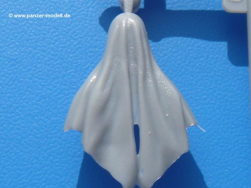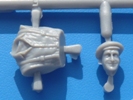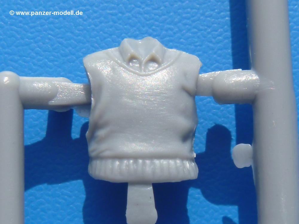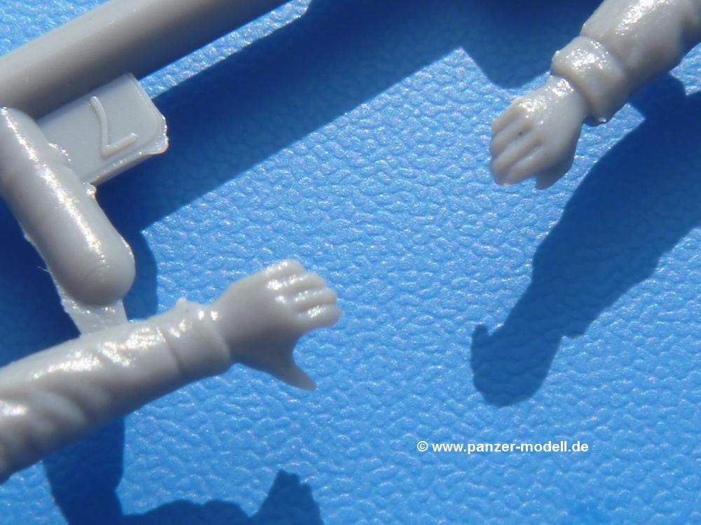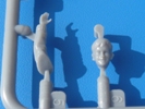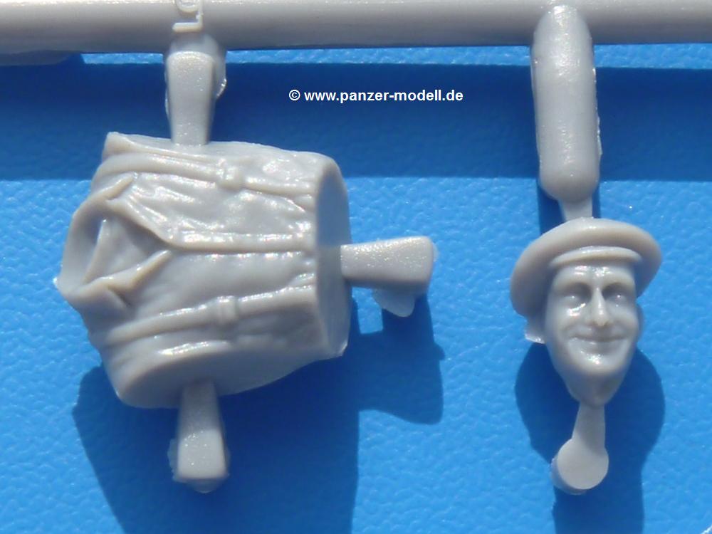Diesmal sind 3 zivile Figuren dem Bausatz beigelegt. Die Nonne (grauer Spritzling A) besteht aus 8 Teilen - den beiden Beinen, Vorder- und Rückseite des Habits, den weiten Ärmeln mit den Händen, dem Oberkörper mit Ordenskreuz und dem Kopf und dem Schleier. Die Gesichtsdetails sind etwas schwammig, aber der Faltenwurf der Kleidung und Details der Schuhe sind gut. Der Nonne zur Seite steht ein kleiner Junge (grauer Spritzling C) bestehend aus den beiden Beinen inkl. Unterkörper, den Armen, Oberkörper und Kopf. Den Abschluss bildet der Lieferwagenfahrer, der mit dem Ein-/Ausladen der Milchkannen beschäftig ist. Seine Gesichtszüge mit dem freundlichen Lächeln finde ich gelungen. Auch er besteht aus den beiden Beinen inkl. Unterkörper, den Armen, Oberkörper und Kopf. Am Kopf ist eine Baskenmütze angegossen. Der hintere Verschluss seiner Hosenträger ist das 7. Teil der Figur.