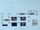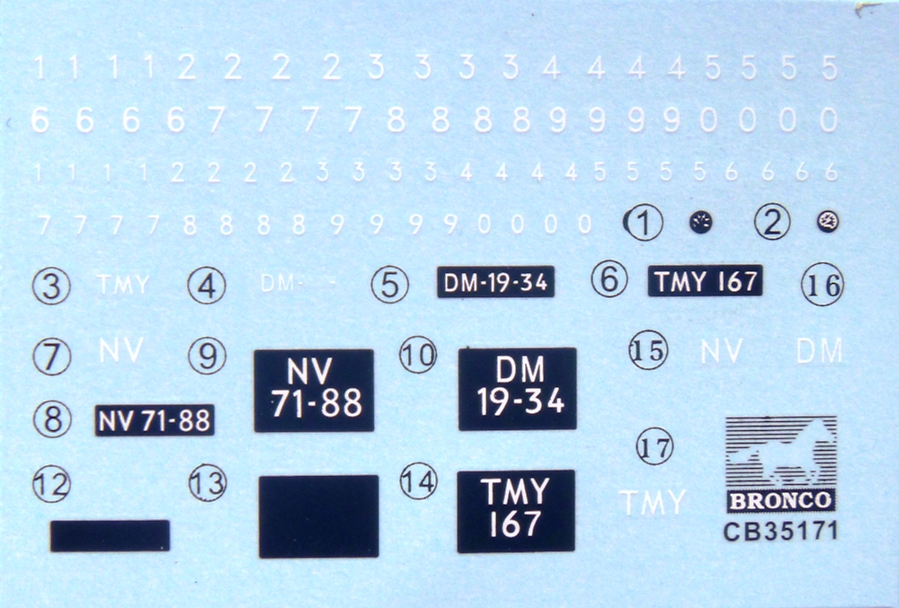 Der Decalbogen besteht zum einen aus schwarzen Nummernschildern mit separaten Buchstaben und Zahlen. Man kann sich also jede beliebige Nummer selbst zusammenstellen, sollte aber ein Maß an Geduld und Ruhe mitbringen, um die Ziffern an die richtige Stelle zu bringen. Wem das zu mühsam ist, der kann aus 3 fertigen Kennzeichen auswählen. Für das Armaturenbrett gibt es 2 Anzeigen.