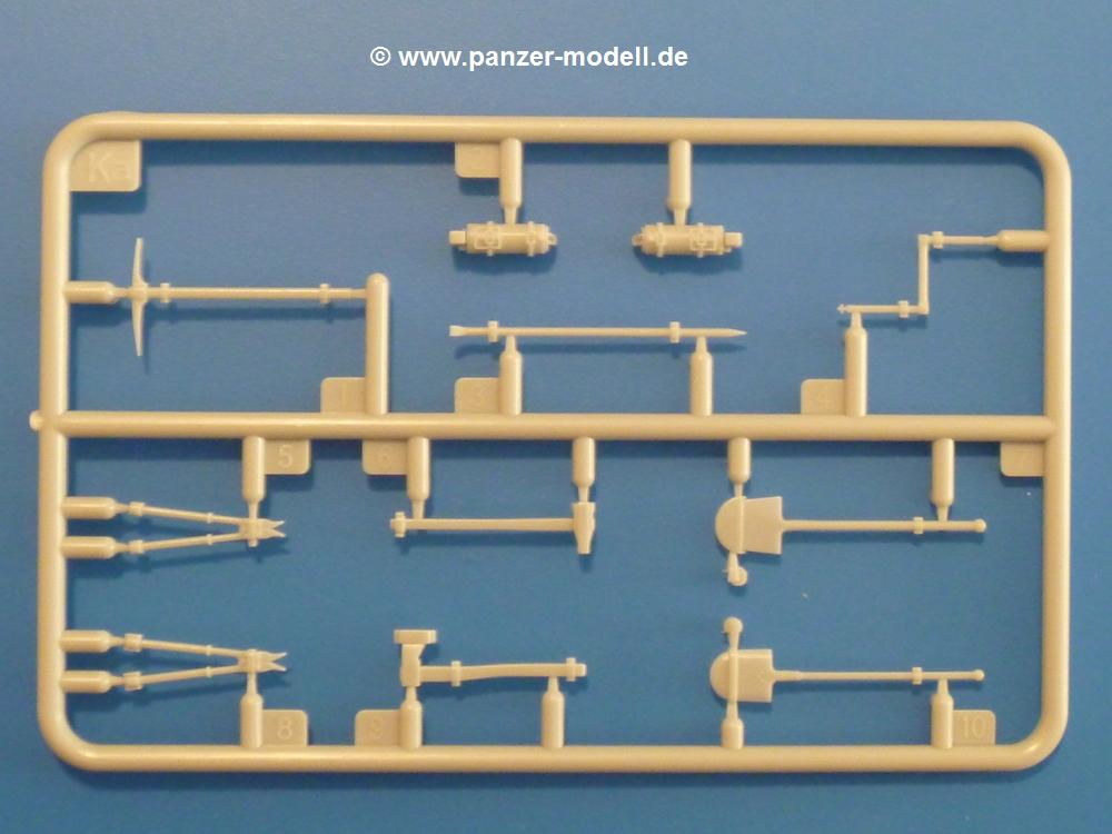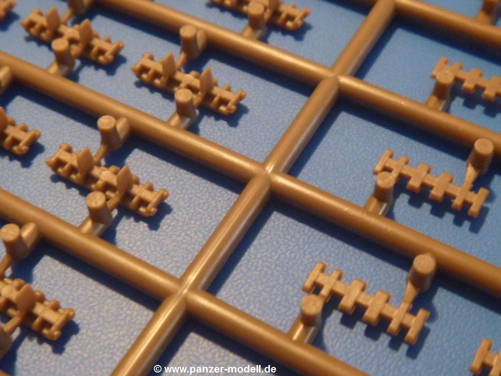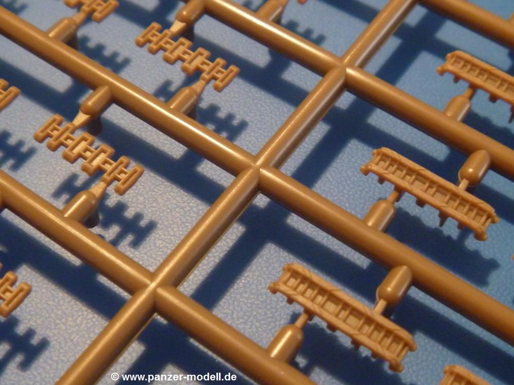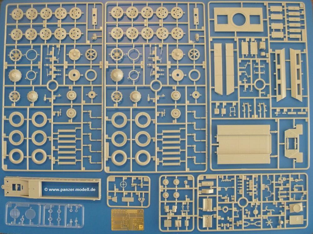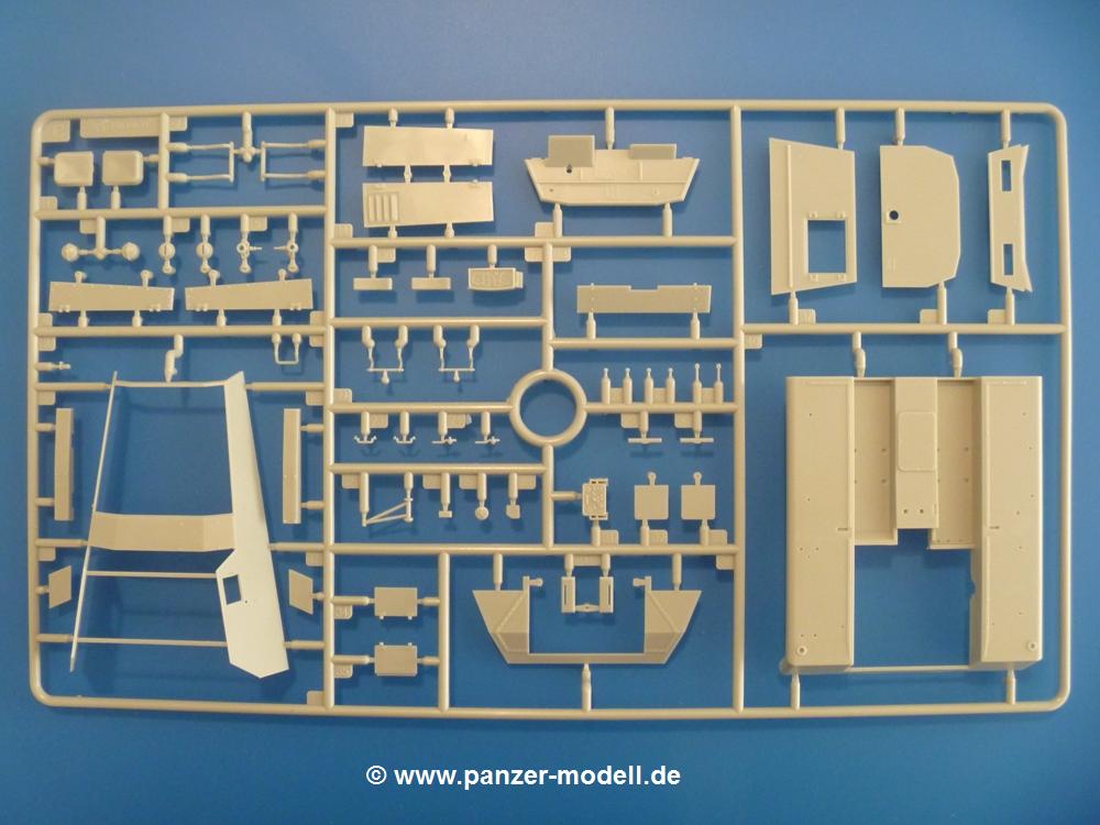 Dem sWS mit Panzerwerfer 42 folgt nun die ungepanzerte Transportversion.Es sind im Karton 10 sandgelbe, 2 durchsichtige und 2 braune Spritzlinge vorhanden. Dazu kommt das Untergestell, 1 kleiner Ätzteil- und ein Abziehbilderbogen (Decals) und eine 14-seitige Bauanleitung im A4 Format.Die Spritzlinge sind wie folgt aufgeteilt: