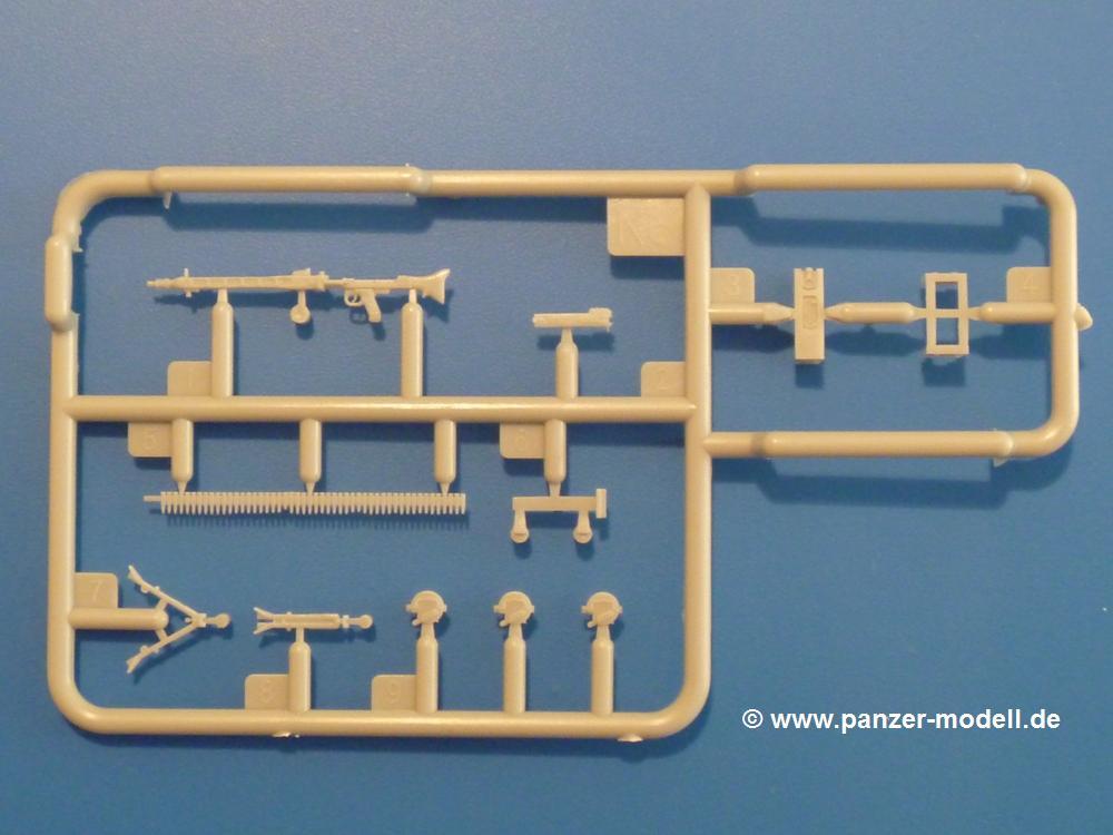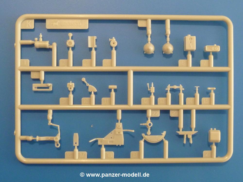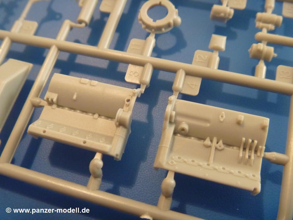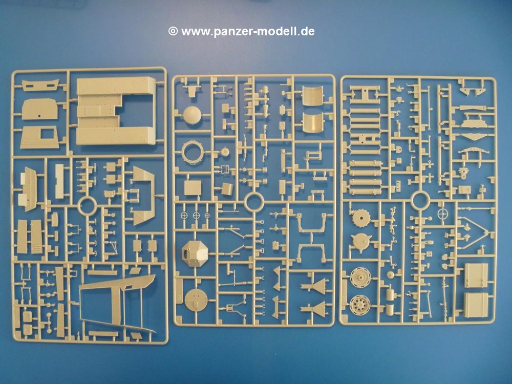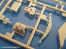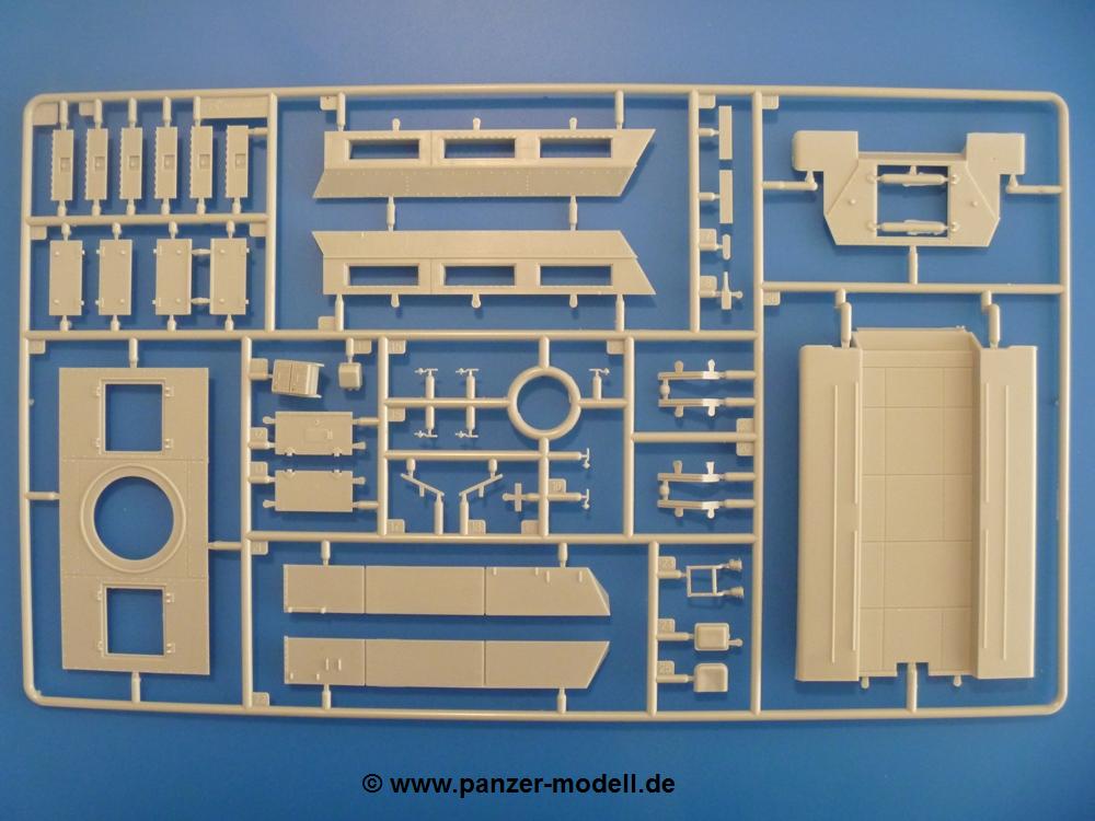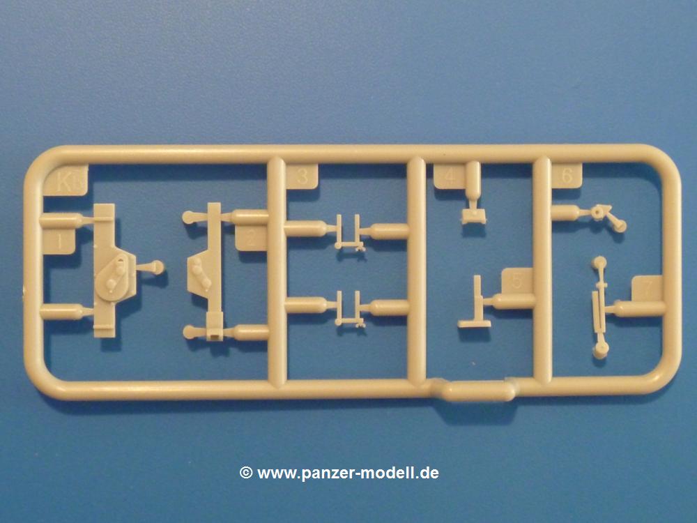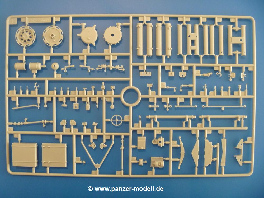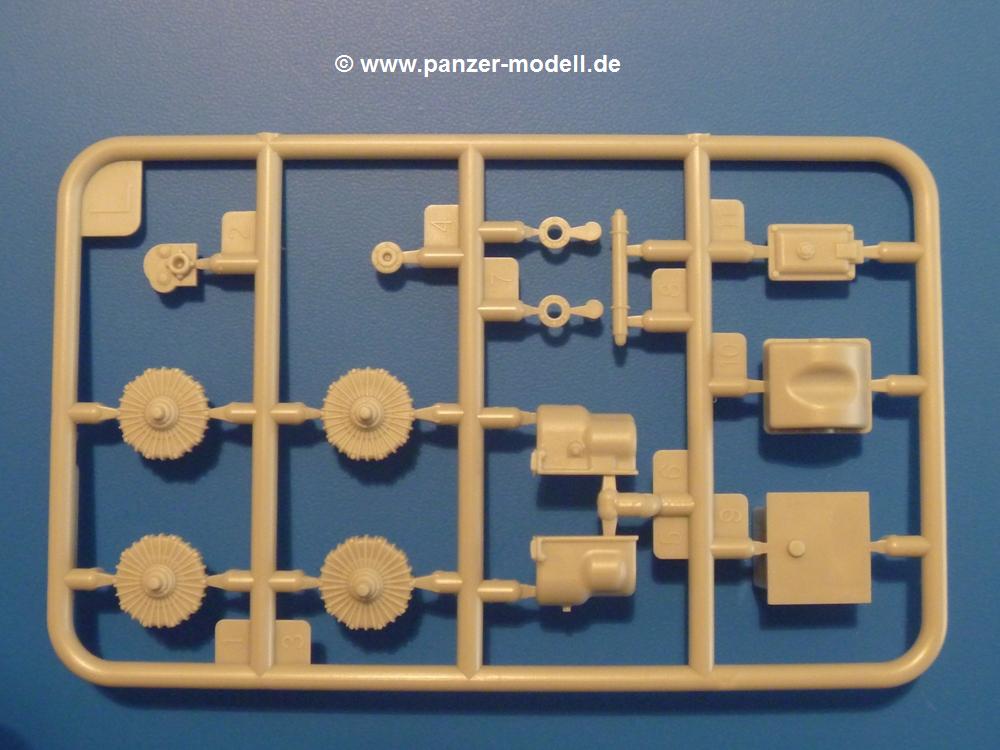 Gemäß meinen Informationen handelt es sich auch bei diesem Bausatz um ein ehemaligen Great Wall Hobby Modell. Alle Teile sind sauber gespritzt, ohne Sinkstellen, Versatz, Fischhäute oder Grat.Der Unterrahmen besteht aus einem großen Teil, in das die aus Hälften zusammengesetzten Drehstabkörper eingesetzt werden. Allein diese machen 7 Unterbaugruppen aus. Dazu kommen Schwingarme und die Achsen der hinteren Spannrollen mit der schönen Spindel des Kettenspanners. Die Vorderachse mit der schönen, querliegenden Blattfeder erlaubt eine eingeschlagene Stellung der Räder. Jedes Vorderrad besteht aus Felge, Einsatz, Nabe und 6 Reifenscheiben zur besseren Darstellung des Profils. Der Herstelleraufdruck auf den Reifenflanken fehlt auch hier. Es liegen 2 verschiedene Größen der Antriebszahnräder bei. Die Bauanleitung stellt einen vor die Wahl, welche Gräße man verwenden möchte. Bei den Laufrollen handelt es sich um die späten Scheibenräder mit je 5 Durchbrüchen. Die Schraubenköpfe machen mir einen etwas flachen Eindruck. Die Einzelgliederkette wird wohl etwas Arbeit machen. 112 Glieder pro Seite, immer wechselweise mit Zähnen und ohne, müssen zusammengefügt werden. Dafür bekommt man aber auch Kette mit schönen Details. Einige gut gestaltete Teile wie der Tank, die Luftdruckbehälter, Getriebe für Seilwinde und Seilführungen verschwinden im Rahmen und werden später kaum noch einzusehen sein. Dann ist es auch nicht schlimm, wenn man die Winde ganz weglässt, da sowieso der gepanzerte sWS im Original angeblich keine Seilwinde mehr hatte.Der originale sWS hat eine seitlich liegende Ölwanne und den Unterboden geschlossen. Bei ersten Bronco sWS hatte der Motor noch eine untenliegende Ölwanne. Jetzt ist der Unterboden zwar immer noch offen (mit Plastikkarte verschließen), aber der Spritzling M enthält die Korrekturteile für den Motor (flache Bodenplatte für den Motor, seitliche Ölwanne, andere Keilriemen etc). Wie angesprochen, der Motor mit Lichtmaschine, Luftfilter und Kühler ist ein kleiner Bausatz für sich und verspricht viel Spaß. Und wenn man sich schon die Abriet macht, Motorklappen offen lassen!Im Fahrerraum ist allerhand los - Pedale, Funkgerät, Schalt- und Bedienhebel, mehrteilige Sitze. Für die Armaturen gibt es Decals. Will man den Blick darauf nicht missen, sollte man alle Luken und Deckel offen anbauen. Da kommt es einem entgegen, dass sowohl die Fahrer-/Beifahrersichtklappen als auch die seitlichen Schiebeluken geschlossen oder offen angebaut werden können. Im hinteren Bereich werden noch Klappsitze angebracht. Da dieser sWS für den Nachteinsatz vorgesehen ist, bekommt der Fahrer eine IR-Optik und den entsprechenden Scheinwerfer dazu. Der gleiche Scheinwerfer wird zusätzlich an der Frontpanzerung angebracht. Hinter der Dachluke bohrt man ein Loch, damit dort die Halterung mit dem MG42 angebracht werden kann. Beim MG leiegn Verschlussdeckel, Zweibein und Munitonstrommel als separate Teile bei.Der hintere Aufbau besteht aus Seiten-, Heck- und Dachteil. Die Staufächer in den Seiten sind offen. Man hat die Wahl, ob man die Staufächer mit den Klappen verschliesst oder offen lässt, um ggfs. Werkzeug oder Gepäck (nicht im Bausatz enthalten) dort hineinzulegen. an den Klappen sind die Vorhängeschlösser bereits angegossen. Innen geht es etwas spartanisch vor. Weitere Staukästen, Elektrokasten, Innenverkleidung und Stützstreben sind alles, was wir dort finden. Mir stellt sich da die Frage, woher der grosse IR Scheinwerfer wohl seinen Strom bekommen wird (externer Generator?)?Natürlich ragt die Drehbühne des kleinen, achteckigen Turmes des IR-Scheinwerfers auch ins Innere hinein und sorgt für mehr Leben. An der Bühne sind Bedienelemente und Sitz angebracht, im Turminneren das Schwenkgetriebe und die Stellräder. In der Sichtluke des Turms sitzt eine IR-Optik ähnlich der des Fahrers. Auf dem Turm selbst sitzt ein U-förmiger Rahmen, der den Scheinwerfer aufnimmt. Bei diesem Rahmen kann man zwischen Einsatz- (aufgerichtet) und Fahrstellung (nach hinten abgeklappt) wählen. Der Scheinwerfer ist ein Bausatz für sich. 29 Plastik-, 20 PE-Teile und 2 Klarsitzscheiben wollen zusammengesetzt werden.Der Decalbogen enthält die Zifferblätter für die Armaturentafel (2 grosse, 3 kleine), Kennzeichen und Gewichtsklassen für 2 Wehrmachtsfahrzeuge (WH), was nicht so ganz zur Geschichte passt, dass die Fahrzeuge meist bei der 6. SS-Panzerdivision eingesetzt gewesen sein sollen. (Nun gut, solche Decals dürften in Deutschland sowieso nicht im Bausatz enthalten sein!) Dazu kann man sich jeweils ein WH Front-/Heckkennzeichen mittels "leeren" Nummernsschildern und separaten Ziffern selbst erstellen.Die teils farbige Bauanleitung mit Explosionszeichnungen erklärt den Zusammenbau in 30 Schritten. Auf dem Deckblatt erscheint in Englisch, Deutsch und Chinesisch ein kurzer Abriss der Geschichte dieses sWS. Farbangaben bei Verwendung von Mr. Hobby, Hobby Color, Humbrol und Tamiya Farben finden sich auf Seite 2. Die Lackierung ist für 1 Fahrzeug angegeben - Sandgelb mit grünen und braunen Tarnflächen.Welcher Geschichte des Originals man auch immer glauben möchte, Bastelspass hat man mit diesem Teil auf alle Fälle. Wegen der winzigen PE-Teile und dem komplexen Aufbau des Scheinwerfers denke ich, dass es besser ist, wenn man etwas megr Erfahrung im Modellbau mitbringt. Grad das Verkleben von PE- mit Klarsichtteilen wird für manche eine Herausforderung werden.Im deutschen Handel ist dieser sWS zwischen 52,00 und 55,00 EUR erhältlich.