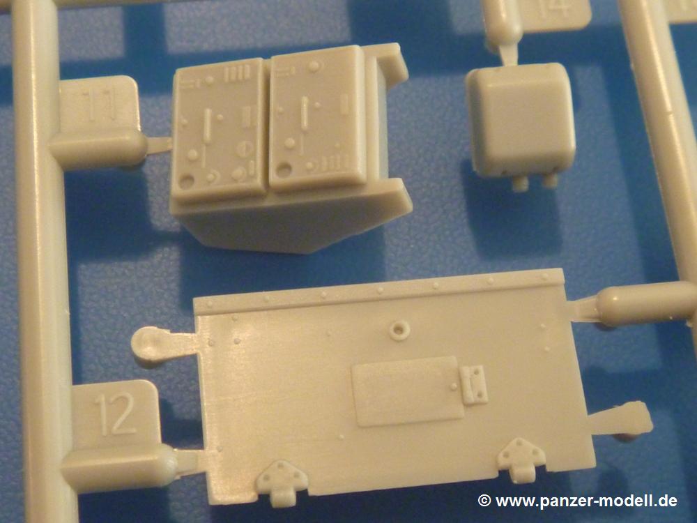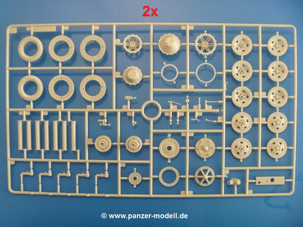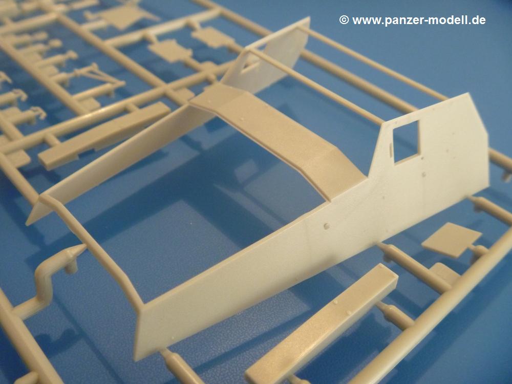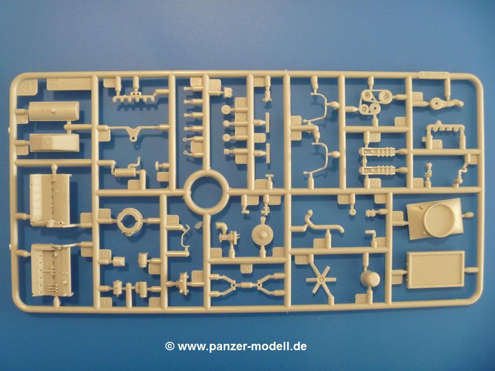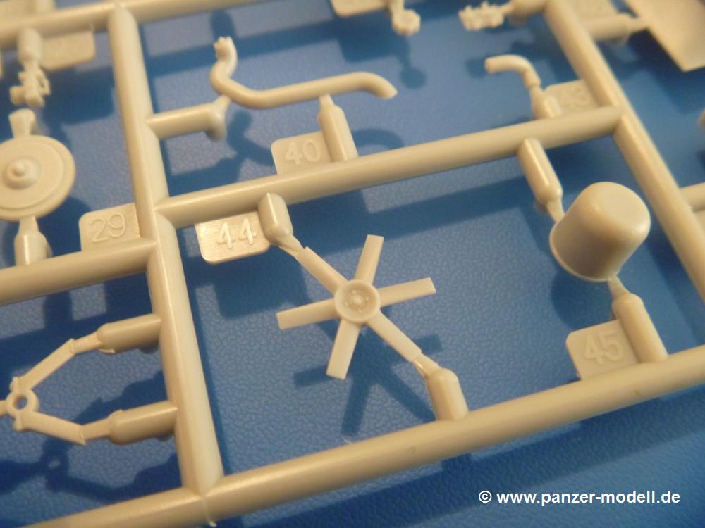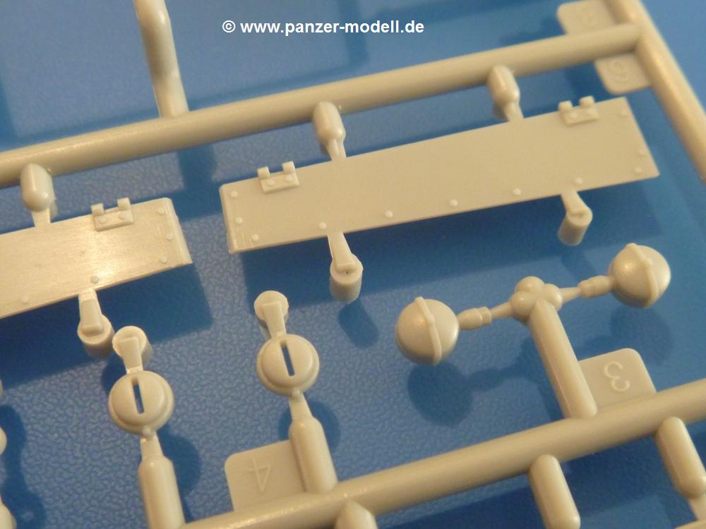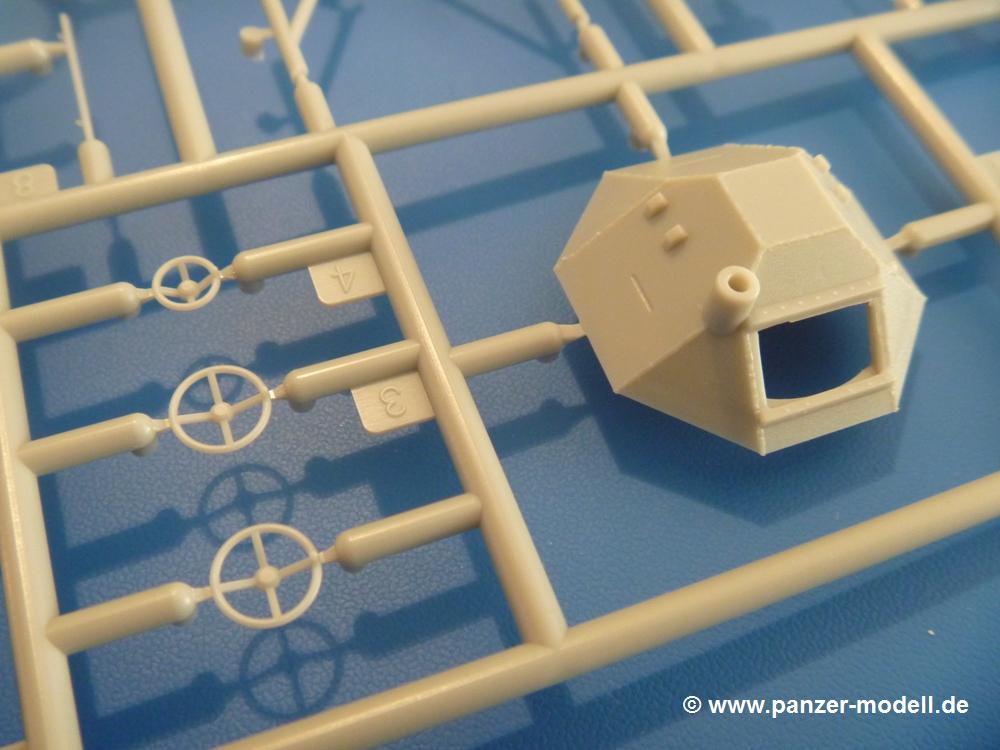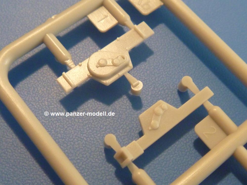 Gemäß meinen Informationen handelt es sich auch bei diesem Bausatz um ein ehemaligen Great Wall Hobby Modell. Alle Teile sind sauber gespritzt, ohne Sinkstellen, Versatz, Fischhäute oder Grat.Der Unterrahmen besteht aus einem großen Teil, in das die aus Hälften zusammengesetzten Drehstabkörper eingesetzt werden. Allein diese machen 7 Unterbaugruppen aus. Dazu kommen Schwingarme und die Achsen der hinteren Spannrollen mit der schönen Spindel des Kettenspanners. Die Vorderachse mit der schönen, querliegenden Blattfeder erlaubt eine eingeschlagene Stellung der Räder. Jedes Vorderrad besteht aus Felge, Einsatz, Nabe und 6 Reifenscheiben zur besseren Darstellung des Profils. Der Herstelleraufdruck auf den Reifenflanken fehlt auch hier. Es liegen 2 verschiedene Größen der Antriebszahnräder bei. Die Bauanleitung stellt einen vor die Wahl, welche Gräße man verwenden möchte. Bei den Laufrollen handelt es sich um die späten Scheibenräder mit je 5 Durchbrüchen. Die Schraubenköpfe machen mir einen etwas flachen Eindruck. Die Einzelgliederkette wird wohl etwas Arbeit machen. 112 Glieder pro Seite, immer wechselweise mit Zähnen und ohne, müssen zusammengefügt werden. Dafür bekommt man aber auch Kette mit schönen Details. Einige gut gestaltete Teile wie der Tank, die Luftdruckbehälter, Getriebe für Seilwinde und Seilführungen verschwinden im Rahmen und werden später kaum noch einzusehen sein. Dann ist es auch nicht schlimm, wenn man die Winde ganz weglässt, da sowieso der gepanzerte sWS im Original angeblich keine Seilwinde mehr hatte.Der originale sWS hat eine seitlich liegende Ölwanne und den Unterboden geschlossen. Bei ersten Bronco sWS hatte der Motor noch eine untenliegende Ölwanne. Jetzt ist der Unterboden zwar immer noch offen (mit Plastikkarte verschließen), aber der Spritzling M enthält die Korrekturteile für den Motor (flache Bodenplatte für den Motor, seitliche Ölwanne, andere Keilriemen etc). Wie angesprochen, der Motor mit Lichtmaschine, Luftfilter und Kühler ist ein kleiner Bausatz für sich und verspricht viel Spaß. Und wenn man sich schon die Abriet macht, Motorklappen offen lassen!Im Fahrerraum ist allerhand los - Pedale, Funkgerät, Schalt- und Bedienhebel, mehrteilige Sitze. Für die Armaturen gibt es Decals. Will man den Blick darauf nicht missen, sollte man alle Luken und Deckel offen anbauen. Da kommt es einem entgegen, dass sowohl die Fahrer-/Beifahrersichtklappen als auch die seitlichen Schiebeluken geschlossen oder offen angebaut werden können. Im hinteren Bereich werden noch Klappsitze angebracht. Da dieser sWS für den Nachteinsatz vorgesehen ist, bekommt der Fahrer eine IR-Optik und den entsprechenden Scheinwerfer dazu. Der gleiche Scheinwerfer wird zusätzlich an der Frontpanzerung angebracht. Hinter der Dachluke bohrt man ein Loch, damit dort die Halterung mit dem MG42 angebracht werden kann. Beim MG leiegn Verschlussdeckel, Zweibein und Munitonstrommel als separate Teile bei.Der hintere Aufbau besteht aus Seiten-, Heck- und Dachteil. Die Staufächer in den Seiten sind offen. Man hat die Wahl, ob man die Staufächer mit den Klappen verschliesst oder offen lässt, um ggfs. Werkzeug oder Gepäck (nicht im Bausatz enthalten) dort hineinzulegen. an den Klappen sind die Vorhängeschlösser bereits angegossen. Innen geht es etwas spartanisch vor. Weitere Staukästen, Elektrokasten, Innenverkleidung und Stützstreben sind alles, was wir dort finden. Mir stellt sich da die Frage, woher der grosse IR Scheinwerfer wohl seinen Strom bekommen wird (externer Generator?)?Natürlich ragt die Drehbühne des kleinen, achteckigen Turmes des IR-Scheinwerfers auch ins Innere hinein und sorgt für mehr Leben. An der Bühne sind Bedienelemente und Sitz angebracht, im Turminneren das Schwenkgetriebe und die Stellräder. In der Sichtluke des Turms sitzt eine IR-Optik ähnlich der des Fahrers. Auf dem Turm selbst sitzt ein U-förmiger Rahmen, der den Scheinwerfer aufnimmt. Bei diesem Rahmen kann man zwischen Einsatz- (aufgerichtet) und Fahrstellung (nach hinten abgeklappt) wählen. Der Scheinwerfer ist ein Bausatz für sich. 29 Plastik-, 20 PE-Teile und 2 Klarsitzscheiben wollen zusammengesetzt werden.Der Decalbogen enthält die Zifferblätter für die Armaturentafel (2 grosse, 3 kleine), Kennzeichen und Gewichtsklassen für 2 Wehrmachtsfahrzeuge (WH), was nicht so ganz zur Geschichte passt, dass die Fahrzeuge meist bei der 6. SS-Panzerdivision eingesetzt gewesen sein sollen. (Nun gut, solche Decals dürften in Deutschland sowieso nicht im Bausatz enthalten sein!) Dazu kann man sich jeweils ein WH Front-/Heckkennzeichen mittels "leeren" Nummernsschildern und separaten Ziffern selbst erstellen.Die teils farbige Bauanleitung mit Explosionszeichnungen erklärt den Zusammenbau in 30 Schritten. Auf dem Deckblatt erscheint in Englisch, Deutsch und Chinesisch ein kurzer Abriss der Geschichte dieses sWS. Farbangaben bei Verwendung von Mr. Hobby, Hobby Color, Humbrol und Tamiya Farben finden sich auf Seite 2. Die Lackierung ist für 1 Fahrzeug angegeben - Sandgelb mit grünen und braunen Tarnflächen.Welcher Geschichte des Originals man auch immer glauben möchte, Bastelspass hat man mit diesem Teil auf alle Fälle. Wegen der winzigen PE-Teile und dem komplexen Aufbau des Scheinwerfers denke ich, dass es besser ist, wenn man etwas megr Erfahrung im Modellbau mitbringt. Grad das Verkleben von PE- mit Klarsichtteilen wird für manche eine Herausforderung werden.Im deutschen Handel ist dieser sWS zwischen 52,00 und 55,00 EUR erhältlich.