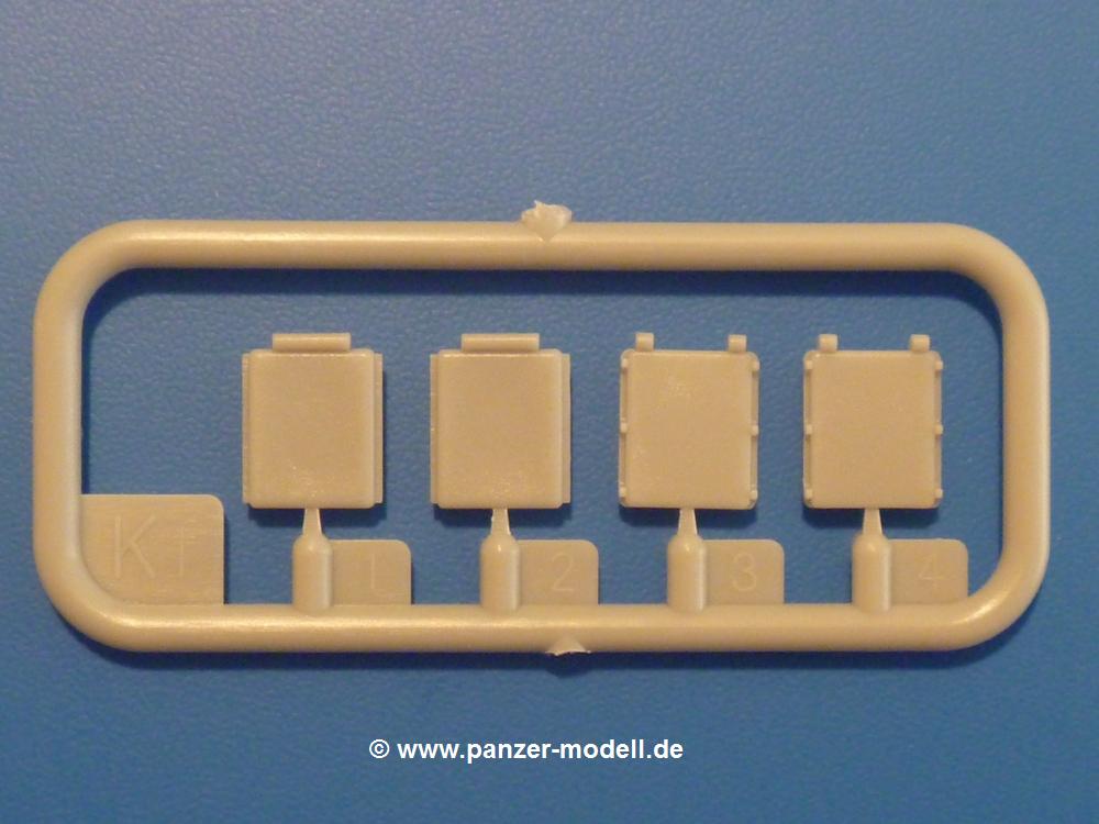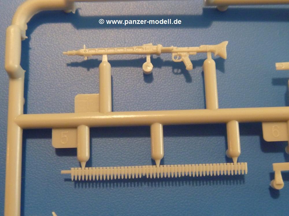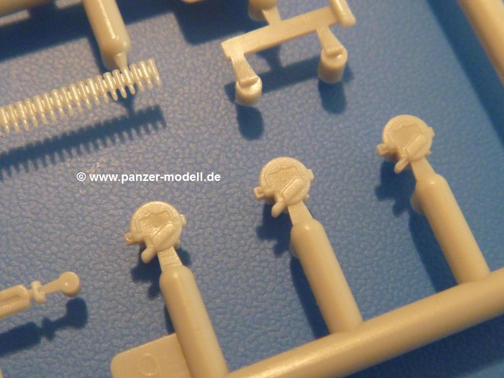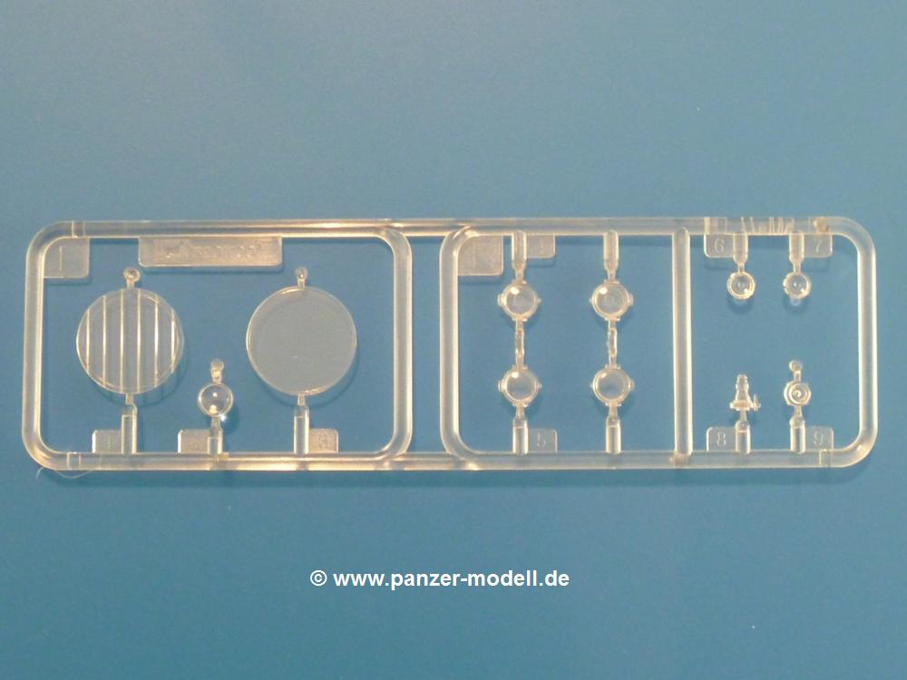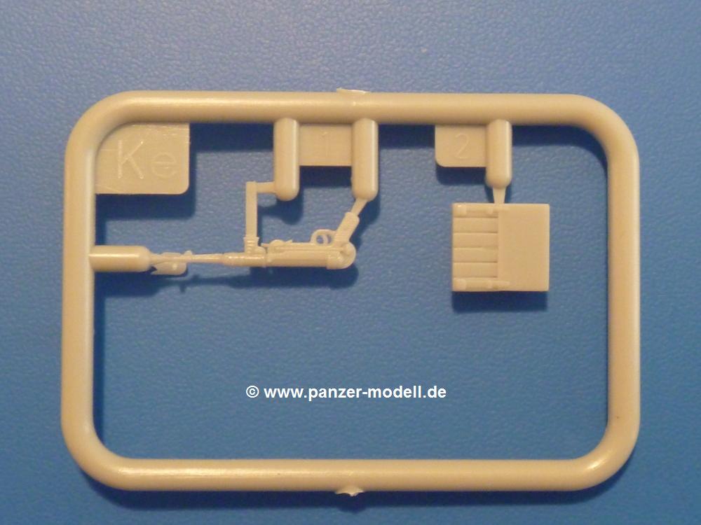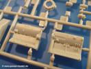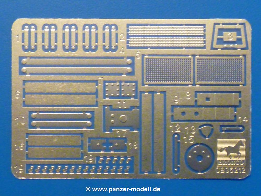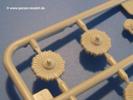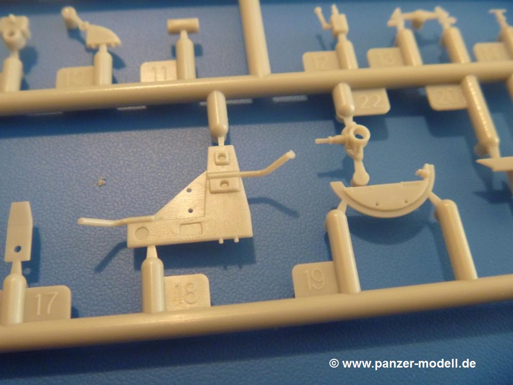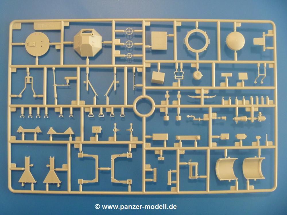 Gemäß meinen Informationen handelt es sich auch bei diesem Bausatz um ein ehemaligen Great Wall Hobby Modell. Alle Teile sind sauber gespritzt, ohne Sinkstellen, Versatz, Fischhäute oder Grat.Der Unterrahmen besteht aus einem großen Teil, in das die aus Hälften zusammengesetzten Drehstabkörper eingesetzt werden. Allein diese machen 7 Unterbaugruppen aus. Dazu kommen Schwingarme und die Achsen der hinteren Spannrollen mit der schönen Spindel des Kettenspanners. Die Vorderachse mit der schönen, querliegenden Blattfeder erlaubt eine eingeschlagene Stellung der Räder. Jedes Vorderrad besteht aus Felge, Einsatz, Nabe und 6 Reifenscheiben zur besseren Darstellung des Profils. Der Herstelleraufdruck auf den Reifenflanken fehlt auch hier. Es liegen 2 verschiedene Größen der Antriebszahnräder bei. Die Bauanleitung stellt einen vor die Wahl, welche Gräße man verwenden möchte. Bei den Laufrollen handelt es sich um die späten Scheibenräder mit je 5 Durchbrüchen. Die Schraubenköpfe machen mir einen etwas flachen Eindruck. Die Einzelgliederkette wird wohl etwas Arbeit machen. 112 Glieder pro Seite, immer wechselweise mit Zähnen und ohne, müssen zusammengefügt werden. Dafür bekommt man aber auch Kette mit schönen Details. Einige gut gestaltete Teile wie der Tank, die Luftdruckbehälter, Getriebe für Seilwinde und Seilführungen verschwinden im Rahmen und werden später kaum noch einzusehen sein. Dann ist es auch nicht schlimm, wenn man die Winde ganz weglässt, da sowieso der gepanzerte sWS im Original angeblich keine Seilwinde mehr hatte.Der originale sWS hat eine seitlich liegende Ölwanne und den Unterboden geschlossen. Bei ersten Bronco sWS hatte der Motor noch eine untenliegende Ölwanne. Jetzt ist der Unterboden zwar immer noch offen (mit Plastikkarte verschließen), aber der Spritzling M enthält die Korrekturteile für den Motor (flache Bodenplatte für den Motor, seitliche Ölwanne, andere Keilriemen etc). Wie angesprochen, der Motor mit Lichtmaschine, Luftfilter und Kühler ist ein kleiner Bausatz für sich und verspricht viel Spaß. Und wenn man sich schon die Abriet macht, Motorklappen offen lassen!Im Fahrerraum ist allerhand los - Pedale, Funkgerät, Schalt- und Bedienhebel, mehrteilige Sitze. Für die Armaturen gibt es Decals. Will man den Blick darauf nicht missen, sollte man alle Luken und Deckel offen anbauen. Da kommt es einem entgegen, dass sowohl die Fahrer-/Beifahrersichtklappen als auch die seitlichen Schiebeluken geschlossen oder offen angebaut werden können. Im hinteren Bereich werden noch Klappsitze angebracht. Da dieser sWS für den Nachteinsatz vorgesehen ist, bekommt der Fahrer eine IR-Optik und den entsprechenden Scheinwerfer dazu. Der gleiche Scheinwerfer wird zusätzlich an der Frontpanzerung angebracht. Hinter der Dachluke bohrt man ein Loch, damit dort die Halterung mit dem MG42 angebracht werden kann. Beim MG leiegn Verschlussdeckel, Zweibein und Munitonstrommel als separate Teile bei.Der hintere Aufbau besteht aus Seiten-, Heck- und Dachteil. Die Staufächer in den Seiten sind offen. Man hat die Wahl, ob man die Staufächer mit den Klappen verschliesst oder offen lässt, um ggfs. Werkzeug oder Gepäck (nicht im Bausatz enthalten) dort hineinzulegen. an den Klappen sind die Vorhängeschlösser bereits angegossen. Innen geht es etwas spartanisch vor. Weitere Staukästen, Elektrokasten, Innenverkleidung und Stützstreben sind alles, was wir dort finden. Mir stellt sich da die Frage, woher der grosse IR Scheinwerfer wohl seinen Strom bekommen wird (externer Generator?)?Natürlich ragt die Drehbühne des kleinen, achteckigen Turmes des IR-Scheinwerfers auch ins Innere hinein und sorgt für mehr Leben. An der Bühne sind Bedienelemente und Sitz angebracht, im Turminneren das Schwenkgetriebe und die Stellräder. In der Sichtluke des Turms sitzt eine IR-Optik ähnlich der des Fahrers. Auf dem Turm selbst sitzt ein U-förmiger Rahmen, der den Scheinwerfer aufnimmt. Bei diesem Rahmen kann man zwischen Einsatz- (aufgerichtet) und Fahrstellung (nach hinten abgeklappt) wählen. Der Scheinwerfer ist ein Bausatz für sich. 29 Plastik-, 20 PE-Teile und 2 Klarsitzscheiben wollen zusammengesetzt werden.Der Decalbogen enthält die Zifferblätter für die Armaturentafel (2 grosse, 3 kleine), Kennzeichen und Gewichtsklassen für 2 Wehrmachtsfahrzeuge (WH), was nicht so ganz zur Geschichte passt, dass die Fahrzeuge meist bei der 6. SS-Panzerdivision eingesetzt gewesen sein sollen. (Nun gut, solche Decals dürften in Deutschland sowieso nicht im Bausatz enthalten sein!) Dazu kann man sich jeweils ein WH Front-/Heckkennzeichen mittels "leeren" Nummernsschildern und separaten Ziffern selbst erstellen.Die teils farbige Bauanleitung mit Explosionszeichnungen erklärt den Zusammenbau in 30 Schritten. Auf dem Deckblatt erscheint in Englisch, Deutsch und Chinesisch ein kurzer Abriss der Geschichte dieses sWS. Farbangaben bei Verwendung von Mr. Hobby, Hobby Color, Humbrol und Tamiya Farben finden sich auf Seite 2. Die Lackierung ist für 1 Fahrzeug angegeben - Sandgelb mit grünen und braunen Tarnflächen.Welcher Geschichte des Originals man auch immer glauben möchte, Bastelspass hat man mit diesem Teil auf alle Fälle. Wegen der winzigen PE-Teile und dem komplexen Aufbau des Scheinwerfers denke ich, dass es besser ist, wenn man etwas megr Erfahrung im Modellbau mitbringt. Grad das Verkleben von PE- mit Klarsichtteilen wird für manche eine Herausforderung werden.Im deutschen Handel ist dieser sWS zwischen 52,00 und 55,00 EUR erhältlich.
