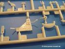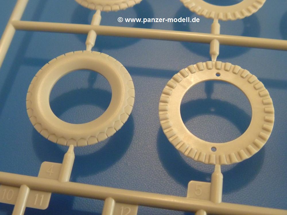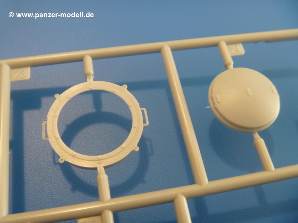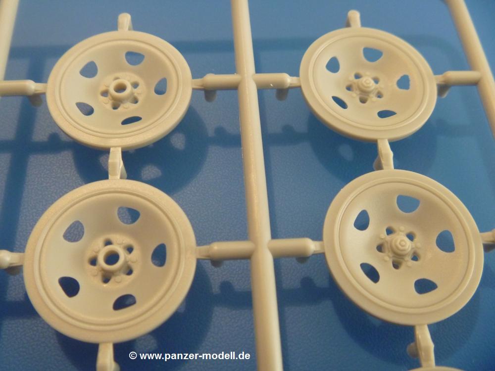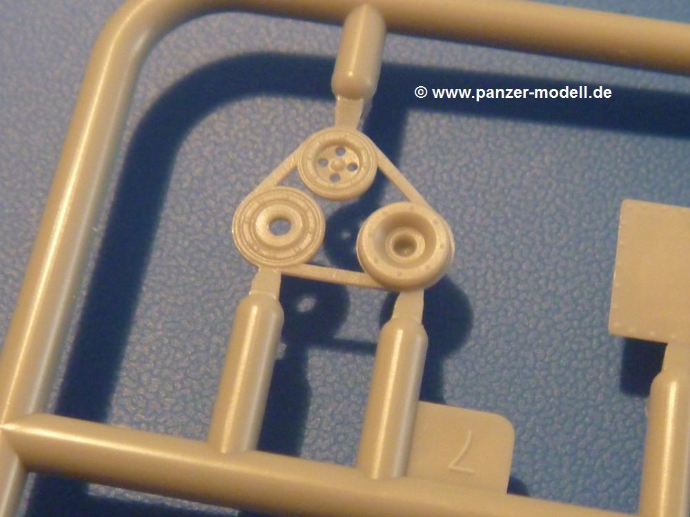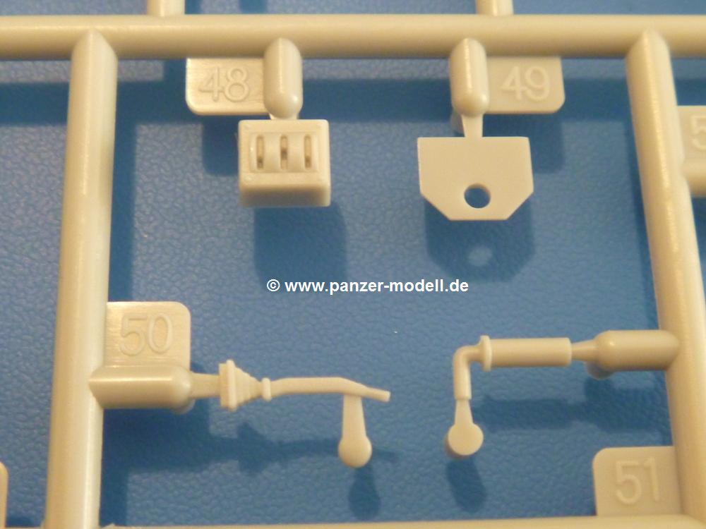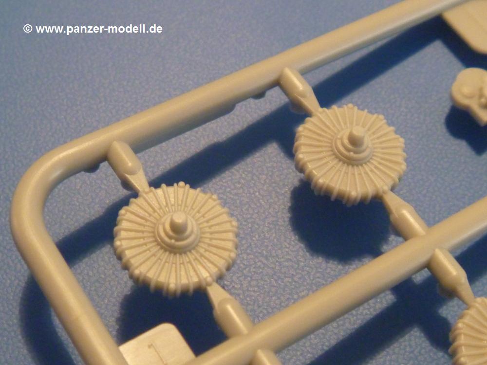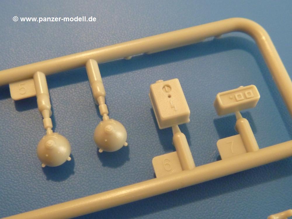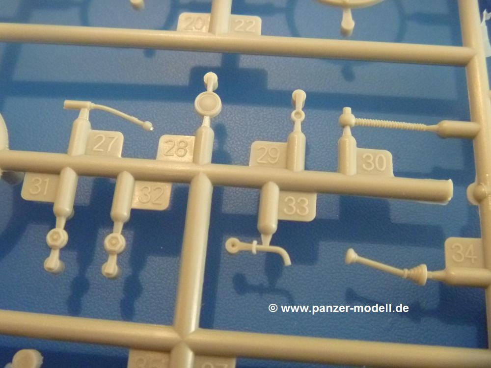 Gemäß meinen Informationen handelt es sich auch bei diesem Bausatz um ein ehemaligen Great Wall Hobby Modell. Alle Teile sind sauber gespritzt, ohne Sinkstellen, Versatz, Fischhäute oder Grat.Der Unterrahmen besteht aus einem großen Teil, in das die aus Hälften zusammengesetzten Drehstabkörper eingesetzt werden. Allein diese machen 7 Unterbaugruppen aus. Dazu kommen Schwingarme und die Achsen der hinteren Spannrollen mit der schönen Spindel des Kettenspanners. Die Vorderachse mit der schönen, querliegenden Blattfeder erlaubt eine eingeschlagene Stellung der Räder. Jedes Vorderrad besteht aus Felge, Einsatz, Nabe und 6 Reifenscheiben zur besseren Darstellung des Profils. Der Herstelleraufdruck auf den Reifenflanken fehlt auch hier. Es liegen 2 verschiedene Größen der Antriebszahnräder bei. Die Bauanleitung stellt einen vor die Wahl, welche Gräße man verwenden möchte. Bei den Laufrollen handelt es sich um die späten Scheibenräder mit je 5 Durchbrüchen. Die Schraubenköpfe machen mir einen etwas flachen Eindruck. Die Einzelgliederkette wird wohl etwas Arbeit machen. 112 Glieder pro Seite, immer wechselweise mit Zähnen und ohne, müssen zusammengefügt werden. Dafür bekommt man aber auch Kette mit schönen Details. Einige gut gestaltete Teile wie der Tank, die Luftdruckbehälter, Getriebe für Seilwinde und Seilführungen verschwinden im Rahmen und werden später kaum noch einzusehen sein. Dann ist es auch nicht schlimm, wenn man die Winde ganz weglässt, da sowieso der gepanzerte sWS im Original angeblich keine Seilwinde mehr hatte.Der originale sWS hat eine seitlich liegende Ölwanne und den Unterboden geschlossen. Bei ersten Bronco sWS hatte der Motor noch eine untenliegende Ölwanne. Jetzt ist der Unterboden zwar immer noch offen (mit Plastikkarte verschließen), aber der Spritzling M enthält die Korrekturteile für den Motor (flache Bodenplatte für den Motor, seitliche Ölwanne, andere Keilriemen etc). Wie angesprochen, der Motor mit Lichtmaschine, Luftfilter und Kühler ist ein kleiner Bausatz für sich und verspricht viel Spaß. Und wenn man sich schon die Abriet macht, Motorklappen offen lassen!Im Fahrerraum ist allerhand los - Pedale, Funkgerät, Schalt- und Bedienhebel, mehrteilige Sitze. Für die Armaturen gibt es Decals. Will man den Blick darauf nicht missen, sollte man alle Luken und Deckel offen anbauen. Da kommt es einem entgegen, dass sowohl die Fahrer-/Beifahrersichtklappen als auch die seitlichen Schiebeluken geschlossen oder offen angebaut werden können. Im hinteren Bereich werden noch Klappsitze angebracht. Da dieser sWS für den Nachteinsatz vorgesehen ist, bekommt der Fahrer eine IR-Optik und den entsprechenden Scheinwerfer dazu. Der gleiche Scheinwerfer wird zusätzlich an der Frontpanzerung angebracht. Hinter der Dachluke bohrt man ein Loch, damit dort die Halterung mit dem MG42 angebracht werden kann. Beim MG leiegn Verschlussdeckel, Zweibein und Munitonstrommel als separate Teile bei.Der hintere Aufbau besteht aus Seiten-, Heck- und Dachteil. Die Staufächer in den Seiten sind offen. Man hat die Wahl, ob man die Staufächer mit den Klappen verschliesst oder offen lässt, um ggfs. Werkzeug oder Gepäck (nicht im Bausatz enthalten) dort hineinzulegen. an den Klappen sind die Vorhängeschlösser bereits angegossen. Innen geht es etwas spartanisch vor. Weitere Staukästen, Elektrokasten, Innenverkleidung und Stützstreben sind alles, was wir dort finden. Mir stellt sich da die Frage, woher der grosse IR Scheinwerfer wohl seinen Strom bekommen wird (externer Generator?)?Natürlich ragt die Drehbühne des kleinen, achteckigen Turmes des IR-Scheinwerfers auch ins Innere hinein und sorgt für mehr Leben. An der Bühne sind Bedienelemente und Sitz angebracht, im Turminneren das Schwenkgetriebe und die Stellräder. In der Sichtluke des Turms sitzt eine IR-Optik ähnlich der des Fahrers. Auf dem Turm selbst sitzt ein U-förmiger Rahmen, der den Scheinwerfer aufnimmt. Bei diesem Rahmen kann man zwischen Einsatz- (aufgerichtet) und Fahrstellung (nach hinten abgeklappt) wählen. Der Scheinwerfer ist ein Bausatz für sich. 29 Plastik-, 20 PE-Teile und 2 Klarsitzscheiben wollen zusammengesetzt werden.Der Decalbogen enthält die Zifferblätter für die Armaturentafel (2 grosse, 3 kleine), Kennzeichen und Gewichtsklassen für 2 Wehrmachtsfahrzeuge (WH), was nicht so ganz zur Geschichte passt, dass die Fahrzeuge meist bei der 6. SS-Panzerdivision eingesetzt gewesen sein sollen. (Nun gut, solche Decals dürften in Deutschland sowieso nicht im Bausatz enthalten sein!) Dazu kann man sich jeweils ein WH Front-/Heckkennzeichen mittels "leeren" Nummernsschildern und separaten Ziffern selbst erstellen.Die teils farbige Bauanleitung mit Explosionszeichnungen erklärt den Zusammenbau in 30 Schritten. Auf dem Deckblatt erscheint in Englisch, Deutsch und Chinesisch ein kurzer Abriss der Geschichte dieses sWS. Farbangaben bei Verwendung von Mr. Hobby, Hobby Color, Humbrol und Tamiya Farben finden sich auf Seite 2. Die Lackierung ist für 1 Fahrzeug angegeben - Sandgelb mit grünen und braunen Tarnflächen.Welcher Geschichte des Originals man auch immer glauben möchte, Bastelspass hat man mit diesem Teil auf alle Fälle. Wegen der winzigen PE-Teile und dem komplexen Aufbau des Scheinwerfers denke ich, dass es besser ist, wenn man etwas megr Erfahrung im Modellbau mitbringt. Grad das Verkleben von PE- mit Klarsichtteilen wird für manche eine Herausforderung werden.Im deutschen Handel ist dieser sWS zwischen 52,00 und 55,00 EUR erhältlich.