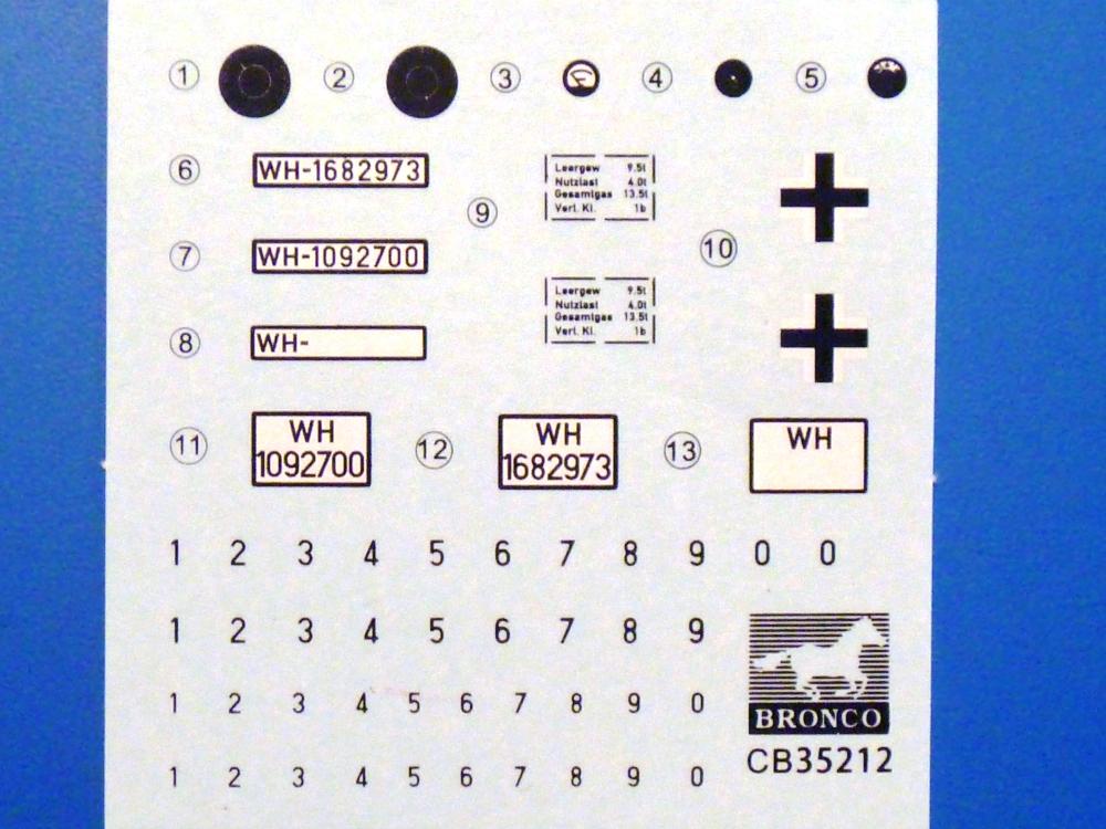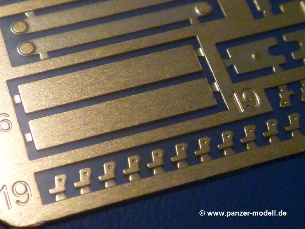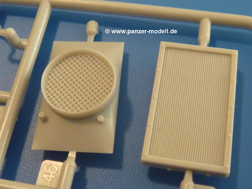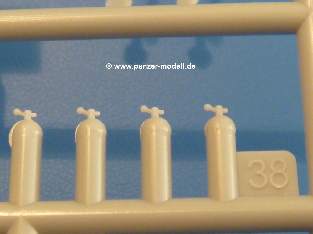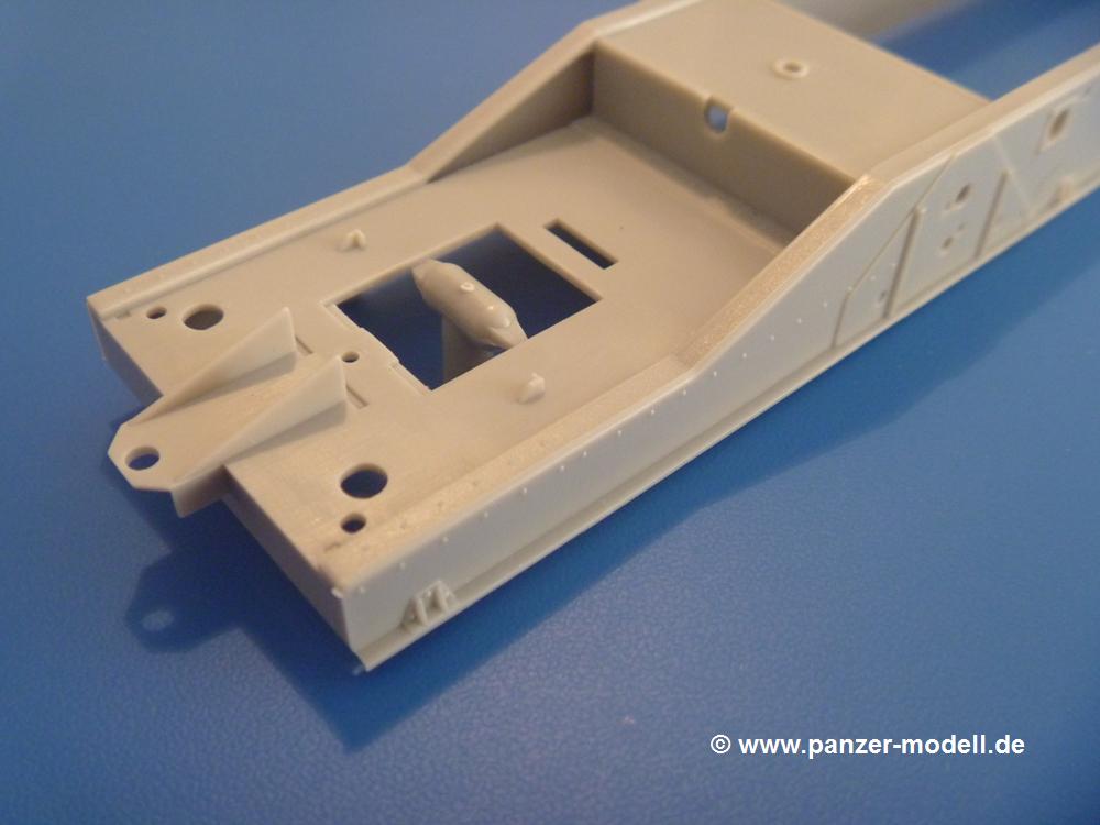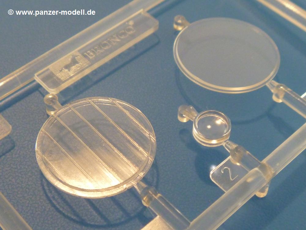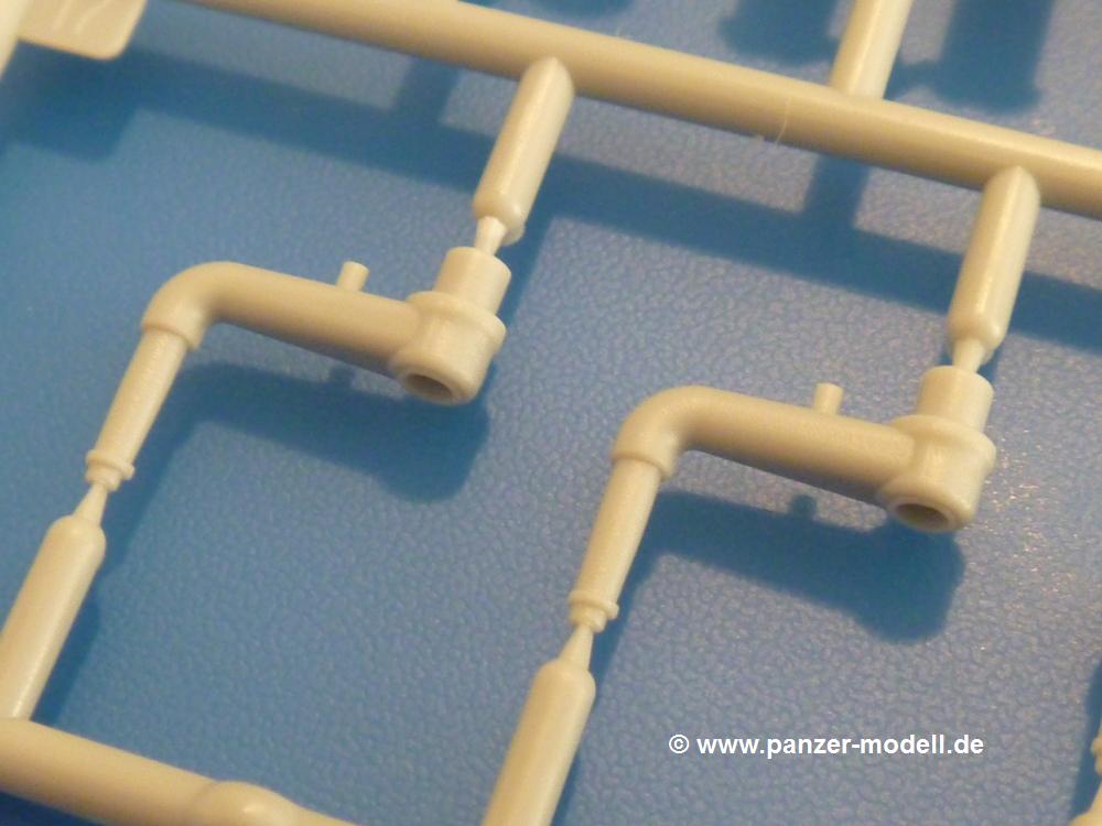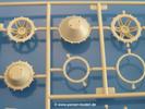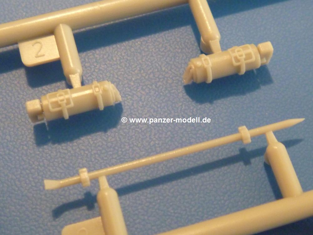 Gemäß meinen Informationen handelt es sich auch bei diesem Bausatz um ein ehemaligen Great Wall Hobby Modell. Alle Teile sind sauber gespritzt, ohne Sinkstellen, Versatz, Fischhäute oder Grat.Der Unterrahmen besteht aus einem großen Teil, in das die aus Hälften zusammengesetzten Drehstabkörper eingesetzt werden. Allein diese machen 7 Unterbaugruppen aus. Dazu kommen Schwingarme und die Achsen der hinteren Spannrollen mit der schönen Spindel des Kettenspanners. Die Vorderachse mit der schönen, querliegenden Blattfeder erlaubt eine eingeschlagene Stellung der Räder. Jedes Vorderrad besteht aus Felge, Einsatz, Nabe und 6 Reifenscheiben zur besseren Darstellung des Profils. Der Herstelleraufdruck auf den Reifenflanken fehlt auch hier. Es liegen 2 verschiedene Größen der Antriebszahnräder bei. Die Bauanleitung stellt einen vor die Wahl, welche Gräße man verwenden möchte. Bei den Laufrollen handelt es sich um die späten Scheibenräder mit je 5 Durchbrüchen. Die Schraubenköpfe machen mir einen etwas flachen Eindruck. Die Einzelgliederkette wird wohl etwas Arbeit machen. 112 Glieder pro Seite, immer wechselweise mit Zähnen und ohne, müssen zusammengefügt werden. Dafür bekommt man aber auch Kette mit schönen Details. Einige gut gestaltete Teile wie der Tank, die Luftdruckbehälter, Getriebe für Seilwinde und Seilführungen verschwinden im Rahmen und werden später kaum noch einzusehen sein. Dann ist es auch nicht schlimm, wenn man die Winde ganz weglässt, da sowieso der gepanzerte sWS im Original angeblich keine Seilwinde mehr hatte.Der originale sWS hat eine seitlich liegende Ölwanne und den Unterboden geschlossen. Bei ersten Bronco sWS hatte der Motor noch eine untenliegende Ölwanne. Jetzt ist der Unterboden zwar immer noch offen (mit Plastikkarte verschließen), aber der Spritzling M enthält die Korrekturteile für den Motor (flache Bodenplatte für den Motor, seitliche Ölwanne, andere Keilriemen etc). Wie angesprochen, der Motor mit Lichtmaschine, Luftfilter und Kühler ist ein kleiner Bausatz für sich und verspricht viel Spaß. Und wenn man sich schon die Abriet macht, Motorklappen offen lassen!Im Fahrerraum ist allerhand los - Pedale, Funkgerät, Schalt- und Bedienhebel, mehrteilige Sitze. Für die Armaturen gibt es Decals. Will man den Blick darauf nicht missen, sollte man alle Luken und Deckel offen anbauen. Da kommt es einem entgegen, dass sowohl die Fahrer-/Beifahrersichtklappen als auch die seitlichen Schiebeluken geschlossen oder offen angebaut werden können. Im hinteren Bereich werden noch Klappsitze angebracht. Da dieser sWS für den Nachteinsatz vorgesehen ist, bekommt der Fahrer eine IR-Optik und den entsprechenden Scheinwerfer dazu. Der gleiche Scheinwerfer wird zusätzlich an der Frontpanzerung angebracht. Hinter der Dachluke bohrt man ein Loch, damit dort die Halterung mit dem MG42 angebracht werden kann. Beim MG leiegn Verschlussdeckel, Zweibein und Munitonstrommel als separate Teile bei.Der hintere Aufbau besteht aus Seiten-, Heck- und Dachteil. Die Staufächer in den Seiten sind offen. Man hat die Wahl, ob man die Staufächer mit den Klappen verschliesst oder offen lässt, um ggfs. Werkzeug oder Gepäck (nicht im Bausatz enthalten) dort hineinzulegen. an den Klappen sind die Vorhängeschlösser bereits angegossen. Innen geht es etwas spartanisch vor. Weitere Staukästen, Elektrokasten, Innenverkleidung und Stützstreben sind alles, was wir dort finden. Mir stellt sich da die Frage, woher der grosse IR Scheinwerfer wohl seinen Strom bekommen wird (externer Generator?)?Natürlich ragt die Drehbühne des kleinen, achteckigen Turmes des IR-Scheinwerfers auch ins Innere hinein und sorgt für mehr Leben. An der Bühne sind Bedienelemente und Sitz angebracht, im Turminneren das Schwenkgetriebe und die Stellräder. In der Sichtluke des Turms sitzt eine IR-Optik ähnlich der des Fahrers. Auf dem Turm selbst sitzt ein U-förmiger Rahmen, der den Scheinwerfer aufnimmt. Bei diesem Rahmen kann man zwischen Einsatz- (aufgerichtet) und Fahrstellung (nach hinten abgeklappt) wählen. Der Scheinwerfer ist ein Bausatz für sich. 29 Plastik-, 20 PE-Teile und 2 Klarsitzscheiben wollen zusammengesetzt werden.Der Decalbogen enthält die Zifferblätter für die Armaturentafel (2 grosse, 3 kleine), Kennzeichen und Gewichtsklassen für 2 Wehrmachtsfahrzeuge (WH), was nicht so ganz zur Geschichte passt, dass die Fahrzeuge meist bei der 6. SS-Panzerdivision eingesetzt gewesen sein sollen. (Nun gut, solche Decals dürften in Deutschland sowieso nicht im Bausatz enthalten sein!) Dazu kann man sich jeweils ein WH Front-/Heckkennzeichen mittels "leeren" Nummernsschildern und separaten Ziffern selbst erstellen.Die teils farbige Bauanleitung mit Explosionszeichnungen erklärt den Zusammenbau in 30 Schritten. Auf dem Deckblatt erscheint in Englisch, Deutsch und Chinesisch ein kurzer Abriss der Geschichte dieses sWS. Farbangaben bei Verwendung von Mr. Hobby, Hobby Color, Humbrol und Tamiya Farben finden sich auf Seite 2. Die Lackierung ist für 1 Fahrzeug angegeben - Sandgelb mit grünen und braunen Tarnflächen.Welcher Geschichte des Originals man auch immer glauben möchte, Bastelspass hat man mit diesem Teil auf alle Fälle. Wegen der winzigen PE-Teile und dem komplexen Aufbau des Scheinwerfers denke ich, dass es besser ist, wenn man etwas megr Erfahrung im Modellbau mitbringt. Grad das Verkleben von PE- mit Klarsichtteilen wird für manche eine Herausforderung werden.Im deutschen Handel ist dieser sWS zwischen 52,00 und 55,00 EUR erhältlich.