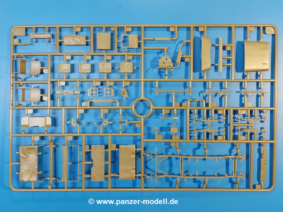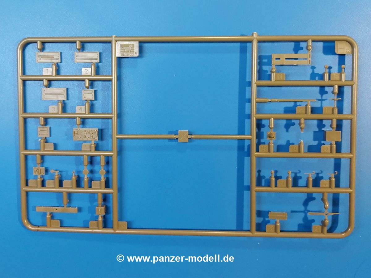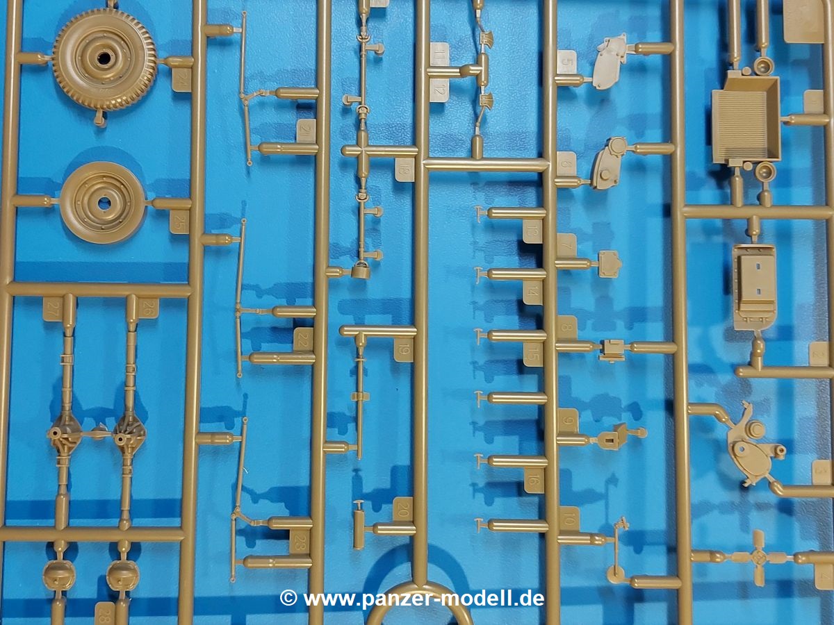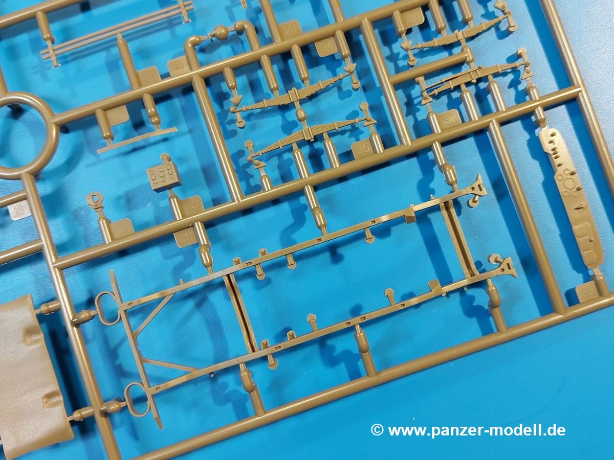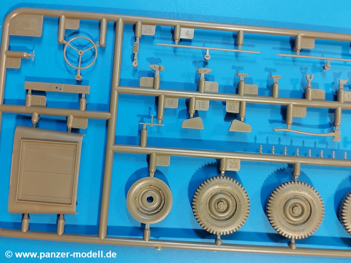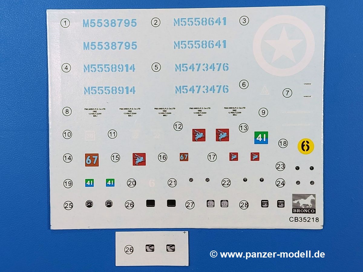 Das Original: Über "den Jeep" (formal: Truck, 1/4 ton, 4x4) braucht man eigentliche keine Worte mehr zu verlieren. Das in den 1940-ern meist bei Willys und Ford gebaute Allzweckfahrzeug war bei seinen Nutzern äußerst beliebt und fand Einsatz in den unterschiedlichsten Einheiten als Aufklärungsfahrzeug, Zugmaschine für leichte Anhänger und Geschütze usw. Allein im 2. Weltkrieg wurden fast 650.000 Jeeps gebaut und eingesetzt. Die U.S.A. lieferten ihn auch an alliierte Staaten wie Frankreich, Russland und Großbritannien. Auch heute existieren noch viele einsatzbereite Exemplare. Die Bausätze: Wer britische Jeeps bauen möchte, ist bei Bronco ganz gut aufgehoben. Der neueste Bausatz enthält gleich 2 davon einen der Aufklärer und einen der Fernmelder. So kommt es, dass einige Spritzlinge gleich doppelt vorhanden sind. Im großzügig dimensionierten Karton mit den Maßen 445 x 300 x 70 Millimeter befinden sich neben der 16-seitigen Bauanleitung, 2 PE-Platinen, Bindfaden und 2 Abziehbilderbogen (Decals) 16 olivgrüne Spritzlinge plus 2 Karosserien und 1 durchsichtiger Spritzling. Die 5 Spritzlinge der Figuren sind hellgrau, ebenso der Spritzling für den Korb und der mit den Gurttaschen. Da sich auch Teile anderer Versionen an den Spritzlingen befinden, bleibt einiges übrig. Diese Teile sind in der Übersicht ausgegraut. Alle Teile sind sauber gespritzt, ohne Sinkstellen, Versatz oder Fischhäute. Jedoch ist hier und da feiner Grat zu finden, der aber leicht zu entfernen ist und der Qualität insgesamt keinen Abbruch tut. Einige Auswerfermarken sind vorhanden, auffällig an der Unterseite der Karosserien und der Innenseite der Motorhauben. Bronco legt Wert auf kleinste Details, deshalb gibt so einige feine, aber auch kleine Teile bis hin zu separat anzubringenden Schraubenköpfen. Es empfiehlt sich, die Bauanleitung sehr gründlich zu studieren, damit man die beiden Fahrzeuge nicht durcheinanderwirft. Na, schauen wir mal, was uns geboten wird. Da ist zum Beispiel ein ziemlich kompletter Motor mit Zündspule, Vergaser, Abgaskrümmer, Auspuffrohr, Luftfilter, Keilriemen- und -scheiben, Lüfterrad, Kupplungsgehäuse, Schaltgetriebe, ein Verteilergetriebe und Kardanwellen zu Vorder- und Hinterachse. Im Motorraum hat man noch Kühler mit Scheinwerfern, Batterie, Hupe usw. Die Achsen werden an Blattfederpaketen befestigt, die jeweils mit Stoßdämpfern versehen werden. Die Vorderräder können geradeaus oder mit Lenkeinschlag gebaut werden. Man muss sich nur für die entsprechenden Gestänge entscheiden. Die Plastikräder sind mit Hersteller und Reifenangaben versehen und können drehbar gebaut werden. Die offene Karosserie bietet genug Gelegenheiten mit Details zu glänzen und Bronco nutzt das schamlos aus. Pedalerie, Schalthebel, Kraftstofftank, Sitze, Lenkrad und ein sehr schönes Armaturenbrett, für dessen Instrumente und Hinweisschilder Decals beiliegen, die man besser vor dem Einbau anbringt. Man kann wählen, ob man das gefaltete Gestänge der Plane anbringt oder nicht. Alle Versionen bekommen ein sehr feines Funkgerät Nr. 22 mit PE-Schutzgitter. Da das Funkgerät sehr gut einzusehen ist, kann man sich bemalungstechnisch entsprechend austoben. Kommen wir zu den Unterschieden. Das mache ich besser in einer Aufzählung:
