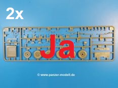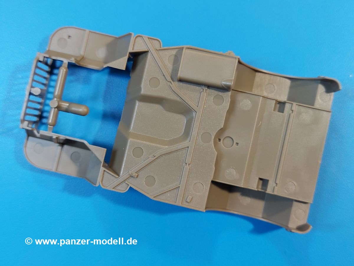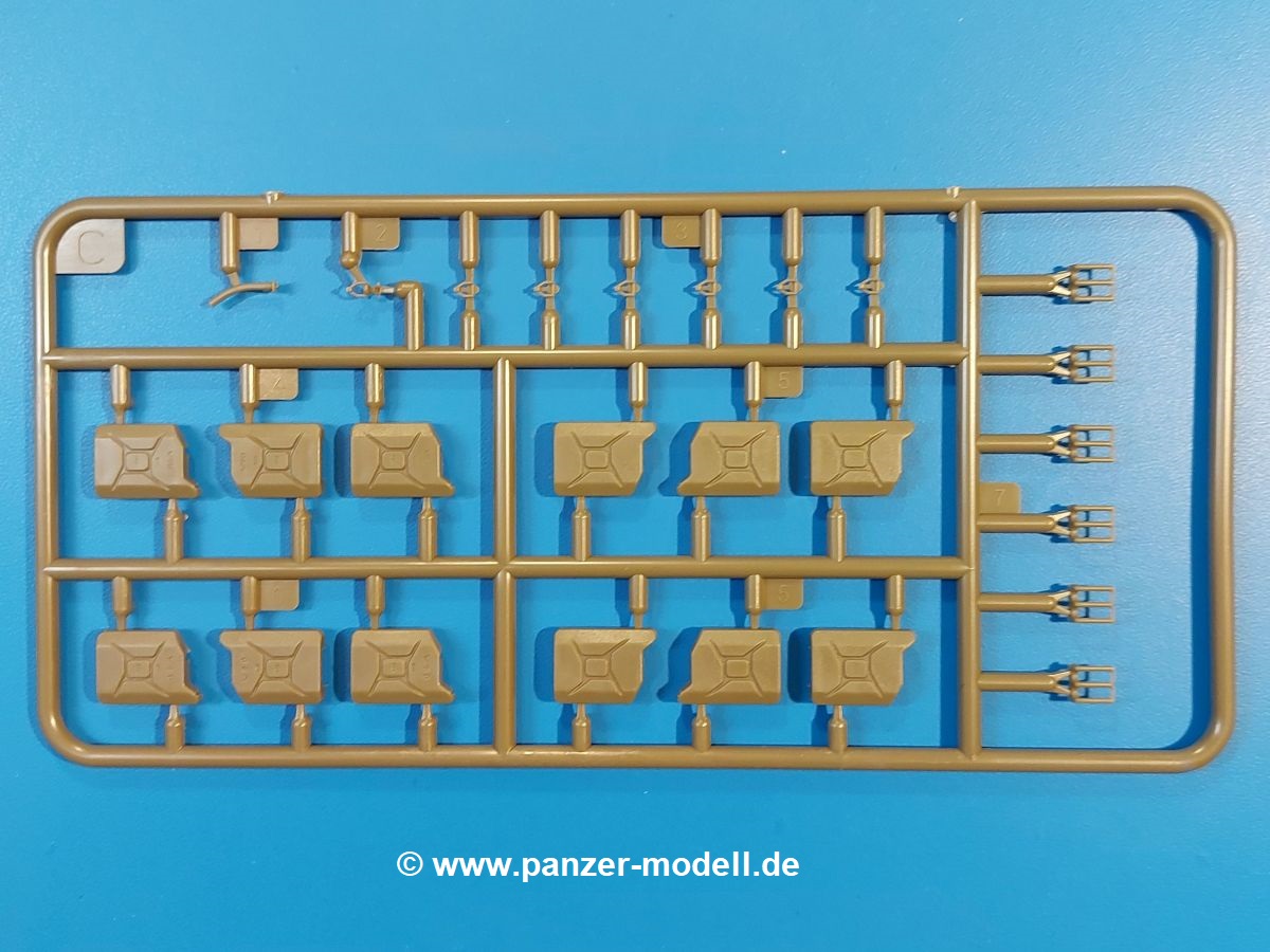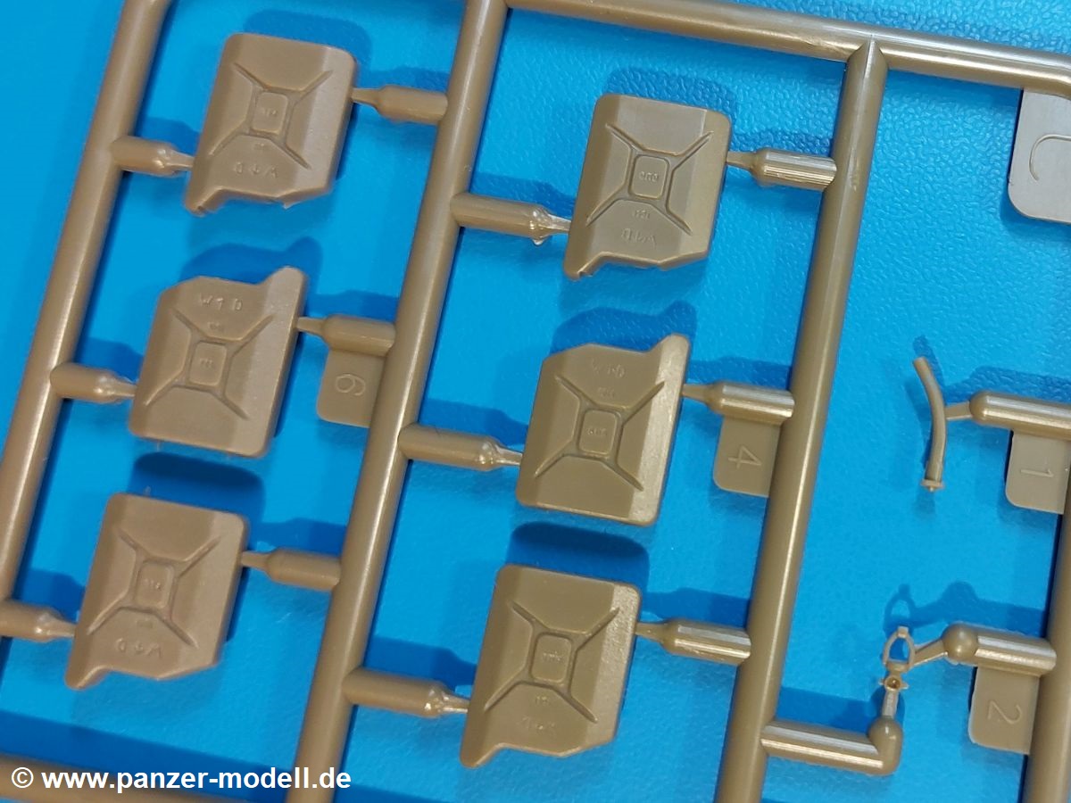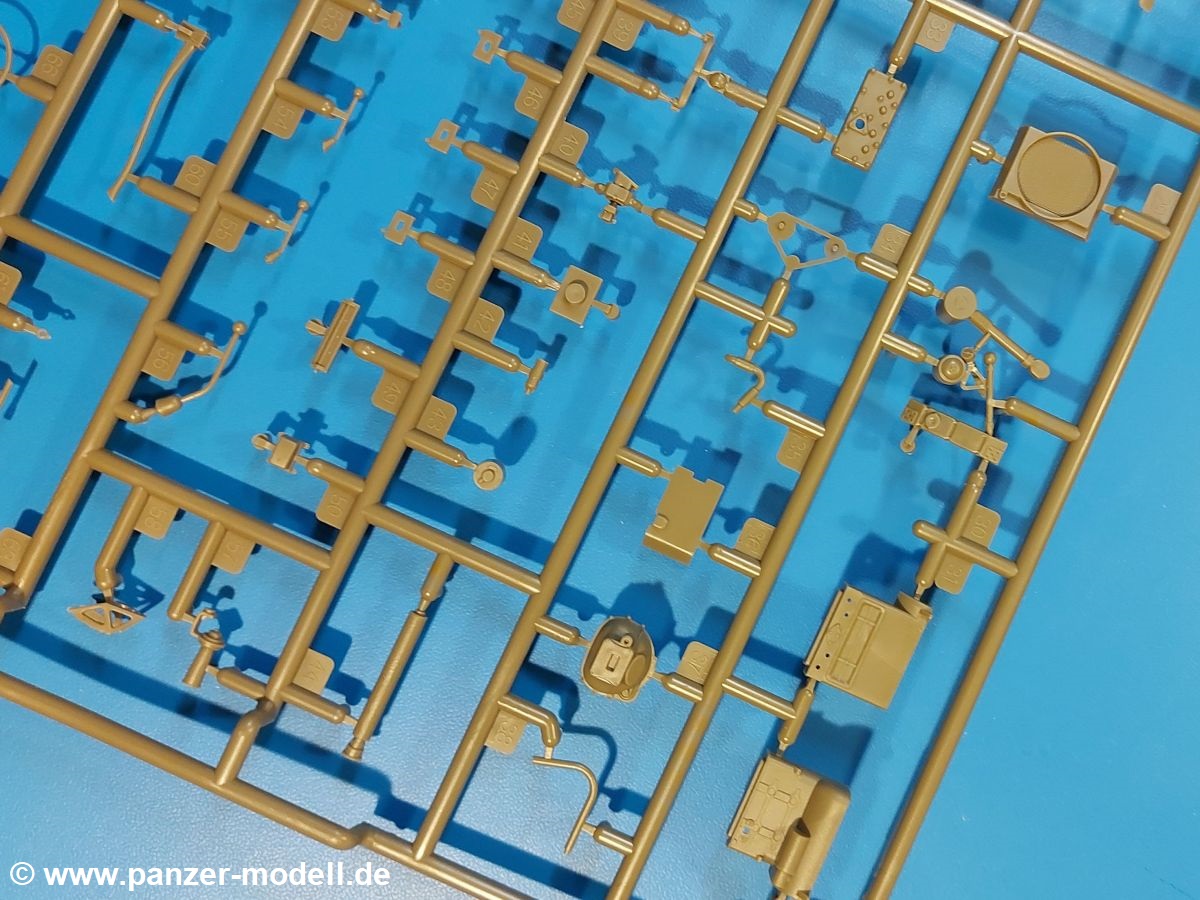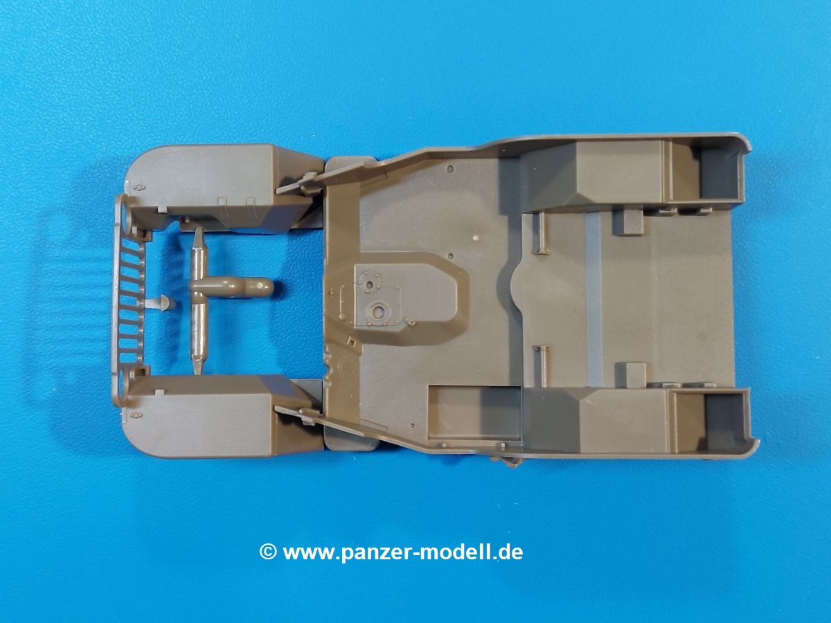 Das Original: Über "den Jeep" (formal: Truck, 1/4 ton, 4x4) braucht man eigentliche keine Worte mehr zu verlieren. Das in den 1940-ern meist bei Willys und Ford gebaute Allzweckfahrzeug war bei seinen Nutzern äußerst beliebt und fand Einsatz in den unterschiedlichsten Einheiten als Aufklärungsfahrzeug, Zugmaschine für leichte Anhänger und Geschütze usw. Allein im 2. Weltkrieg wurden fast 650.000 Jeeps gebaut und eingesetzt. Die U.S.A. lieferten ihn auch an alliierte Staaten wie Frankreich, Russland und Großbritannien. Auch heute existieren noch viele einsatzbereite Exemplare. Die Bausätze: Wer britische Jeeps bauen möchte, ist bei Bronco ganz gut aufgehoben. Der neueste Bausatz enthält gleich 2 davon einen der Aufklärer und einen der Fernmelder. So kommt es, dass einige Spritzlinge gleich doppelt vorhanden sind. Im großzügig dimensionierten Karton mit den Maßen 445 x 300 x 70 Millimeter befinden sich neben der 16-seitigen Bauanleitung, 2 PE-Platinen, Bindfaden und 2 Abziehbilderbogen (Decals) 16 olivgrüne Spritzlinge plus 2 Karosserien und 1 durchsichtiger Spritzling. Die 5 Spritzlinge der Figuren sind hellgrau, ebenso der Spritzling für den Korb und der mit den Gurttaschen. Da sich auch Teile anderer Versionen an den Spritzlingen befinden, bleibt einiges übrig. Diese Teile sind in der Übersicht ausgegraut. Alle Teile sind sauber gespritzt, ohne Sinkstellen, Versatz oder Fischhäute. Jedoch ist hier und da feiner Grat zu finden, der aber leicht zu entfernen ist und der Qualität insgesamt keinen Abbruch tut. Einige Auswerfermarken sind vorhanden, auffällig an der Unterseite der Karosserien und der Innenseite der Motorhauben. Bronco legt Wert auf kleinste Details, deshalb gibt so einige feine, aber auch kleine Teile bis hin zu separat anzubringenden Schraubenköpfen. Es empfiehlt sich, die Bauanleitung sehr gründlich zu studieren, damit man die beiden Fahrzeuge nicht durcheinanderwirft. Na, schauen wir mal, was uns geboten wird. Da ist zum Beispiel ein ziemlich kompletter Motor mit Zündspule, Vergaser, Abgaskrümmer, Auspuffrohr, Luftfilter, Keilriemen- und -scheiben, Lüfterrad, Kupplungsgehäuse, Schaltgetriebe, ein Verteilergetriebe und Kardanwellen zu Vorder- und Hinterachse. Im Motorraum hat man noch Kühler mit Scheinwerfern, Batterie, Hupe usw. Die Achsen werden an Blattfederpaketen befestigt, die jeweils mit Stoßdämpfern versehen werden. Die Vorderräder können geradeaus oder mit Lenkeinschlag gebaut werden. Man muss sich nur für die entsprechenden Gestänge entscheiden. Die Plastikräder sind mit Hersteller und Reifenangaben versehen und können drehbar gebaut werden. Die offene Karosserie bietet genug Gelegenheiten mit Details zu glänzen und Bronco nutzt das schamlos aus. Pedalerie, Schalthebel, Kraftstofftank, Sitze, Lenkrad und ein sehr schönes Armaturenbrett, für dessen Instrumente und Hinweisschilder Decals beiliegen, die man besser vor dem Einbau anbringt. Man kann wählen, ob man das gefaltete Gestänge der Plane anbringt oder nicht. Alle Versionen bekommen ein sehr feines Funkgerät Nr. 22 mit PE-Schutzgitter. Da das Funkgerät sehr gut einzusehen ist, kann man sich bemalungstechnisch entsprechend austoben. Kommen wir zu den Unterschieden. Das mache ich besser in einer Aufzählung: