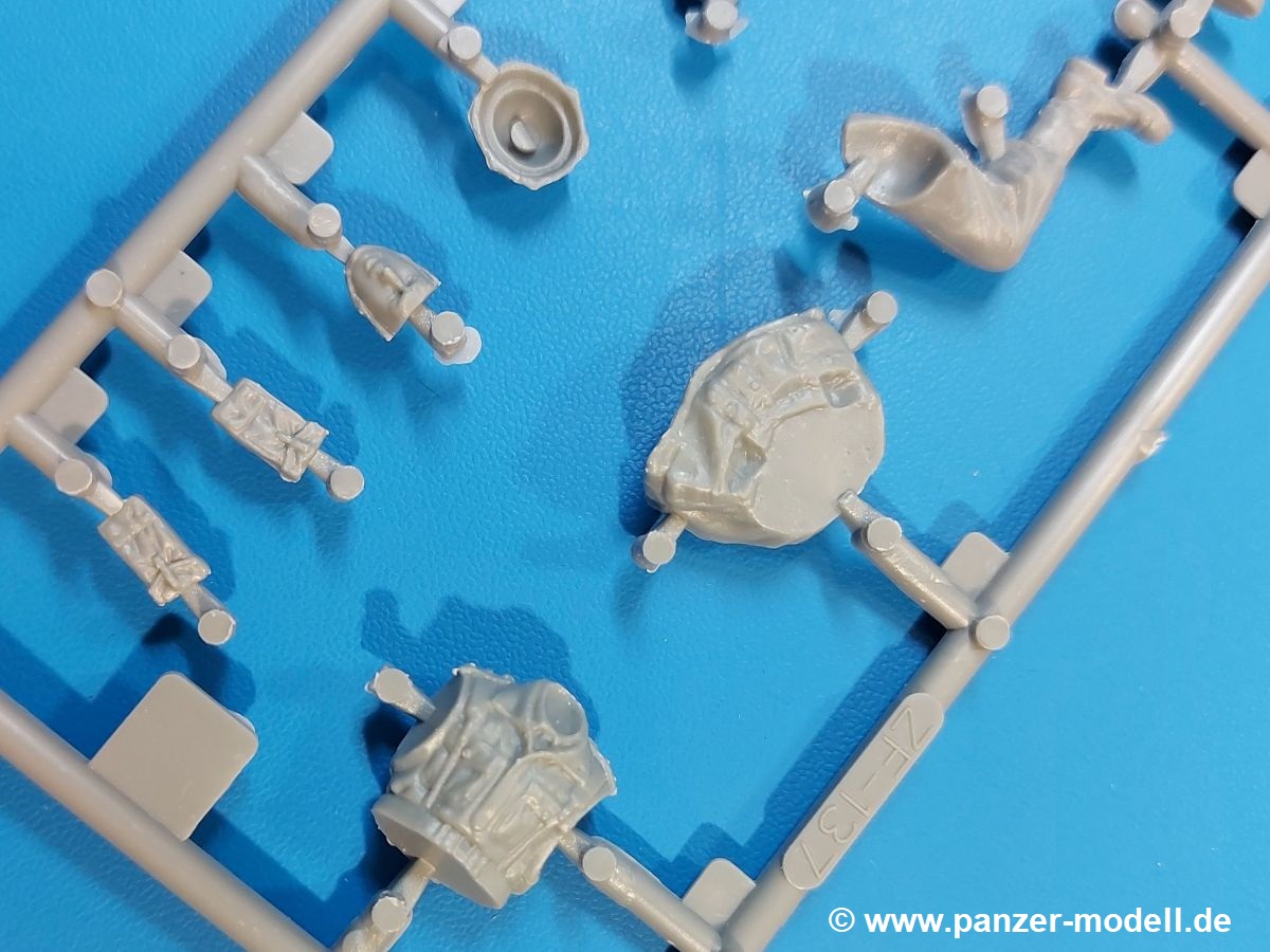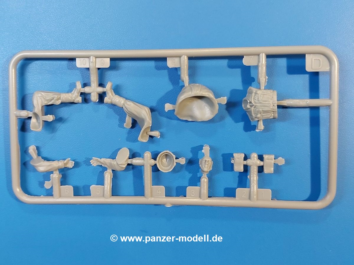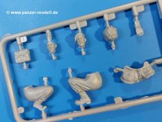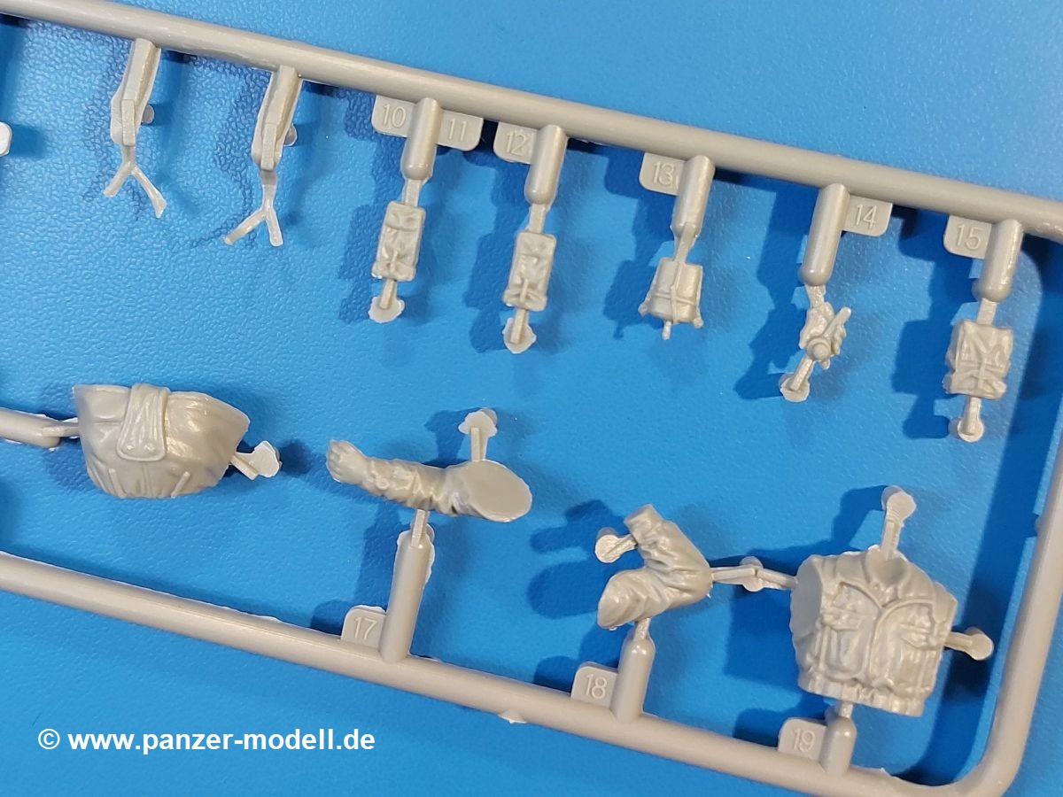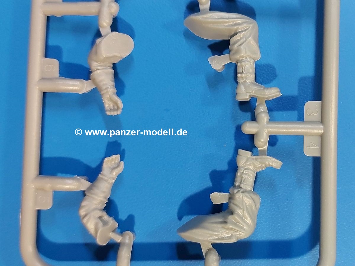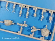 Die Jeeps können mit 5 Figuren besetzt werden 3 Aufklärer, 2 Fernmelder. Jede Figur ist in Arme, Beine, Hüfte, Rumpf und Kopf aufgeteilt. Dazu kommen Helm, Waffen, Magazintaschen und andere Ausrüstung je nach Soldat. Beim Funker kann man entweder den Kopf mit Barrett verwenden oder einen anderen, dem man noch den Stahlhelm aufsetzen muss. Ich bin mir nicht sicher, ob der Funker in seiner Auslegung auf den Rücksitz passt. Das muss der Bau dann zeigen. Der Truppführer der Aufklärer hält eine Karte in der Hand. Die Karte ist beschriftet mit „Operation Market Garden Die geplante Verteidigung von Arnheim“ Bronco Model ich habe Fragen…, obwohl die Beschriftung mit bloßen Augen kaum zu lesen ist! Alle Figuren haben schöne Gesichter. Faltenwurf und Detaillierung der Kleidung und Ausrüstung sind toll. Die Dienstgradabzeichen gibt es als Decals dazu. Es gibt Markierungen für 3 Fahrzeuge, aber ohne Angaben von Einheiten. Diese müsste man anhand der Markierungen selbst erforschen, aber Uniformen und „die Karte“ implizieren, dass es sich um Fahrzeuge während der Operation Market Garden im September 1944 handelt.