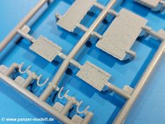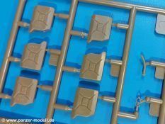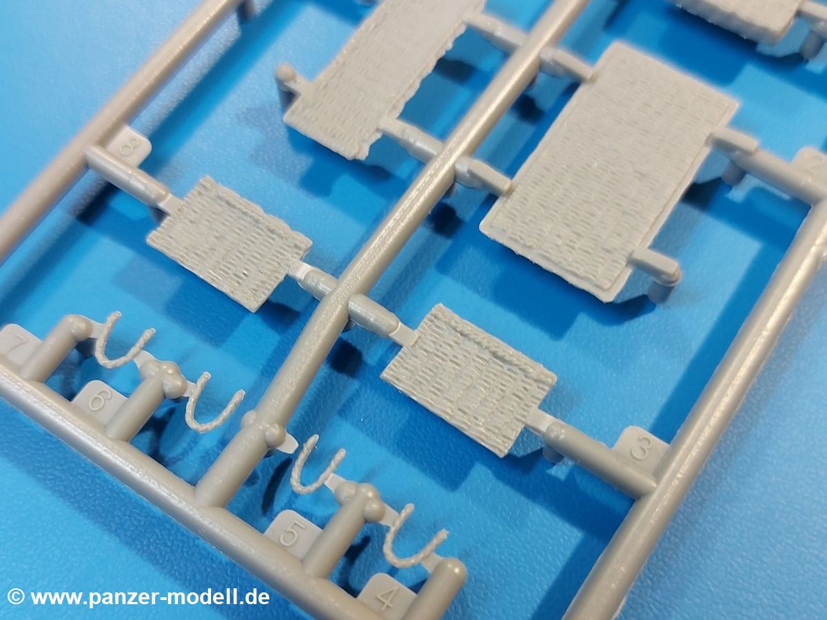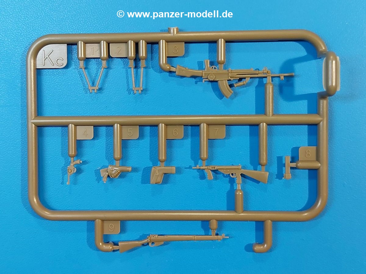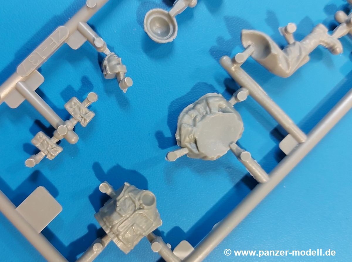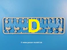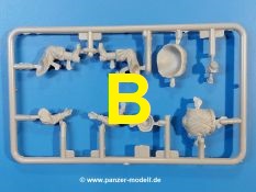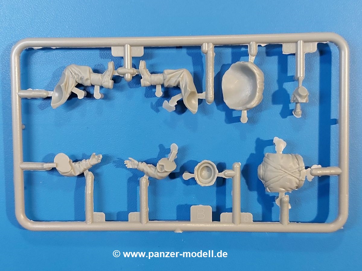 Die Jeeps können mit 5 Figuren besetzt werden 3 Aufklärer, 2 Fernmelder. Jede Figur ist in Arme, Beine, Hüfte, Rumpf und Kopf aufgeteilt. Dazu kommen Helm, Waffen, Magazintaschen und andere Ausrüstung je nach Soldat. Beim Funker kann man entweder den Kopf mit Barrett verwenden oder einen anderen, dem man noch den Stahlhelm aufsetzen muss. Ich bin mir nicht sicher, ob der Funker in seiner Auslegung auf den Rücksitz passt. Das muss der Bau dann zeigen. Der Truppführer der Aufklärer hält eine Karte in der Hand. Die Karte ist beschriftet mit „Operation Market Garden Die geplante Verteidigung von Arnheim“ Bronco Model ich habe Fragen…, obwohl die Beschriftung mit bloßen Augen kaum zu lesen ist! Alle Figuren haben schöne Gesichter. Faltenwurf und Detaillierung der Kleidung und Ausrüstung sind toll. Die Dienstgradabzeichen gibt es als Decals dazu. Es gibt Markierungen für 3 Fahrzeuge, aber ohne Angaben von Einheiten. Diese müsste man anhand der Markierungen selbst erforschen, aber Uniformen und „die Karte“ implizieren, dass es sich um Fahrzeuge während der Operation Market Garden im September 1944 handelt.