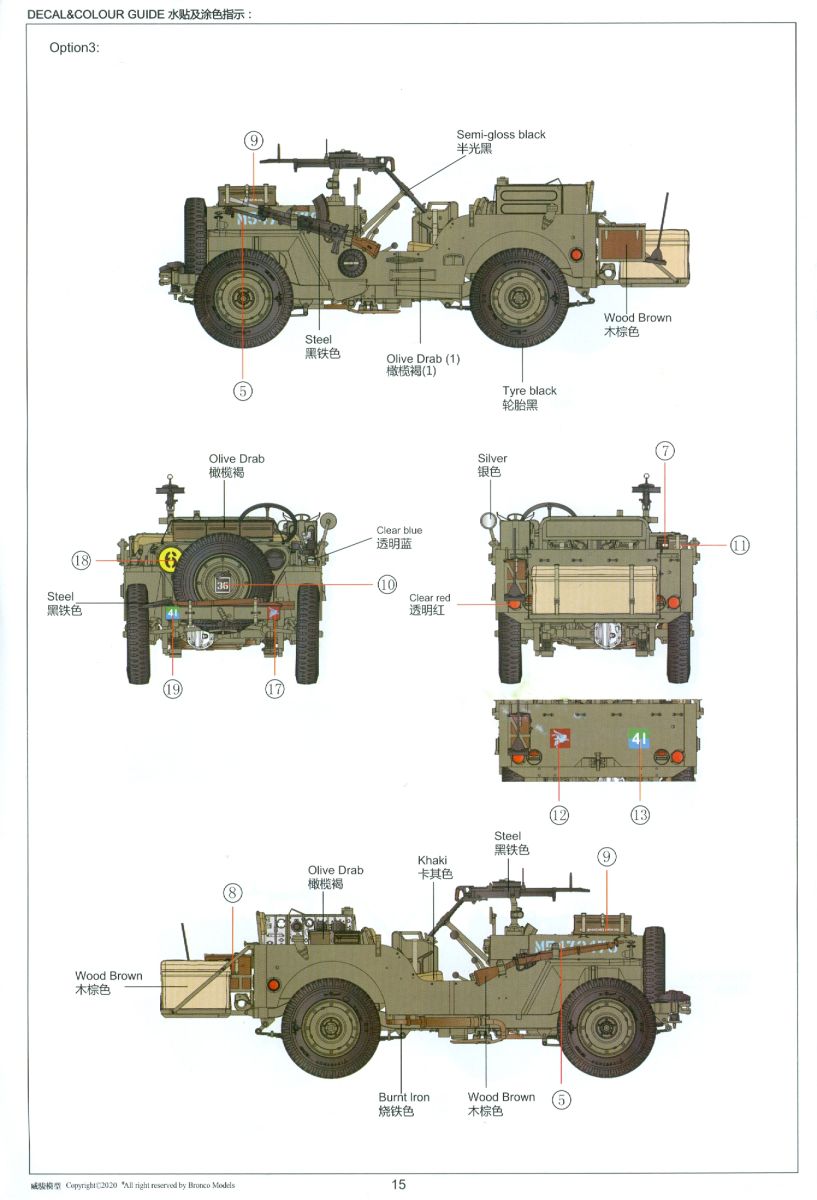 Die teils farbige Bauanleitung erklärt den Zusammenbau beider Fahrzeuge in 44 Schritten. Auf dem Deckblatt erscheint in Englisch und Chinesisch ein kurzer Abriss der Geschichte des Jeeps in britischem Einsatz. Farbangaben bei Verwendung von Mr. Hobby, Hobby Color, Humbrol und Tamiya Farben finden sich auf Seite 2. Die letzten 4 Seiten zeigen die Lackierung von Figuren und Fahrzeugen und Anbringung der Decals. Eine schöne Erweiterung der britischen Jeeps von Bronco. Man kann sie sich auch gut zusammen mit einem Horsa Segler vorstellen. Bronco typisch viele Kleinteile in Plastik und PE werden den ganzen Modellbauer fordern. Im deutschen Handel wird das Set wohl um die 48 - 55,- EUR kosten.